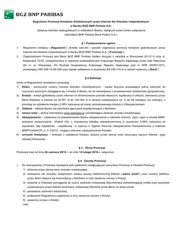 Regulamin Promocji Kredytów Gotówkowych przez Internet dla Klientów indywidualnych w Banku BGŻ BNP Paribas S.A. (dotyczy klientów obsługiwanych w oddziałach Banku, będących przed dniem połączenia oddziałami BNP Paribas Bank Polska S.A.) § 1 Postanowienia ogólne 1. Regulamin niniejszy („Regulamin”) określa warunki i sposób organizacji promocji kredytów gotówkowych przez Internet dla klientów indywidualnych w Banku BGŻ BNP Paribas S.A. („Promocja”). 2. Organizatorem Promocji jest Bank BGŻ BNP Paribas Spółka Akcyjne z siedzibą w Warszawie (01-211) przy ul. Kasprzaka 10/16, zarejestrowany w rejestrze przedsiębiorców Krajowego Rejestru Sądowego przez Sąd Rejonowy dla m. st. Warszawy, XII Wydział Gospodarczy Krajowego Rejestru Sądowego pod nr KRS 0000011571, posiadający NIP 526-10-08-546 oraz kapitał zakładowy w wysokości 84 238 318 zł w całości wpłacony („Bank”). § 2 Definicje Użyte w Regulaminie określenia oznaczają: 1) Klient - konsument (zwany również klientem indywidualnym) - osoba fizyczna posiadająca pełną zdolność do czynności prawnych ubiegająca się o Kredyt w Banku na cel niezwiązany z prowadzeniem działalności gospodarczej, 2) Kredyt – kredyt gotówkowy przez Internet na sfinansowanie potrzeb własnych, wypłacany w złotych, oferowany przez Bank Klientom w kwocie od 20 001 zł do 120 000 zł w okresie kredytowania od 6 do 84 miesięcy (co miesiąc), z prowizją za udzielenie kredytu 2,99% naliczaną od kwoty wnioskowanego kredytu z Ubezpieczeniem. 3) Oddział – oddział Banku lub placówka agencyjna współpracująca z Bankiem, 4) strona www – strona internetowa www.igotowka.pl umożliwiająca złożenie wniosku kredytowego, 5) Ubezpieczenie – zawierane za pośrednictwem Banku ubezpieczenie o zakresie ochrony: zgon, zgon w skutek NNW, poważne zachorowanie (Pakiet A3), z miesięczną składką ubezpieczeniową w wysokości 5,99% naliczaną od wysokości raty kapitałowo - odsetkowej w oparciu o Ogólne Warunki Ubezpieczenia Kredytobiorców o indeksie BNPP/CASHCPI_3_4.1/2015 , mogące stanowić zabezpieczenie Kredytu. 6) wniosek kredytowy – wniosek o udzielenie Kredytu złożony przez stronę www dotyczący danych Klienta i jego sytuacji finansowej. § 3. Okres Promocji Promocja trwa od dnia 26 czerwca 2015 r. do dnia 14 lutego 2016 r. (włącznie). § 4. Zasady Promocji 1. Do skorzystania z Promocji niezbędne jest spełnienie następujących warunków Promocji w Okresie Promocji: 1) złożenie przez stronę www wniosku kredytowego, 2) wskazanie we wniosku kredytowym adresu poczty elektronicznej Klienta („adres email”) oraz numeru telefonu, przez które odbywa się komunikacja z Bankiem w celu zawarcia umowy o Kredyt, 3) złożenie w Oddziale wymaganej do oceny zdolności kredytowej dokumentacji potwierdzającej źródła oraz wysokość uzyskiwanych przez Klienta dochodów, wskazanej Klientowi przez Bank na adres email, 4) posiadanie zdolności kredytowej, 5) podpisanie Regulaminu najpóźniej w dniu zawarcia umowy o Kredyt, 6) zawarcie umowy o Kredyt, oraz 7) zawarcie umowy Ubezpieczenia w Okresie Promocji w oparciu o Ogólne Warunki Ubezpieczenia Kredytobiorców o indeksie BNPP/CASHCPI_3_4.1/2015 stanowiącego zabezpieczenie kredytu oraz utrzymanie tego zabezpieczenia przez okres obowiązywania umowy o Kredyt, w celu uzyskania obniżonego oprocentowania Kredytu. 2. Klientowi, który spełni warunki Promocji, zawrze umowę Ubezpieczenia i utrzyma to zabezpieczenie przez okres obowiązywania umowy o Kredyt, Bank zastosuje promocyjną stałą stopę procentową Kredytu w wysokości od 5,90% do 9,40% przy czym wysokość promocyjnej stałej stopy procentowej jest uzależniona od wysokości kwoty wnioskowanej oraz długości okresu kredytowego. 3. W przypadku niespełnienia warunku Promocji polegającego na zawarciu i utrzymaniu umowy ubezpieczenia w całym okresie kredytowania, Kredyt oprocentowany jest według stałej stopy procentowej wynoszącej promocyjną stałą stopę procentową podwyższoną o 2 punkty procentowe od miesiąca następującego po zakończeniu ochrony ubezpieczeniowej. 4. Do złożenia wniosku kredytowego przez Internet konieczne jest spełnienie przez Klienta wymogów technicznych: dostępność na przeglądarkach: Chrome, Safari, Firefox, Internet Explorer od 8+,Opera, na urządzeniach mobilnych z systemem operacyjnym iOS, Android i Windows 8. Klient nie może dostarczać do Banku treści o charakterze bezprawnym. § 5 Postanowienia końcowe 1. Klient może skorzystać z więcej niż z jednego Kredytu na warunkach określonych w Regulaminie. 2. Reklamacje dotyczące Promocji mogą być składane w formie pisemnej na adres Banku z dopiskiem „Promocja kredytu gotówkowego przez Internet - Reklamacja” oraz pisemnie lub ustnie w Oddziale. Reklamacje będą rozpatrywane niezwłocznie, w terminie nie dłuższym niż 30 dni kalendarzowych od ich wpływu do Banku. 3. Administratorem danych osobowych Klienta w rozumieniu ustawy z dnia 29 sierpnia 1997 r. o ochronie danych osobowych (Dz.U. z 2002 r. Nr 101, poz. 926, z późn. zm.) jest Bank. 4. Podanie danych osobowych jest dobrowolne. Dane osobowe Klienta będą przetwarzane przez Bank w celu przeprowadzenia Promocji. Klientowi przysługuje prawo dostępu do treści swoich danych osobowych, ich poprawiania oraz żądania usunięcia.