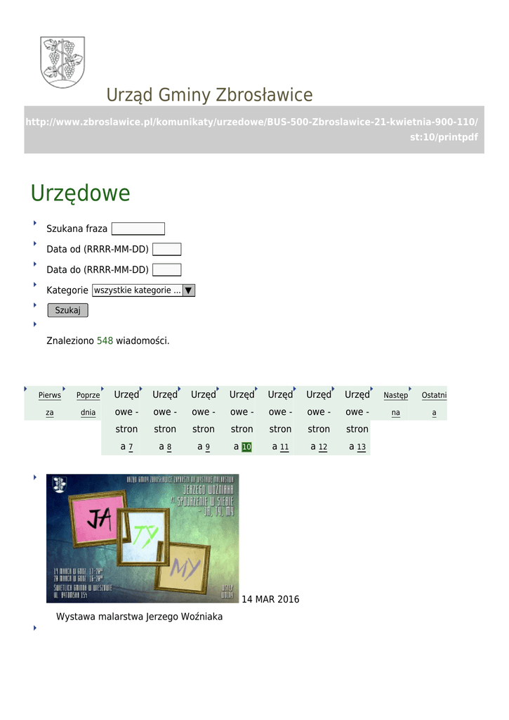 Urząd Gminy Zbrosławice http://www.zbroslawice.pl/komunikaty/urzedowe/BUS-500-Zbroslawice-21-kwietnia-900-110/ st:10/printpdf Urzędowe Szukana fraza Data od (RRRR-MM-DD) Data do (RRRR-MM-DD) Kategorie wszystkie kategorie ... ▼ Szukaj Znaleziono 548 wiadomości. Pierws Poprze Urzęd Urzęd Urzęd Urzęd Urzęd Urzęd Urzęd Następ Ostatni za dnia owe - owe - owe - owe - owe - owe - owe - na a stron stron stron stron stron stron stron a7 a8 a9 a a 11 a 12 a 13 10 14 MAR 2016 Wystawa malarstwa Jerzego Woźniaka 11 MAR 2016 Misterium Męki Pańskiej w Miedarach 11 MAR 2016 kategoria: Dzień Sołtysa Komunikaty urzędowe Najlepszego! LIZOŃ Mariola (Boniowice) MORAWSKI Wiesław (Czekanów) SUCHOSZEK Wanda (Jasiona) KOLANKOWSKI Andrzej (Jaśkowice) KAPEK Aneta (Kamieniec) GAWRON Maria (Karchowice) KAMIŃSKI Tomasz (Kopienica) TRAUTMANN Bernadeta (Księży Las) SZOŁTYSIK Piotr (Laryszów) KRAŚNIANKA Mirosław (Łubie) KRUSZONA Daniel (Łubki) KUPKA Herbert (Miedary) JANOSZKA Ludwik 09 MAR 2016 Ogłoszenie o trzecim przetargu na sprzedaż działki w Miedarach nr 477/1 kategoria: Komunikaty urzędowe WÓJT GMINY ZBROSŁAWICEogłaszaże w dniu 28 kwietnia 2016 r. o godzinie 1000 w Centrum Usług Publicznychw Zbrosławicach, przy ul. Oświęcimskiej 2a, rozpocznie się trzeci ustny przetarg nieograniczony na sprzedaż prawa własności nieruchomości gruntowej zabudowanej położonej w obrębie Miedary (k.m. 2 Kopa.) określonej następującym numerem działki: działka nr 477/1 o pow. 0,2813 ha; KW nr GL1T/00042811/3Cena wywoławcza 09 MAR 2016 Ogłoszenie o trzecim przetargu na sprzedaż naczepy do przewozu koni kategoria: Komunikaty urzędowe Wójt Gminy Zbrosławiceogłasza trzeci przetarg nieograniczony ofertowy na:„sprzedaż składnika rzeczowego majątku ruchomego" 1. Gmina Zbrosławice z siedzibą w Zbrosławicach przy ul. Oświęcimskiej 2. 2. Miejsce i termin przeprowadzania przetargu: 8 kwietnia 2016r. o godz. 1000 w Centrum Usług Publicznych w Zbrosławicach ul. Oświęcimska 2a. 3. Przetarg na niżej wymieniony składnik majątku ruchomego:Naczepa do przewozu koni 09 MAR 2016 NABÓR WNIOSKÓW O PRZYZNANIE POMOCY NA MODERNIZACJĘ GOSPODARSTW ROLNYCH kategoria: Komunikaty urzędowe Regionalna Fundacja Pomocy Niewidomym informuje, że z dniem 1 marca br. rozpoczęła się rekrutacja dzieci i młodzieży do Specjalnego Ośrodka Szkolno–Wychowawczego: Przedszkola Specjalnego, Szkoły Podstawowej Specjalnej, Gimnazjum Specjalnego w Ziemięcicach przy ul. Mikulczyckiej 120. Do placówki przyjmowane są dzieci i młodzież do 25 roku życia:- niewidome i słabowidzące,- z niepełnosprawnością ruchową, w tym afazją,- z 08 MAR 2016 kategoria: Ogłoszenie Komunikaty urzędowe Wójt Gminy Zbrosławice informuje, że został wywieszony na okres 21 dni, tj. od dnia 04.03.2016 r. do dnia 25.03.2016 r. na tablicy ogłoszeń Urzędu Gminy w Zbrosławicach ul. Oświęcimskiej 2, wykaz nieruchomości przeznaczonych do dzierżawy: działka nr 462/91 o pow. 0,5432 ha (k. m. 2 obręb Zbrosławice), działka nr 92 o pow. 0,1280 ha (k. m. 2 obręb Zbrosławice), działka nr 469/58 o pow. 0,7284 ha (k. m. 2 obręb 08 MAR 2016 Informacja ZGKiM - brak wody w Wieszowie kategoria: Komunikaty urzędowe Zakład Gospodarki Komunalnej i Mieszkaniowej w Zbrosławicach zawiadamia, że w dniu 09.03.2016 w godzinach od 9:00 do 18:00 w Wieszowie przy ulicach Wolności i Górnej wystąpi przerwa w dostawie wody z powodu prac na sieci wodociągowej.W wyniku wykonywanych prac mogą wystąpić zabrudzenia wody spowodowane zaburzeniami przepływów na sieci.Przepraszamy za utrudnienia. 03 MAR 2016 Ogłoszenie kategoria: Komunikaty urzędowe O g ł o s z e n i e Wójt Gminy Zbrosławice informuje, że został wywieszony na okres 21 dni tj. od 1 marca 2016 r. do 22 marca 2016 r. na tablicy ogłoszeń Urzędu Gminy Zbrosławice przy ul. Oświęcimskiej 2, wykaz nieruchomości przeznaczonych do sprzedaży.Wykazem objęto nieruchomość gruntową niezabudowaną położoną w obrębie Kopienica (k.m. 1 dod. 2) określoną nr działek 1083/317 i 1084/317 o pow. 0,1428 ha, zapisaną w 03 MAR 2016 UWAGA ROLNIKU! kategoria: Komunikaty urzędowe Informacja w sprawie terminu składania wniosków o przyznanie płatności bezpośrednich oraz płatności obszarowych w 2016 r. Agencji Restrukturyzacji i Modernizacji Rolnictwa od 15 marca 2016 r. do 15 maja 2016 r. rozpocznie przyjmowanie wniosków o przyznanie płatności bezpośrednich oraz płatności obszarowych za bieżący rok. Wypełnione wnioski można składać osobiście w Biurze Powiatowym ARiMR w Nakle Śląskim przy ul. Pierws Poprze Urzęd Urzęd Urzęd Urzęd Urzęd Urzęd Urzęd Następ Ostatni za dnia owe - owe - owe - owe - owe - owe - owe - na a stron stron stron stron stron stron stron a7 a8 a9 a a 11 a 12 a 13 10