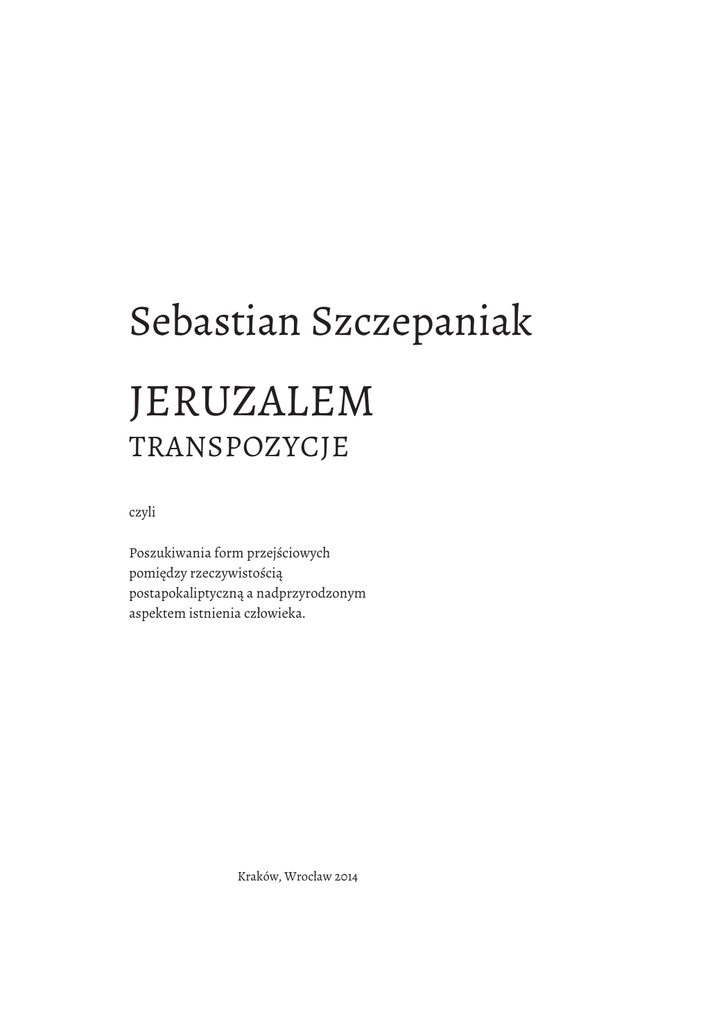 Sebastian Szczepaniak jeruzalem transpozycje czyli Poszukiwania form przejściowych pomiędzy rzeczywistością postapokaliptyczną a nadprzyrodzonym aspektem istnienia człowieka. Kraków, Wrocław 2014 Seeking the origin, your mind is wandering. Zhuang Zi (...) Come, my friends, �Tis not too late to seek a newer world. Push off, and sitting well in order smite The sounding furrows; for my purpose holds To sail beyond the sunset, and the baths Of all the western stars, until I die. It may be that the gulfs will wash us down; It may be we shall touch the Happy Isles, And see the great Achilles, whom we knew. Alfred, Lord Tennyson, Ulysses, 56-64 I ujrzałem niebo nowe i ziemię nową, bo pierwsze niebo i pierwsza ziemia przeminęły, i morza już nie ma. I Miasto Święte – Jeruzalem Nowe ujrzałem zstępujące z nieba od Boga1. [Ap 21, 1-2] Najbardziej interesuje mnie ten moment, kiedy nad postapokaliptycznym pejzażem nastaje Nowa Rzeczywistość, wyrażona w symbolicznej wizji zstępującego miasta-wyspy, Nowego Jeruzalem Niebiańskiego; kiedy eschatologiczny motyw miasta w chmurach staje się niezaprzeczalnym faktem i nadzieją po ogólnoświatowej klęsce. Sebastian Szczepaniak Spis treści Grafiki Nadziei / 7 We wstępie. Prolog / 9 1. O fenomenie apokalipsy. Pojęcie apokalipsy we współczesnej kulturze / 10 2. Filmowa „katastrofa” / 11 3. Wczoraj i dziś. Pejzaże postapokaliptyczne w twórczości Zdzisława Beksińskiego i Marca Rothki / 12 4. Tropem mistrzów / 14 5. Wokół cytatu z Ap 21, 1-2 / 17 6. Poszukiwania lepszego świata / 18 Zamiast zakończenia. Epilog / 19 Cykl plansz graficznych / 21 Aneks / 38 Słów parę o wyłonieniu się i powtórnych narodzinach / 39 Przypisy / 46 Literatura / 47 Spis ilustracji / 47 Wykaz źródeł internetowych / 47 Grafiki Nadziei No i masz babo Szczepaniakową Apokalipsę – rzekła, po czym odwróciwszy się na pięcie, wskoczyła w dno oka autora. ałam się prądów, które mogą mnie porwać, gdyż w pierwszym odczuciu zdawały się one wołać echem groźnym i niepokojącym z wnętrzności ziemi. Trzymałam na dystans nie tylko kreskę i plamę, ale i źrenice, które niejednokrotnie w swym wyrazie opętane były szaleństwem aktu twórczego. Odwaga matką poznania. Jestem. Badam. Patrzę i widzę Nowe Jeruzalem, natchniona zostałam nadzieją, a i nawet monochromatyczna plama uraczyła mnie swym istnieniem. Zaszczycona sposobnością, jaką jest wydanie niniejszego albumu, zapraszam w imieniu własnym, autora oraz partnerskich przyjaciół, czyliż Kontaktu. Przestrzeni Ruchu i Tańca oraz Wolnego Słuchacza Rzeczywistości do poszukiwania form przejściowych pomiędzy rzeczywistością postapokaliptyczną, a nadprzyrodzonym aspektem istnienia człowieka w cyklu grafik Sebastiana Szczepaniaka. Dominika Zarecka 7 We wstępie. Prolog Objawienie Jezusa Chrystusa, które dał mu Bóg, aby ukazać swym sługom, co musi stać się niebawem, i co On, wysławszy swojego anioła, oznajmił przez niego za pomocą znaków słudze swojemu, Janowi. [Ap 1, 1] akotwiczeni w czasach, kiedy tematyka apokaliptyczna ponownie się zaktualizowała (wystarczy wspomnieć chociażby liczne filmy katastroficzne powstałe w ostatniej dekadzie lub wyjątkowy urodzaj na profetyków wieszczących „kolejne” daty końca naszych czasów), jesteśmy świadkami gigantycznych zmian cyfryzacyjno-technologicznych, społecznych i kulturowych. To właśnie na naszych oczach rodzą się wszelakie gadżety normujące i standaryzujące ludzkie życie, wybuchają konflikty destabilizujące gospodarkę oraz obserwuje się akcelerację gwałtownych zjawisk pogodowych. Czy świat powoli zmierza do swojego końca, symbolicznie opisanego w Apokalipsie św. Jana Apostoła? Teka z cyklem plansz graficznych powstała pod wpływem podwójnego impulsu. Pierwszy z nich stanowi motto przewodnie całego projektu. I ujrzałem niebo nowe i ziemię nową, bo pierwsze niebo i pierwsza ziemia przeminęły, i morza już nie ma. I Miasto Święte – Jeruzalem Nowe ujrzałem zstępujące z nieba od Boga. [Ap 21,1-2] – notuje w Księdze Apokalipsy Św. Jan Apostoł. Drugi impuls stanowi natomiast lektura poezji Zbigniewa Herberta. Odnajduję w niej niepokój oraz troskę o rzeczy, które dokonawszy się po materialistyczno-cielesnym prze- istoczeniu człowieka, jakim jest śmierć, nie zawsze napawają nas radością i optymizmem. Poeta w swoich utworach, takich jak U wrót doliny, czy Sprawozdanie z Raju, proponuje alternatywną wersję obiecanego w Biblii zbawienia ogółu ludzkości u progu końca czasów. Inspirując się powyższym cytatem od dłuższego czasu, doszedłem do wniosku, iż najbardziej interesuje mnie ten moment, kiedy nad postapokaliptycznym pejzażem nastaje Nowa Rzeczywistość, wyrażona w symbolicznej wizji zstępującego miasta-wyspy, Nowego Jeruzalem Niebiańskiego; kiedy eschatologiczny motyw miasta w chmurach staje się niezaprzeczalnym faktem i nadzieją po ogólnoświatowej klęsce. Zakładając, iż naszym życiem rządzi indeterminizm, to wszystko, czego by się nie dotknąć jest dziełem przypadku, a to, że istniejemy, nie znaczy nic. Jeśli to natomiast determinizm ma nieustający wpływ na tworzenie się rzeczywistości człowieka to z kolei wszystko wydaje się być starannie i odgórnie zaplanowane. Czy więc w ferworze codziennego życia współczesny człowiek, zagubiwszy świadomość swojej pozamaterialnej tożsamości, między bajki wkłada opowieści o Jeruzalem 9 końca czasów, a sprawy eschatologiczne ogląda jedynie przez pryzmat mitu i katastroficznego kina? Czy też może oczekuje spełnienia solennie zaplanowanej obietnicy, zstąpienia nie- biańskiego miasta, które wprowadzi go w alternatywną, wieczystą rzeczywistość istnienia? Na te pytania każdy z nas powinien odpowiedzieć sobie sam. 1. o fenomenie apokalipsy. pojęcie apokalipsy we współczesnej kulturze W dzień końca świata (...) Pijak zasypia na brzegu trawnik