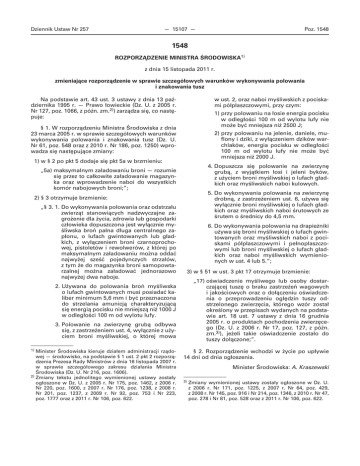 Dziennik Ustaw Nr 257 — 15107 — Poz. 1548 1548 ROZPORZĄDZENIE MINISTRA ŚRODOWISKA1) z dnia 15 listopada 2011 r. zmieniające rozporządzenie w sprawie szczegółowych warunków wykonywania polowania i znakowania tusz Na podstawie art. 43 ust. 3 ustawy z dnia 13 października 1995 r. — Prawo łowieckie (Dz. U. z 2005 r. Nr 127, poz. 1066, z późn. zm.2)) zarządza się, co następuje: w ust. 2, oraz naboi myśliwskich z pociskami półpłaszczowymi, przy czym: 1) przy polowaniu na łosie energia pocisku w odległości 100 m od wylotu lufy nie może być mniejsza niż 2500 J; § 1. W rozporządzeniu Ministra Środowiska z dnia 23 marca 2005 r. w sprawie szczegółowych warunków wykonywania polowania i znakowania tusz (Dz. U. Nr 61, poz. 548 oraz z 2010 r. Nr 186, poz. 1250) wprowadza się następujące zmiany: 2) przy polowaniu na jelenie, daniele, muflony i dziki, z wyłączeniem dzików warchlaków, energia pocisku w odległości 100 m od wylotu lufy nie może być mniejsza niż 2000 J. 1) w § 2 po pkt 5 dodaje się pkt 5a w brzmieniu: 4. Dopuszcza się polowanie na zwierzynę grubą, z wyjątkiem łosi i jeleni byków, z użyciem broni myśliwskiej o lufach gładkich oraz myśliwskich naboi kulowych. „5a) maksymalnym załadowaniu broni — rozumie się przez to całkowite załadowanie magazynka oraz wprowadzenie naboi do wszystkich komór nabojowych broni;”; 5. Do wykonywania polowania na zwierzynę drobną, z zastrzeżeniem ust. 6, używa się wyłącznie broni myśliwskiej o lufach gładkich oraz myśliwskich naboi śrutowych ze śrutem o średnicy do 4,5 mm. 2) § 3 otrzymuje brzmienie: „§ 3. 1. Do wykonywania polowania oraz odstrzału zwierząt stanowiących nadzwyczajne zagrożenie dla życia, zdrowia lub gospodarki człowieka dopuszczona jest wyłącznie myśliwska broń palna długa centralnego zapłonu, o lufach gwintowanych lub gładkich, z wyłączeniem broni czarnoprochowej, pistoletów i rewolwerów, z której po maksymalnym załadowaniu można oddać najwyżej sześć pojedynczych strzałów, z tym że do magazynka broni samopowtarzalnej można załadować jednorazowo najwyżej dwa naboje. 6. Do wykonywania polowania na drapieżniki używa się broni myśliwskiej o lufach gwintowanych oraz myśliwskich naboi z pociskami półpłaszczowymi i pełnopłaszczowymi lub broni myśliwskiej o lufach gładkich oraz naboi myśliwskich wymienionych w ust. 4 lub 5.”; 3) w § 51 w ust. 3 pkt 17 otrzymuje brzmienie: „17) oświadczenie myśliwego lub osoby dostarczającej tuszę o braku zastrzeżeń wagowych i jakościowych oraz o dołączeniu oświadczenia o przeprowadzeniu oględzin tuszy odstrzelonego zwierzęcia, którego wzór został określony w przepisach wydanych na podstawie art. 18 ust. 7 ustawy z dnia 16 grudnia 2005 r. o produktach pochodzenia zwierzęcego (Dz. U. z 2006 r. Nr 17, poz. 127, z późn. zm.3)), jeżeli takie oświadczenie zostało do tuszy dołączone;”. 2. Używana do polowania broń myśliwska o lufach gwintowanych musi posiadać kaliber minimum 5,6 mm i być przeznaczona do strzelania amunicją charakteryzującą się energią pocisku nie mniejszą niż 1000 J w odległości 100 m od wylotu lufy. 3. Polowanie na zwierzynę grubą odbywa się, z zastrzeżeniem ust. 4, wyłącznie z użyciem broni myśliwskiej, o której mowa 1) Minister Środowiska kieruje działem administracji rządowej — środowisko, na podstawie § 1 ust. 2 pkt 2 rozporządzenia Prezesa Rady Ministrów z dnia 16 listopada 2007 r. w sprawie szczegółowego zakresu działania Ministra Środowiska (Dz. U. Nr 216, poz. 1606). 2) Zmiany tekstu jednolitego wymienionej ustawy zostały ogłoszone w Dz. U. z 2005 r. Nr 175, poz. 1462, z 2006 r. Nr 220, poz. 1600, z 2007 r. Nr 176, poz. 1238, z 2008 r. Nr 201, poz. 1237, z 2009 r. Nr 92, poz. 753 i Nr 223, poz. 1777 oraz z 2011 r. Nr 106, poz. 622. § 2. Rozporządzenie wchodzi w życie po upływie 14 dni od dnia ogłoszenia. Minister Środowiska: A. Kraszewski 3) Zmiany wymienionej ustawy zostały ogłoszone w Dz. U. z 2006 r. Nr 171, poz. 1225, z 2007 r. Nr 64, poz. 429, z 2008 r. Nr 145, poz. 916 i Nr 214, poz. 1346, z 2010 r. Nr 47, poz. 278 i Nr 81, poz. 528 oraz z 2011 r. Nr 106, poz. 622.