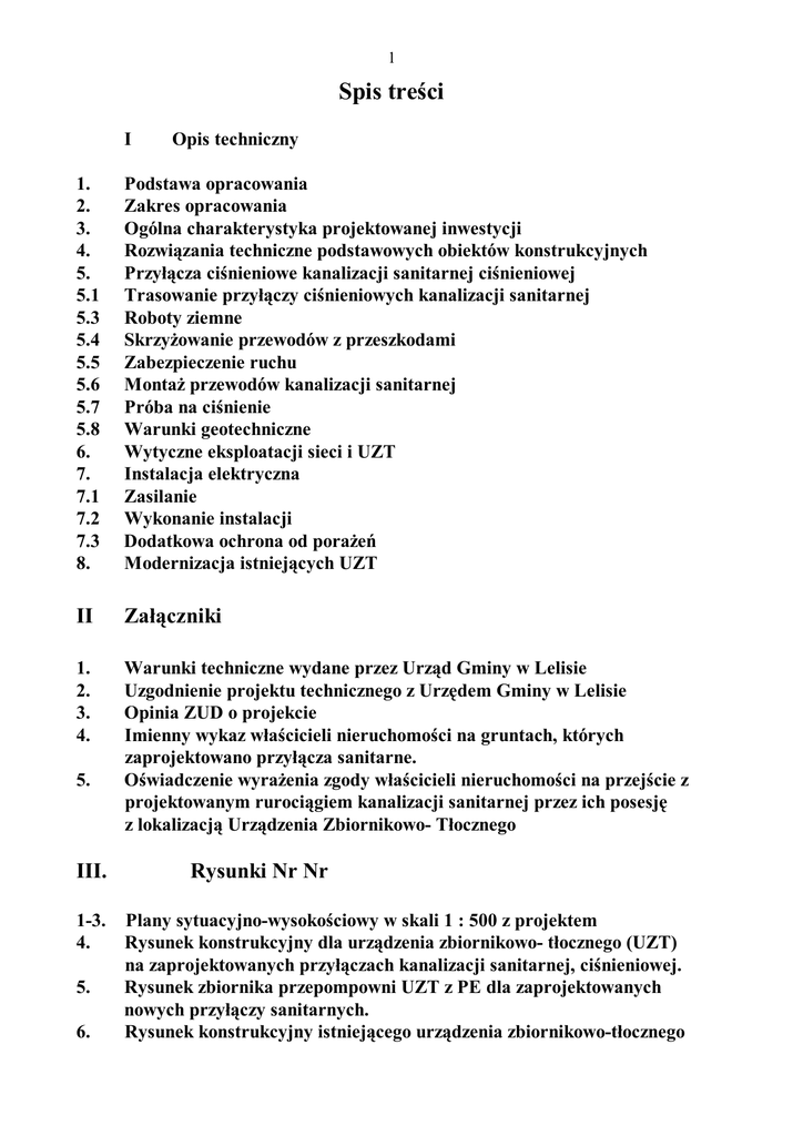 1 Spis treści I Opis techniczny 1. 2. 3. 4. 5. 5.1 5.3 5.4 5.5 5.6 5.7 5.8 6. 7. 7.1 7.2 7.3 8. Podstawa opracowania Zakres opracowania Ogólna charakterystyka projektowanej inwestycji Rozwiązania techniczne podstawowych obiektów konstrukcyjnych Przyłącza ciśnieniowe kanalizacji sanitarnej ciśnieniowej Trasowanie przyłączy ciśnieniowych kanalizacji sanitarnej Roboty ziemne Skrzyżowanie przewodów z przeszkodami Zabezpieczenie ruchu Montaż przewodów kanalizacji sanitarnej Próba na ciśnienie Warunki geotechniczne Wytyczne eksploatacji sieci i UZT Instalacja elektryczna Zasilanie Wykonanie instalacji Dodatkowa ochrona od porażeń Modernizacja istniejących UZT II Załączniki 1. 2. 3. 4. Warunki techniczne wydane przez Urząd Gminy w Lelisie Uzgodnienie projektu technicznego z Urzędem Gminy w Lelisie Opinia ZUD o projekcie Imienny wykaz właścicieli nieruchomości na gruntach, których zaprojektowano przyłącza sanitarne. Oświadczenie wyrażenia zgody właścicieli nieruchomości na przejście z projektowanym rurociągiem kanalizacji sanitarnej przez ich posesję z lokalizacją Urządzenia Zbiornikowo- Tłocznego 5. III. Rysunki Nr Nr 1-3. Plany sytuacyjno-wysokościowy w skali 1 : 500 z projektem 4. Rysunek konstrukcyjny dla urządzenia zbiornikowo- tłocznego (UZT) na zaprojektowanych przyłączach kanalizacji sanitarnej, ciśnieniowej. 5. Rysunek zbiornika przepompowni UZT z PE dla zaprojektowanych nowych przyłączy sanitarnych. 6. Rysunek konstrukcyjny istniejącego urządzenia zbiornikowo-tłocznego 2 7. (UZT), przewidzianego do projektowanej modernizacji istniejących urządzeń technologicznych wraz z pompą do ścieków. Schemat węzłów dla zaprojektowanych przyłączy sanitarnych. 3 Opis techniczny do projektu „Modernizacji kanalizacji sanitarnej ciśnieniowej w msc Lelis- II etap”. 1. 1.1. 1.2. 1.3. 2. Podstawa opracowania Z aktualizowane mapy sytuacyjno- wysokościowe w skali 1: 500 z terenu objętego projektem przyłączy sanitarnych Istniejący projekt kanalizacji sanitarnej ciśnieniowej w Lelisie. Warunki Techniczne na opracowanie projektu z U.G. Lelis Zakres opracowania Opracowanie obejmuje rozbudowę istniejącej kanalizacji sanitarnej- ciśnieniowej dla 3-ech budynków jednorodzinnych oraz modernizację 46-ciu istniejących przepompowni przydomowych UZT w mc. Lelis. Połączenia budynków wykonano w/g wykazu dostarczonego przez Urząd Gminy na zaprojektowanie przyłącza ciśnieniowe kanalizacji sanitarnej oraz zebranych deklaracji od mieszkańców. Zakres niniejszego opracowania obejmuje zaprojektowanie przyłączy sanitarnych ciśnieniowych z zaprojektowanymi Urządzeniami Zbiornikowo- Tłocznymi (UZT) na zakończenie każdego przyłącza, po jednym na każdej posesji z włączeniem ich poprzez trójnik zaciskowy z PE typu POLYRAC do istniejących przewodów kanalizacji sanitarnej ciśnieniowej: jedno przyłącze ciśnieniowe do istniejącego rurociągu ks. z PE Øz 63 w ulicy Przemysłowej, drugie przyłącze sanitarne z włączeniem do istniejącego przewodu sanitarnego z PCW Øz 110 mm w ulicy Szkolnej oraz trzecie przyłącze sanitarne z włączeniem do istniejącego przewodu ciśnieniowej kanalizacji sanitarnej z PE Øz 63 mm na posesji Nr 576/5, wszystkie w/w przyłącza w msc. Lelis. Łącznie zaprojektowano przyłącza dla 3-ech domów jednorodzinnych uzbrojonych każdy w jedno urządzenie zbiornikowo-tłoczne, których włączenie zaprojektowano do istniejącej sieci kanalizacji sanitarnej ciśnieniowej w ulicy poprzez przyłącze z PE Øz 50- 40 mm na ogólną długość 210 mb. Zestawienie długości zaprojektowanych przyłączy ciśnieniowych kanalizacji sanitarnej z przejściami pod przeszkodami zestawiono w załączonej do projektu tabeli Nr1. Modernizacja 46-ciu istniejących przepompowniach przydomowych UZT w istniejącej sieci kanalizacji sanitarnej, ciśnieniowej polega na wymianie istniejącej pompy Presskan-1.1/4-NP.-165-01 w obudowie stalowej wraz z istniejącą instalacją technologiczną wykonaną z rur i kształtek stalowych czarnych na nowoczesną pompę wrzecionową, wyporową do ścieków (5/4” KADOR) w korpusie ze stali nierdzewnej ( dotyczy 45 UZT) z kompletną instalacją technologiczną wykonaną z materiałów- polipropylen PP wg załączonego do projektu rysunku konstrukcyjnego z zachowaniem istniejącego betonowego zbiornika UZT. Wraz z nową pompą wymianie podlega istniejąca instalacja zasilająco-sterownicza (dostarczana z pompą) łącznie ze skrzynką sterowniczą, którą należy zainstalować na zewnętrznej ścianie budynku od strony UZT. Wymianie podlega istniejąca instalacja elektryczna zasilająca skrzynkę sterowniczą dla modernizowanej przepompowni przydomowej (UZT) polegająca na demontażu istniejącego przewodu nadtynkowego z montażem nowego przewodu typu YDY 5 x 2,5 mm2 z istniejącej instalacji elektrycznej budynku o przyjętej średnio długości 15 mb dla jednej UZT. Odłączenie istniejącej instalacji technologicznej UZT należy rozpocząć od złączki przejściowej z PE Øz 40 mm oznaczonej na rysunku pod pozycją 11, po zewnętrznej stronie zbiornika UZT łączącej instalację technologiczną pompowni ścieków z zewnętrzną siecią kanalizacji ciśnieniowej z PE Øz 40 mm. 4 W 46-ciu modernizowanych przepompowniach UZT wskazanych przez Inwestora tj Urząd Gminy w Lelisie- 45 stanowi modernizacja z jednoczesną wymianą istniejącej pompy do ścieków na pompę typu KADOR 5/4 z instalacją 3-fazową i na taką instalację należy zainstalować pompy KADOR . 3. Ogólna charakterystyka projektowanej inwestycji Zgodnie z koncepcją oraz wykonaną, istniejącą kanalizacją sanitarną-ciśnieniową w mc. Lelis projektuje się przyłącza sanitarne w systemie ciśnieniowym z indywidualnymi urządzeniami zbiornikowo-tłocznymi dla każdej posesji. Przyłącza sanitarne ciśnieniowe w niniejszym opracowaniu projektuje się w systemie wysokociśnieniowym opartym na pompach wrzecionowych