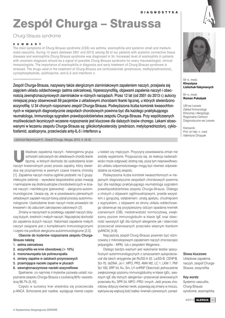 D I A G N O S T Y K A Zespół Churga – Straussa Churg-Strauss syndrome S U M M A R Y The main symptoms of Churg-Strauss syndrome (CSS) are asthma, eosinophilia and systemic small and mediumsized vasculitis. During 12 years (between 2001 and 2013) among 59 of our patients with systemic connective tissue diseases and eosinophilia Churg-Strauss syndrome was diagnosed in 34. Increased level of eosinophils in patients with uncertain diagnosis should be a signal of possible Churg-Strauss syndrome for every rheumatologist, clinical immunologists. The importance of eosinophilia in diagnosis and early treatment of Churg-Strauss syndrome is stressed. The drugs used in the treatment of Churg-Strauss are corticosteroids (prednisone, methylprednisolone), cyclophosphamide, azathioprine, anti-IL-5 and interferon α ............................... Zespół Churga-Strauss, nazywany także alergicznym ziarniniakowym zapaleniem naczyń, przejawia się zajęciem układu oddechowego (astma oskrzelowa), hipereozynofilią, objawami zapalenia naczyń i obecnością zewnątrznaczyniowych ziarniniaków w różnych narządach. Przez 12 lat (od 2001 do 2013 r.) autorzy niniejszej pracy obserwowali 59 pacjentów z układowymi chorobami tkanki łącznej, u których stwierdzono eozynofilię. U 34 chorych rozpoznano zespół Churga-Strauss. Podwyższona liczba komórek kwasochłonnych w niejasnych diagnostycznie zespołach chorobowych powinna być dla każdego praktykującego reumatologa, immunologa sygnałem prawdopodobieństwa zespołu Churga-Strauss. Przy współczesnych możliwościach leczniczych wczesne rozpoznanie jest kluczowe dla dalszych losów chorego. Lekami stosowanymi w leczeniu zespołu Churga-Strauss są: glikokortykosteroidy (prednizon, metyloprednizolon), cyklofosfamid, azatiopryna, przeciwciała anty-IL-5 i interferon α Dr n. med. Khrystyna Lishchuk-Yakymovych Dr n. med. Roman Pukalyak UM we Lwowie Zakład Immunologii Klinicznej i Alergologii, Regionalne Centrum Diagnostyczne we Lwowie Kierownik: Prof. dr hab. n. med. Valentyna Chopyak Lishchuk-Yakymovych K.: Zespół Churga. Alergia, 2013, 4: 33-35 U kładowe zapalenia naczyń– heterogenna grupa schorzeń zaliczanych do układowych chorób tkanki łącznej, w których dochodzi do uszkodzenia ścian naczyń krwionośnych przez proces zapalny, który stwierdza się przynajmniej w pewnym czasie trwania choroby [1]. Zapalenia naczyń można ogólnie podzielić na 2 grupy: infekcyjne (wtórne) – wywołane bezpośrednio przez inwazję i namnażanie się drobnoustrojów chorobotwórczych w ścianie naczyń i nieinfekcyjne (pierwotne) – alergiczno-autoimmunologiczne. Uważa się, że w powstawaniu pierwotnych układowych zapaleń naczyń biorą udział procesy autoimmunologiczne. Uszkodzenie ścian naczyń może prowadzić do krwawień i do zaburzeń zakrzepowo-zatorowych [2]. Zmiany w naczyniach w przebiegu zapaleń naczyń dotyczą dużych, średnich i małych naczyń. Najczęściej dochodzi do zapalenia dużych naczyń. Natomiast zapalenie małych naczyń związane jest z kompleksami immunologicznymi i często ma podłoże alergiczno-autoimmunologiczne [2,3]. Obecnie do kryteriów rozpoznania zespołu ChurgaStrauss należą: 1. astma oskrzelowa 2. eozynofilia we krwi obwodowej (> 10%) 3. mononeuropatia lub polineuropatia 4. zmiany zapalne w zatokach przynosowych 5. przemijające nacieki zapalne w płucach 6. wewnątrznaczyniowe nacieki eozynofilowe Spełnienie, co najmniej 4 kryteriów pozwala ustalić rozpoznanie zespołu Churga-Strauss z czułością 85% i swoistością 99,7% [5,10]. Często w surowicy krwi stwierdza się przeciwciała p-ANCA. Schorzenie jest rzadkie, występuje równie często u kobiet czy mężczyzn. Przyczyny powstawania zmian nie zostały wyjaśnione. Przypuszcza się, że reakcja nadwrażliwości może odgrywać istotną rolę, poza tym nieprawidłowości układu odpornościowego mogą być również odpowiedzialne za rozwój zespołu. Podwyższona liczba komórek kwasochłonnych w niejasnych diagnostycznie zespołach chorobowych powinna być dla każdego praktykującego reumatologa sygnałem prawdopodobieństwa zespołu Churga-Strauss. Dlatego u chorych z objawami ogólnoustrojowymi, przede wszystkim z gorączką, osłabieniem, utratą apetytu, chudnięciem z wypryskiem, z objawami ze strony układu oddechowego obserwuje się przyspieszony odczyn opadania krwinek czerwonych (OB), niedokrwistość normocytową, zwiększony poziom immunoglobulin w klasie IgE oraz obecność swoistych IgE dla różnych alergenów jak i obecność przeciwciał skierowanych przeciwko własnym tkankom (pANCA) [4,9]. Najczęściej zespól Churg-Strauss powinien być różnicowany z mikroskopowym zapaleniem naczyń (microscopic polyangiitis – MPA) lub z zespołem Wegenera . Dlatego bardzo ważnym jest wykonanie testów specyficznych autoimmunologicznych z oznaczaniem autoprzeciwciał dla takich antygenów jak Ro/SS-A 52, La/SS-B, CENP-B, Scl-70, dsDNA, Jo-1, MPO, PR3, AMA M2, LC 1, LKM 1, PM/ Scl 100, SRP 54, Ku, Sm, U1-snRNP. Obecność jednocześnie zwiększonego poziomu immunoglobuliny w klasie IgEc, swoistych IgE dla różnych alergenów i przeciwciał skierowanych przeciwko Ku, SPR 54, MPO i PR3 i innych. Jeśli proces chorobowy dotyczy również nerek, pojawiają się zmiany w moczu, wykrywa się większą ilość białka i krwinek czerwonych, ponad- Słowa kluczowe: Układowe zapalenia naczyń, zespół ChurgaStrauss, eozynofilia Key words: Systemic vasculitis, Churg-Strauss syndrome, eosinophilia 4/2013 ALERGIA © Wydawnictwo Alergologiczne ZDROWIE 33 D I A G N O S T Y K A to w przypadku upośledzenia funkcji nerek stężenie kreatyniny we krwi ulega podwyższeniu. Inne badania diagnostyczne, to przede wszystkim rtg zatok przynosowych i klatki piersiowej, badania czynnościowe płuc lub morfologiczne. Eozynofilia Bardzo ważne w immunopatogenezie alergiczno-autoimmunologicznego zespołu Churg-Strauss są eozynofile. Za eozynofilię uw
