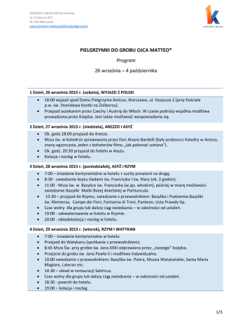 KONDRAT-MEDIA Michał Kondrat ul. Forteczna 9/3 01-540 Warszawa www.kondrat-media.pl/oferta/pielgrzymki/ PIELGRZYMKI DO GROBU OJCA MATTEO* Program 26 września – 4 października 1 Dzień, 26 września 2015 r. (sobota), WYJAZD Z POLSKI 18:00 wyjazd spod Domu Pielgrzyma Amicus, Warszawa, ul. Hozjusza 2 (przy Kościele p.w. św. Stanisława Kostki na Żoliborzu). Przejazd autokarem przez Czechy i Austrię do Włoch. W czasie podróży współna modlitwa prowadzona przez Księdza. Jest także możliwość wyspowiadania się. 2 Dzień, 27 września 2015 r. (niedziela), AREZZO I ASYŻ Ok. godz.18:00 przyjazd do Arezzo. Msza św. w Katedrze sprawowana przez Don Alvaro Bardelli (były proboszcz Katedry w Arezzo, znany egzorcysta, jeden z bohaterów filmu „Jak pokonać szatana”). Ok. godz. 20:30 przyjazd do hotelu w Asyżu. Kolacja i nocleg w hotelu. 3 Dzień, 28 września 2015 r. (poniedziałek), ASYŻ I RZYM 7:00 – śniadanie kontynentalne w hotelu + suchy prowiant na drogę. 8:30 - zwiedzanie Asyżu śladami św. Franciszka i św. Klary (ok. 2 godzin). 11:00 - Msza św. w Bazylice św. Franciszka (w jęz. włoskim), później w miarę możliwości zwiedzanie Bazyliki Matki Bożej Anielskiej w Portiuncula. 15:30 – przyjazd do Rzymu, zwiedzanie z przewodnikiem: Bazylika i Podziemia Bazyliki św. Klemensa, Campo dei Fiori, Fontanna di Trevi, Panteon, Usta Prawdy itp. Czas wolny dla grupy lub dalszy ciąg zwiedzania – w zależności od ustaleń. 19:00 - zakwaterowanie w hotelu w Rzymie. 20:00 - obiadokolacja i nocleg w hotelu. 4 Dzień, 29 września 2015 r. (wtorek), RZYM I WATYKAN 7:00 – śniadanie kontynentalne w hotelu. Przejazd do Watykanu (spotkanie z przewodnikiem). 8:45 Msza Św. przy grobie św. Jana XXIII odprawiana przez ,,naszego” księdza. Przejście do grobu św. Jana Pawła II i modlitwa indywidualna. 10:00 zwiedzanie z przewodnikiem: Bazylika św. Piotra, Muzea Watykańskie, Santa Maria Magiore, Lateran etc. 14:30 – obiad w restauracji Satiricus. Czas wolny dla grupy lub dalszy ciąg zwiedzania – w zależności od ustaleń. 18:30 - powrót do hotelu. 19:00 – kolacja i nocleg. 1/3 KONDRAT-MEDIA Michał Kondrat ul. Forteczna 9/3 01-540 Warszawa www.kondrat-media.pl/oferta/pielgrzymki/ 5 Dzień, 30 września 2015 r. (środa): AGNONE 8:30 – 9:00 – śniadanie kontynentalne, czas na spakowanie i wykwaterowanie. Przejazd do Agnone (ok. 3 godz.). 13:00 – lunch w Agnone i przejazd do hotelu (zakwaterowanie). 16:00 – Msza św. w kościele Kapucyńskim z relikwiami Ojca Matteo da Agnone. 17:00 – zwiedzanie z przewodnikiem Starówki, miejsc młodości O. Matteo, biblioteki i wystawy zbiorów zabytkowych. Opcjonalnie - możliwość spotkania z Nicola Mastronardi – mieszkanjącym w Agnone konsultatnetm TV RAI. Jest znawcą dziejów miasta i samego Ojca Matteo (znanego również z filmu Matteo). 19:30 – kolacja i nocleg w hotelu. 6 Dzień, 1 października 2015 r. (czwartek): AGNONE I MONTE SANT ANGELO 8:00 - śniadanie kontynentalne w hotelu + suchy prowiant na drogę. 9:00 - zwiedzanie średniowiecznej Odlewni Dzwonów. Opcjonalnie Droga Krzyżowa na Górze Św. Onufrego. 10:30 - wyjazd z Agnone do Monte Sant Angelo (przejazd ok. 3h). 14:30 – Msza Św. w Sanktuarium Św. Michała Archanioła w Monte Sant Angelo odprawiana przez ,,naszego” Księdza. Opcjonalnie - zwiedzanie Groty Św. Michała Archanioła z prelekcją w jęz. polskim. 16:00 – czas wolny z możliwością zwiedzania Muzeum i Krypt. 19:00 – kolacja w Domu Pielgrzyma przy Sanktuarium Św. Michała Archanioła. Nocleg w Domu Pielgrzyma. 7 Dzień, 2 października 2015 r. (piątek), MONTE SANT ANGELO, SAN GIOVANNI ROTONDO, SERRACAPRIOLA 2/3 7:00 – śniadanie kontynentalne w Domu Pielgrzyma. Wyjazd do San Giovanni Rotondo. 9:00 - zwiedzanie z przewodnikiem Kościóła, Domu Ulgi w Cierpieniu i celi Ojca Pio. 10:00 - „Droga Krzyżowa z Ojcem Pio”. czas wolny (w miarę możliwości) 11:30 – wyjazd do Serracapriola. 14:00 – obiad w Konwencie Ojców Kapucynów. 15:00 - Zwiedzanie i nawiedzenie grobu Ojca Matteo (z Ojcem Giuseppe). 16:00 - Spotkanie i Msza Św. z Ojcem Cipriano de Meo. Modlitwa indywidualna. 20:00 - powrót do San Giovanni Rotondo. 22:00 - kolacja i nocleg w hotelu. KONDRAT-MEDIA Michał Kondrat ul. Forteczna 9/3 01-540 Warszawa www.kondrat-media.pl/oferta/pielgrzymki/ 8 Dzień, 3 października 2015 r. (sobota), SAN GIOVANNI ROTONDO I MANOPPELLO 8.30 – śniadanie kontynentalne w hotelu. 9:00 – czas wolny lub wizyta w klasztorze Sióstr. 10:30 - wyjazd do Manoppello (ok. 2,5 godz.). 13:00 – obiad w restauracji Lu Gattone + suchy prowiant na jeden posiłek. 15:00 – Msza Św. w Sanktuarium Świętego Oblicza w Manoppello. 15:45 – zwiedzanie Sanktuarium. 17:00 – wyjazd do Polski, posiłki w drodze we własnym zakresie. 9 Dzień, 4 października 2015 r. (niedziela), POWRÓT DO POLSKI 16.00 – przyjazd pod Kościół p. w. św. Stanisława Kostki w Warszawie (ul. Hozjusza 2). *Organizator zastrzega sobie prawo do zmiany kolejności zwiedzania i ewentualnie zmian miejsca noclegu, przy zachowaniu pełnej realizacji planu pielgrzymki. Podane w programie godziny są orientacyjne i w czasie trwania pielgrzymki mogą ulec zmianie w zależności od przebiegu wydarzeń. Wpłat prosimy dokonywać na konto: KONDRAT-MEDIA Michał Kondrat ul. Forteczna 9/3 01-540 Warszawa Nr kona bankowego: 32 1140 2017 0000 4802 1306 1509 W tytule: „Pielgrzymka”, imię i nazwisko Uczestnika/Uczestników, termin pielgrzymki (np.: 26 września 4 października 2015 r.) Kontakt: [email protected] tel. +48 607 090 193 (Biuro jest czynne od poniedziałku do piątku w godz. 9:00 – 17:00) 3/3