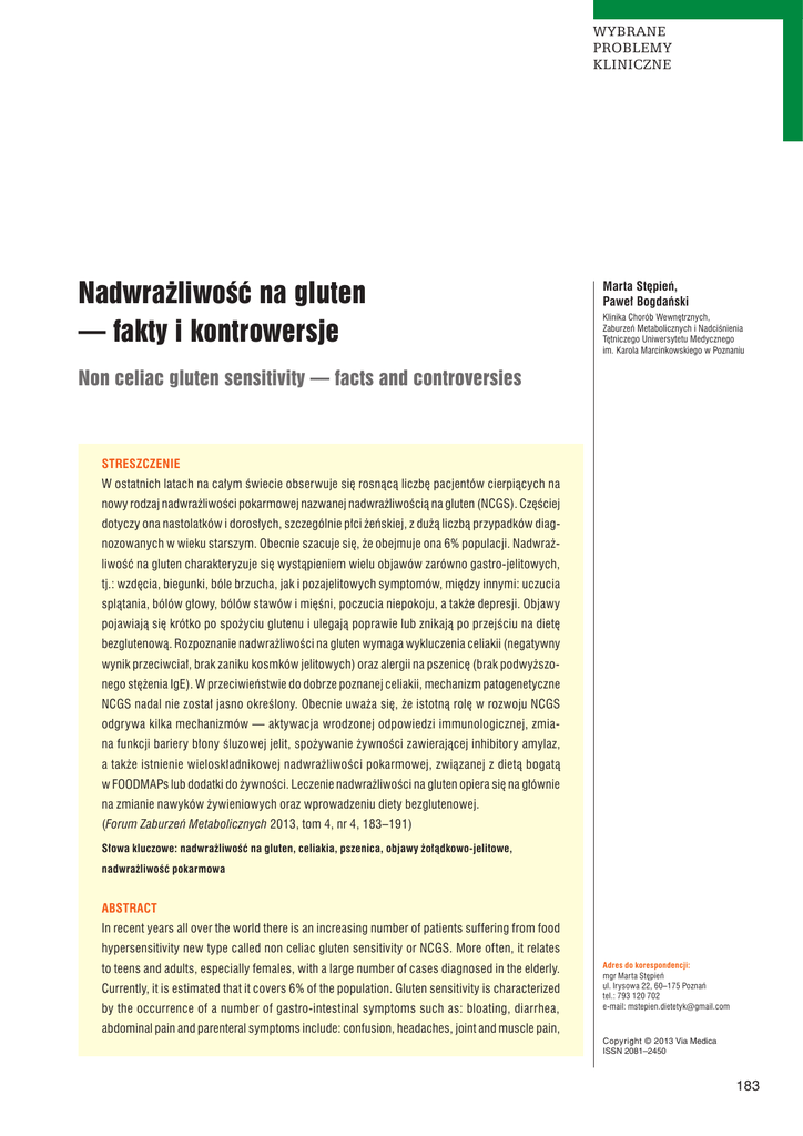 WYBRANE PROBLEMY KLINICZNE Nadwrażliwość na gluten — fakty i kontrowersje Marta Stępień, Paweł Bogdański Klinika Chorób Wewnętrznych, Zaburzeń Metabolicznych i Nadciśnienia Tętniczego Uniwersytetu Medycznego im. Karola Marcinkowskiego w Poznaniu Non celiac gluten sensitivity — facts and controversies Streszczenie W ostatnich latach na całym świecie obserwuje się rosnącą liczbę pacjentów cierpiących na nowy rodzaj nadwrażliwości pokarmowej nazwanej nadwrażliwością na gluten (NCGS). Częściej dotyczy ona nastolatków i dorosłych, szczególnie płci żeńskiej, z dużą liczbą przypadków diagnozowanych w wieku starszym. Obecnie szacuje się, że obejmuje ona 6% populacji. Nadwrażliwość na gluten charakteryzuje się wystąpieniem wielu objawów zarówno gastro-jelitowych, tj.: wzdęcia, biegunki, bóle brzucha, jak i pozajelitowych symptomów, między innymi: uczucia splątania, bólów głowy, bólów stawów i mięśni, poczucia niepokoju, a także depresji. Objawy pojawiają się krótko po spożyciu glutenu i ulegają poprawie lub znikają po przejściu na dietę bezglutenową. Rozpoznanie nadwrażliwości na gluten wymaga wykluczenia celiakii (negatywny wynik przeciwciał, brak zaniku kosmków jelitowych) oraz alergii na pszenicę (brak podwyższonego stężenia IgE). W przeciwieństwie do dobrze poznanej celiakii, mechanizm patogenetyczne NCGS nadal nie został jasno określony. Obecnie uważa się, że istotną rolę w rozwoju NCGS odgrywa kilka mechanizmów — aktywacja wrodzonej odpowiedzi immunologicznej, zmiana funkcji bariery błony śluzowej jelit, spożywanie żywności zawierającej inhibitory amylaz, a także istnienie wieloskładnikowej nadwrażliwości pokarmowej, związanej z dietą bogatą w FOODMAPs lub dodatki do żywności. Leczenie nadwrażliwości na gluten opiera się na głównie na zmianie nawyków żywieniowych oraz wprowadzeniu diety bezglutenowej. (Forum Zaburzeń Metabolicznych 2013, tom 4, nr 4, 183–191) Słowa kluczowe: nadwrażliwość na gluten, celiakia, pszenica, objawy żołądkowo-jelitowe, nadwrażliwość pokarmowa Abstract In recent years all over the world there is an increasing number of patients suffering from food hypersensitivity new type called non celiac gluten sensitivity or NCGS. More often, it relates to teens and adults, especially females, with a large number of cases diagnosed in the elderly. Currently, it is estimated that it covers 6% of the population. Gluten sensitivity is characterized by the occurrence of a number of gastro-intestinal symptoms such as: bloating, diarrhea, abdominal pain and parenteral symptoms include: confusion, headaches, joint and muscle pain, Adres do korespondencji: mgr Marta Stępień ul. Irysowa 22, 60–175 Poznań tel.: 793 120 702 e-mail: [email protected] Copyright © 2013 Via Medica ISSN 2081–2450 183 WYBRANE PROBLEMY KLINICZNE feeling of anxiety, and depression. Symptoms occur shortly after ingestion of gluten and are improved or disappeared after going on a gluten-free diet. The diagnosis of non celiac gluten sensitivity requires exclusion celiac disease (antibody negative, no atrophy of intestinal villi), and allergy to wheat (no elevated levels of IgE). In contrast to the well acknowledged celiac disease, NCGS pathogenic mechanism is still not clearly defined. Currently, it is believed that an important role in the development of NCGS plays several mechanisms such as: activation of the innate immune response, the change in the barrier function of the intestinal mucosa, food containing amylase inhibitors, and the existence of multi-component food hypersensitivity associated with a diet high in FOODMAPs or food additives. Treatment of hypersensitivity to gluten is based mainly on the change of dietary habits and the introduction of a gluten-free diet. (Forum Zaburzen Metabolicznych 2013, vol. 4, no. 4, 183–191) Key words: non celiac gluten sensitivity, celiac disease, wheat, gastrointestinal symptoms, food hypersensitivity vv Uważa się, że jedną z głównych przyczyn powstania nowego rodzaju nadwrażliwości jest nieprawidłowa dieta opar ta na wysokim spożyciu żywności bogatej w gluten (do 20 g glutenu/ /dzień) [3] cc Wstęp rodku ziaren pszenicy, ale również in- W ostatnich latach na całym świecie ob- nych zbóż, między innymi w postaci se- serwuje się rosnącą liczbę pacjentów cier- kalin w życie, hordein w jęczmieniu oraz piących na nowy rodzaj nadwrażliwości awenin w owsie [1]. Gluten zapewnia pokarmowej nazwanej nadwrażliwością odpowiednią konsystencję ciasta, jego na gluten NCGS (non celiac gluten sens- elastyczność i lepkośćci oraz skrócenie itivity). Jest ona trzecią — oprócz celiakii czasu fermentacji, co jest szeroko wy- oraz alergii na pszenicę — formą nieto- korzystywane w przemyśle piekarskim lerancji glutenu, charakteryzującą się i cukierniczym [2]. wrodzonym, nieprawidłowym typem od- Uważa się, że jedną z głównych przy- powiedzi immunologicznej u osoby cho- czyn powstania nowego rodzaju nad- rej, u której na podstawie badania diag- wrażliwości jest nieprawidłowa dieta nostycznego wykluczono celiakię oraz oparta na wysokim spożyciu żywności alergię na pszenicę, a mimo to spożycie bogatej w gluten (do 20 g glutenu/ glutenu prowadzi do wystąpienia niepo- /dzień) [3]. Jako białko odporne na żądanych objawów u chorego. Szczegól- trawienie w żołądka, gluten poprzez nie dużo miejsca tej nowej formie nieto- nadekspresję zonulin, przegrupowanie lerancji na gluten poświęcono podczas cytoszkieletu i dysfunkcję ścisłych po- pierwszej międzynarodowej konferencji łączeń międzykomórkowych zwiększa poświęconej nadwrażliwości na gluten przepuszczalność błony jelita cienkie- (First International Conference of Gluten go, a także zaburza homeostazę jelito- Sensitivity), która odbyła się 11–12 lutego wą, między innymi poprzez hamowanie 2011 roku w Londynie. wzro