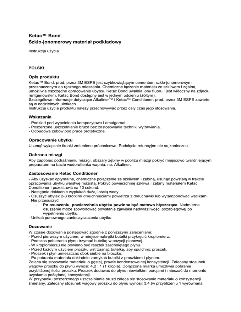Ketac™ Bond Szkło-jonomerowy materiał podkładowy Instrukcja użycia POLSKI Opis produktu Ketac™ Bond, prod. przez 3M ESPE jest szybkowiążącym cementem szkło-jonomerowym przeznaczonym do ręcznego mieszania. Chemiczne łączenie materiału ze szkliwem i zębiną umożliwia oszczędne opracowanie ubytku. Ketac Bond uwalnia jony fluoru i jest widoczny na zdjęciu rentgenowskim. Ketac Bond dostępny jest w jednym odcieniu (żółtym). Szczegółowe informacje dotyczące Alkaliner™ i Ketac™ Conditioner, prod. przez 3M ESPE zawarte są w oddzielnych ulotkach. Instrukcję użycia produktu należy przechowywać przez cały czas jego stosowania. Wskazania - Podkład pod wypełnienia kompozytowe i amalgamat. - Poszerzone uszczelnianie bruzd bez zastosowania techniki wytrawiania. - Odbudowa zębów pod prace protetyczne. Opracowanie ubytku Usunąć wyłącznie tkanki zmienione próchnicowo. Podcięcia retencyjne nie są konieczne. Ochrona miazgi Aby zapobiec podrażnieniu miazgi, obszary zębiny w pobliżu miazgi pokryć miejscowo twardniejącym preparatem na bazie wodorotlenku wapnia, np. Alkaliner. Zastosowanie Ketac Conditioner - Aby uzyskać optymalne, chemiczne połączenie ze szkliwem i zębiną, usunąć powstałą w trakcie opracowania ubytku warstwę mazistą. Pokryć powierzchnię szkliwa i zębiny materiałem Ketac Conditioner i pozostawić na 10 sekund. - Następnie dokładnie wypłukać dużą ilością wody. - Osuszyć ubytek 2-3 krótkimi dmuchnięciami powietrza z dmuchawki lub wytamponować wacikami. Nie przesuszyć! − Po osuszeniu, powierzchnia ubytku powinna być matowo błyszcząca. Nadmierne osuszenie może spowodować powstanie zjawiska nadwrażliwości pozabiegowej po wypełnieniu ubytku. - Unikać ponownego zanieczyszczenia ubytku. Dozowanie W czasie dozowania postępować zgodnie z poniższymi zaleceniami: - Przed pierwszym użyciem, w miejsce nakrętki butelki przykręcić kroplomierz. - Podczas pobierania płynu trzymać butelkę w pozycji pionowej. - W kroplomierzu nie powinno być resztek zaschniętego płynu. - Przed każdym użyciem proszku wstrząsnąć butelkę, aby spulchnić proszek. - Proszek i płyn umieszczać obok siebie na bloczku. - Po pobraniu materiału dokładnie zamykać butelki z proszkiem i płynem. Zaleca się stosowanie materiału o gęstej, prawie kondensowalnej konsystencji. Zalecany stosunek wagowy proszku do płynu wynosi: 4,2 : 1 (1 kropla). Dołączona miarka umożliwia pobranie przybliżonej ilości proszku. Proszek dodawać do płynu niewielkimi porcjami i mieszać do momentu uzyskania pożądanej konsystencji. W przypadku poszerzonego uszczelniania bruzd zaleca się stosowanie materiału o konsystencji śmietany. Zalecany stosunek wagowy proszku do płynu wynosi: 3,4 (w przybliżeniu 1 wyrównana miarka) : 1 (1 kropla). Pobrać spulchniony proszek dołączoną łyżeczką. Nadmiary proszku z łyżeczki usunąć przesuwając miarkę ponad nakładką z tworzywa umieszczoną w otworze butelki z proszkiem. Mieszanie Ketac-Bond stosować w temperaturze 20-25°. Do mieszania stosować łopatkę z metalu lub tworzywa oraz bloczek lub szklaną płytkę. Pastę kilkakrotnie rozcierać, do uzyskania jednorodnej konsystencji. Zastosowanie W czasie aplikacji unikać zanieczyszczenia ubytku, np. wilgocią lub śliną. Pole pracy utrzymywać w suchości. Estetyczne wypełnienia można uzyskać stosując technikę kanapkową, w której szkło-jonomer, służący jako podkład zastępujący zębinę, pokrywa się materiałem kompozytowym, zgodnie z poniższą procedurą: Odpowiednim narzędziem założyć pożądaną ilość Ketac Bond do ubytku pozostawiając odsłonięte brzegi zębiny. Po związaniu materiału wytrawić powierzchnię szkliwa i szkło-jonomeru, zastosować odpowiedni system łączący i założyć materiał kompozytowy, postępując zgodnie z zaleceniami producenta materiału. W przypadku wypełnień z amalgamatu nie stosuje się wytrawiania i systemu łączącego. Przy uszczelnianiu bruzd i zagłębień oraz odbudowie zęba pod prace protetyczne założyć Ketac Bond odpowiednim narzędziem. Materiał można opracować narzędziami obrotowymi minimalnie po upływie 4 minut od rozpoczęcia mieszania. Ketac Bond przylega mocno do narzędzi metalowych. Narzędzia wypłukać w zimnej wodzie przed stwardnieniem pozostałości materiału. Czas pracy i wiązania Podane poniżej czasy dotyczą temperatury pokojowej 23°C i 50% wilgotności względnej powietrza. min:sek. Mieszanie 00:30 Czas pracy od początku mieszania 02:00 Czas wiązania od początku mieszania 04:00 Wiązanie w jamie ustnej 02:00 Na czas wiązania mają wpływ następujące czynniki: - Wyższa temperatura skraca, a niższa wydłuża czas pracy materiałem. - Mieszanie na ochłodzonej płytce przedłuża czas pracy. - Dodatek większej ilości proszku, w stosunku do zalecanych proporcji, skraca czas pracy. Wrażliwość na produkt U osób wrażliwych nie można wykluczyć uczulenia na produkt. W przypadku wystąpienia reakcji alergicznej przerwać ich stosowanie. W nielicznych przypadkach, szczególnie, gdy nie są przestrzegane zalecane zasady postępowania może wystąpić podrażnienie miazgi. Przechowywanie i trwałość Proszek przechowywać w suchym miejscu i chronić przed dostępem wilgoci. Produkt przechowywać w temperaturze poniżej 25°C. Nie stosować po upływie terminu przydatności. Informacje dla klienta Nikt nie jest upoważniony do udzielania informacji niezgodnych z informacjami zawartymi w tej instrukcji. Gwarancja 3M ESPE gwarantuje, że ww. produkt pozbawiony jest wszelkich wad materiałowych i produkcyjnych. 3M ESPE NIE UDZIELA ŻADNYCH DODATKOWYCH GWARANCJI, W TYM ŻADNYCH GWARANCJI DOROZUMIANYCH LUB DOTYCZĄCYCH SPRZEDAŻY, LUB PRZYDATNOŚCI DO OKREŚLONYCH CELÓW. Każdy użytkownik ww. produktu powinien sam określić jego przydatność w konkretnym przypadku. 3M ESPE zobowiązuje się do naprawy lub wymiany produktów, które po udo
