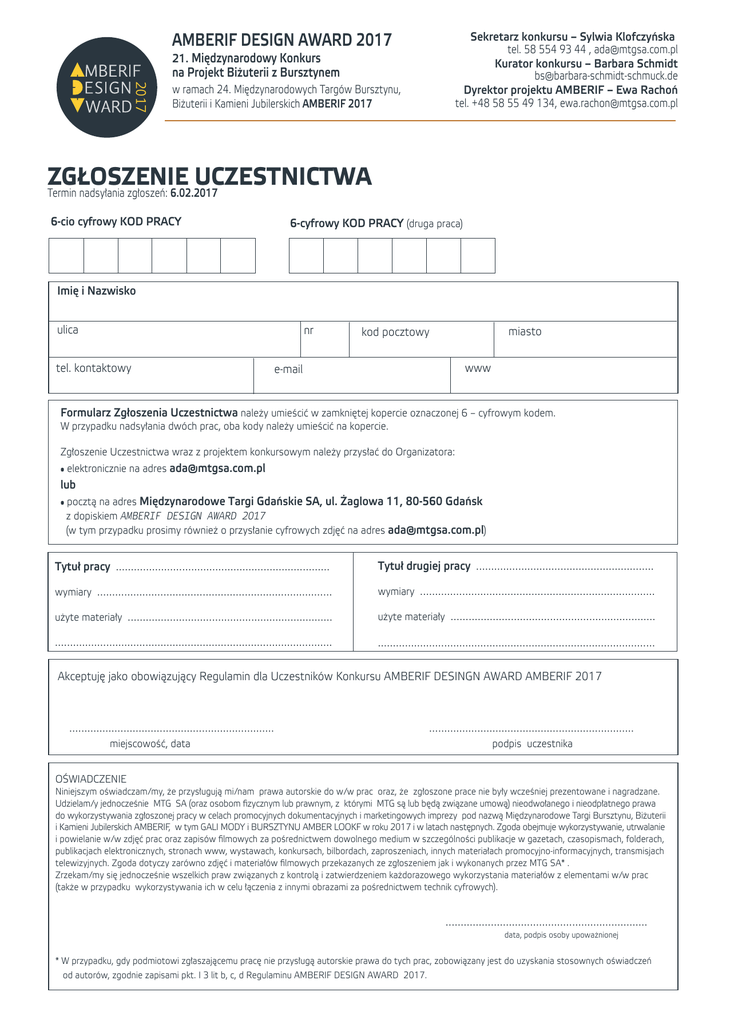 AMBERIF DESIGN AWARD 2017 Sekretarz konkursu – Sylwia Klofczyńska tel. 58 554 93 44 , [email protected] Kurator konkursu – Barbara Schmidt [email protected] Dyrektor projektu AMBERIF – Ewa Rachoń tel. +48 58 55 49 134, [email protected] 21. Międzynarodowy Konkurs na Projekt Biżuterii z Bursztynem 2017 w ramach 24. Międzynarodowych Targów Bursztynu, Biżuterii i Kamieni Jubilerskich AMBERIF 2017 ZGŁOSZENIE UCZESTNICTWA Termin nadsyłania zgłoszeń: 6.02.2017 6-cio cyfrowy KOD PRACY 6-cyfrowy KOD PRACY (druga praca) Imię i Nazwisko ulica nr tel. kontaktowy miasto kod pocztowy www e-mail Formularz Zgłoszenia Uczestnictwa należy umieścić w zamkniętej kopercie oznaczonej 6 – cyfrowym kodem. W przypadku nadsyłania dwóch prac, oba kody należy umieścić na kopercie. Zgłoszenie Uczestnictwa wraz z projektem konkursowym należy przysłać do Organizatora: • elektronicznie na adres [email protected] lub • pocztą na adres Międzynarodowe Targi Gdańskie SA, ul. Żaglowa 11, 80-560 Gdańsk z dopiskiem AMBERIF DESIGN AWARD 2017 (w tym przypadku prosimy również o przysłanie cyfrowych zdjęć na adres [email protected]) Tytuł pracy ....................................................................... Tytuł drugiej pracy ........................................................... wymiary .............................................................................. wymiary .............................................................................. użyte materiały .................................................................... użyte materiały .................................................................... ............................................................................................ ............................................................................................ Akceptuję jako obowiązujący Regulamin dla Uczestników Konkursu AMBERIF DESINGN AWARD AMBERIF 2017 .................................................................... miejscowość, data .................................................................... podpis uczestnika OŚWIADCZENIE Niniejszym oświadczam/my, że przysługują mi/nam prawa autorskie do w/w prac oraz, że zgłoszone prace nie były wcześniej prezentowane i nagradzane. Udzielam/y jednocześnie MTG SA (oraz osobom fizycznym lub prawnym, z którymi MTG są lub będą związane umową) nieodwołanego i nieodpłatnego prawa do wykorzystywania zgłoszonej pracy w celach promocyjnych dokumentacyjnych i marketingowych imprezy pod nazwą Międzynarodowe Targi Bursztynu, Biżuterii i Kamieni Jubilerskich AMBERIF, w tym GALI MODY i BURSZTYNU AMBER LOOKF w roku 2017 i w latach następnych. Zgoda obejmuje wykorzystywanie, utrwalanie i powielanie w/w zdjęć prac oraz zapisów filmowych za pośrednictwem dowolnego medium w szczególności publikacje w gazetach, czasopismach, folderach, publikacjach elektronicznych, stronach www, wystawach, konkursach, bilbordach, zaproszeniach, innych materiałach promocyjno-informacyjnych, transmisjach telewizyjnych. Zgoda dotyczy zarówno zdjęć i materiałów filmowych przekazanych ze zgłoszeniem jak i wykonanych przez MTG SA* . Zrzekam/my się jednocześnie wszelkich praw związanych z kontrolą i zatwierdzeniem każdorazowego wykorzystania materiałów z elementami w/w prac (także w przypadku wykorzystywania ich w celu łączenia z innymi obrazami za pośrednictwem technik cyfrowych). ................................................................... data, podpis osoby upoważnionej * W przypadku, gdy podmiotowi zgłaszającemu pracę nie przysługą autorskie prawa do tych prac, zobowiązany jest do uzyskania stosownych oświadczeń od autorów, zgodnie zapisami pkt. I 3 lit b, c, d Regulaminu AMBERIF DESIGN AWARD 2017.