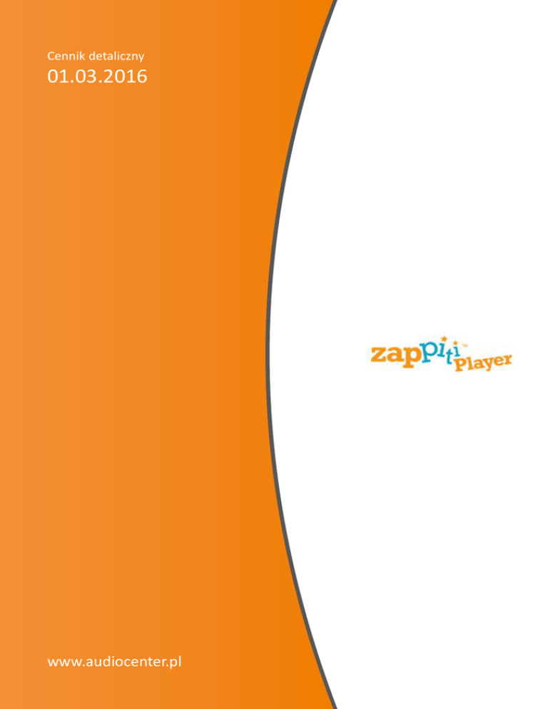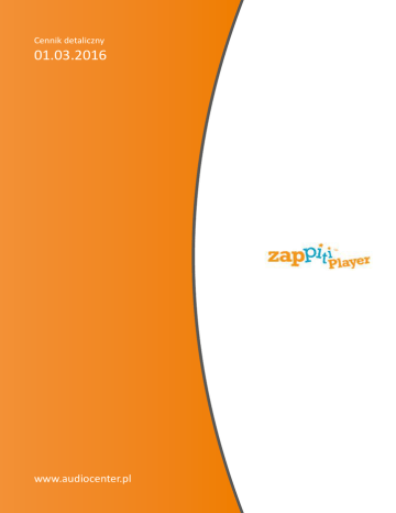 Cennik detaliczny 01.03.2016 www.audiocenter.pl ZAPPITI 4K MINI - Odtwarzacz mulimedialny 999 zł cena detaliczna Odtwarzacz 4K HD 3D z możliwości podpięcia dysku zewnętrznego USB lub SATA o pojemności do 8 TB z prędkość przesyłu danych do 6 Gbit/s za pomocą złącza SATA , komplet złącz USB, czytnik kart pamięci i wbudowaną kartą sieci LAN i WiFi oraz dodatkowe wejście HDMI. Zbudowany w oparciu o najnowszy procesor Realtek zapewniający sprzętowe dekodowanie formatu HVEC (h265) stosowanego materiałach wideo 4K oraz skalowanie obrazu SD i HD do rozdzielczości UHD i 4K. Urządzenie odtwarza wszystkie najważniejsze formaty wideo HD i SD w 2D i 3D. Obsługuje popularne, oraz audiofilskie bezstratne formaty audio w rozdzielczości do 192kHz/24bit i wielokanałowe formaty dźwięku AudioHD. Sprawnie pracuje w sieci LAN (100/1000Mbit), zapewnia dostęp do internetowych zasobów audio i wideo. Dedykowane oprogramowanie Zappiti Media Center oraz Zappiti Explorer odpowiadają za wygodne katalogowanie filmów i muzyki, uzupełnianie opisów i pobieranie okładek z internetu. Dzięki dostępowi do marketu Google Play i opcji instalowania aplikacji dla systemu Android funkcjonalność urządzenia może być rozszerzana niemal bez ograniczeń. 1229 zł ZAPPITI 4K - Odtwarzacz mulimedialny cena detaliczna Odtwarzacz 4K HD 3D wyposażony w kieszeń na dysk twardy SATA 3.5" o pojemności do 8TB, komplet złącz USB, czytnik kart pamięci i wbudowaną kartę sieci LAN i WiFi oraz dodatkowe wejście HDMI. Zbudowany w oparciu o najnowszy procesor Realtek zapewniający sprzętowe dekodowanie formatu HVEC (h265) stosowanego materiałach wideo 4K oraz skalowanie obrazu SD i HD do rozdzielczości UHD i 4K. Urządzenie odtwarza wszystkie najważniejsze formaty wideo HD i SD w 2D i 3D. Obsługuje popularne, oraz audiofilskie bezstratne formaty audio w rozdzielczości do 192kHz/24bit i wielokanałowe formaty dźwięku AudioHD. Sprawnie pracuje w sieci LAN (100/1000Mbit), zapewnia dostęp do internetowych zasobów audio i wideo. Dedykowane oprogramowanie Zappiti Media Center oraz Zappiti Explorer odpowiadają za wygodne katalogowanie filmów i muzyki, uzupełnianie opisów i pobieranie okładek z internetu. Dzięki dostępowi do marketu Google Play i opcji instalowania aplikacji dla systemu Android funkcjonalność urządzenia może być rozszerzana niemal bez ograniczeń. ZAPPITI 4K DUO - Odtwarzacz mulimedialny 1539 zł cena detaliczna Odtwarzacz 4K HD 3D wyposażony w podwójną kieszeń na dyski twarde 3.5" o całkowitej pojemność do 16TB , komplet złącz USB, czytnik kart pamięci i wbudowaną kartę sieci LAN i WiFi oraz dodatkowe wejście HDMI. Zbudowany w oparciu o najnowszy procesor Realtek zapewniający sprzętowe dekodowanie formatu HVEC (h265) stosowanego materiałach wideo 4K oraz skalowanie obrazu SD i HD do rozdzielczości UHD i 4K. Urządzenie odtwarza wszystkie najważniejsze formaty wideo HD i SD w 2D i 3D. Obsługuje popularne, oraz audiofilskie bezstratne formaty audio w rozdzielczości do 192kHz/24bit i wielokanałowe formaty dźwięku AudioHD. Sprawnie pracuje w sieci LAN (100/1000Mbit), zapewnia dostęp do internetowych zasobów audio i wideo. Dedykowane oprogramowanie Zappiti Media Center oraz Zappiti Explorer odpowiadają za wygodne katalogowanie filmów i muzyki, uzupełnianie opisów i pobieranie okładek z internetu. Dzięki dostępowi do marketu Google Play i opcji instalowania aplikacji dla systemu Android funkcjonalność urządzenia może być rozszerzana niemal bez ograniczeń. AUDIO CENTER POLAND ul. Sucharskiego 49, 30-898 Kraków | www.audiocenter.pl ZAPPITI NAS - sieciowy serwer NAS NOWOŚĆ! 8N - 5679 zł 8N RIP - 6559 zł 8S - 7879 zł 8S RIP - 8759 zł cena detaliczna Serwer sieciowy to perfekcyjne rozwiązanie dla domowego systemu audio i wideo. Dzięki specjalnemu oprogramowaniu korzystanie z dysków Zappiti jest bardzo proste i jeszcze bardziej pomocne, kiedy współpracuje on z odtwarzaczem plików Zappiti. Procesor użyty w Zappiti NAS stosowany jest także w odtwarzaczach 4K tej firmy, co gwarantuje szybkie przetwarzanie dużej ilości danych. Opcja RIP, dzięki wbudowanej kieszeni na płyty, daje możliwość archiwizacji plików do użytku w kinie domowym, dodatkowo urządzenia oznaczone symbolem 8S wyposażone zostały wydajniejszy procesor umożliwiający jeszcze szybszy przesył danych, szybsze indeksowanie oraz szybsze poruszanie się po katalogu okładek zapisanych filmów. System pracuje w trybie RAID 5 i sterowany jest przez fantastyczną aplikację sterującą Zappiti Server. Każda wersja urządzenia sprzedawana jest bez dysków. AUDIO CENTER POLAND ul. Sucharskiego 49, 30-898 Kraków | www.audiocenter.pl Dystrybucja ul. Sucharskiego 49 30-898 Kraków tel.: 12 265 02 85 e-mail: [email protected] www.audiocenter.pl Ceny podane są w PLN i zawierają podatek VAT