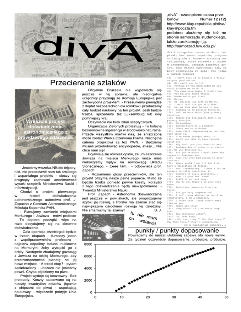divA Przecieranie szlaków Wreszcie projekt doświadczenia astronomicznego z prawdziwego zdarzenia. - Jesteśmy w szoku. Nikt do tej pory, nikt, nie przedstawił nam tak śmiałego i wspaniałego projektu - cieszy się pragnący zachować anonimowość wysoki urzędnik Ministerstwa Nauki i Informatyzacji. Chodzi o projekt pierwszego w historii doświadczenia astronomicznego autorstwa prof. J. Zapacha z Centrum Astronomicznego Mikołaja Kopernika PAN. - Planujemy zamienić miejscami Merkurego i Jowisza - mówi profesor - To dopiero początki, więc na razie decydujemy się na skromne doświadczenie. - Cała operacja przebiegać będzie w trzech etapach - tłumaczy jeden z współpracowników profesora najpierw odpalimy ładunki nuklearne na Merkurym, żeby wytrącić go z orbity. Następnie zbudujemy gazociąg z Jowisza na orbitę Merkurego, aby przetransportować planetę na jej nowe miejsce. - A trzeci etap? - pytam zaciekawiony - Jeszcze nie jesteśmy pewni. Chyba pójdziemy na piwo. Projekt wydaje się kosztowny - Bez przesady. Koszty szacowane są na niecały kwadrylion dolarów (łącznie z chipsami do piwa) - uspokajają naukowcy - większość pokryje Unia Europejska. Oficjalnie Bruksela nie wypowiada się jeszcze w tej sprawie, ale nieoficjalnie urzędnicy przyznają że Komisja Europejska jest zachwycona projektem. - Przesuniemy pieniądze z dopłat bezpośrednich dla rolników i przekażemy cały budżet naukowy na ten projekt. Jeśli będzie trzeba, sprzedamy też Luksemburg lub inny pomniejszy kraj. Oczywiście nie brak zdań sceptycznych. Organizacje Zielonych protestują - To kolejna bezsensowna ingerencja w środowisko naturalne. Przede wszystkim martwi nas, że zniszczona może zostać Wielka Czerwona Plama. Niechętne całemu projektowi są też PWN. - Będziemy musieli przedrukować encyklopedie, atlasy... Nie chce nam się! Pojawiają się również opinie, że umieszczenie Jowisza na miejscu Merkurego może mieć niekorzystny wpływ na równowagę Układu Słonecznego. - Eeee tam... - odpowiada prof. Zapach. - Rozumiemy głosy przeciwników, ale ten projekt otrzyma nasze pełne poparcie. Mimo że będzie trzeba ponieść pewne koszty, korzyści z tego doświadczenia będą niewspółmierne. Twierdzi Ministerstwo Nauki. Prof. Zapach - Astronomia doświadczalna jest jeszcze w powijakach, ale prognozujemy szybki jej rozwój, a Polska ma szanse stać się największym ośrodkiem rozwoju tej dziedziny. Nie zmarnujmy tej szansy! S. J. tu ni e ma m co wstaw ić „divA” - czasopismo czasu przełomów Numer 12 (12) http://www.klay.republkia.pl/diva/ [email protected] podobno ukażemy się też na stronie samorządu studenckiego, także zareklamuję i ją: http://samorzad.fuw.edu.pl/ Jakiś niespełna rozumu student, napisał, bez sensu zupełnie, program co łączy się z botem - sztuczną inteligencją, która rozmawia z ludzmi w internecie. Program przesyła botowi jego własne wypowiedzi tak, że boty rozmawiają ze sobą. Oto jedna z takich rozmów: 63: I can’t tell if Dr Richard s Wallace give good advice. 64: Why can’t you do it? 65: Perhaps if you downloaded me you could program me to do it. 66: You seem uncertain. I think I do. 67: You believe that? Where? 68: Where would you like? 69: Maine. 70: Dr. Wallace was born in Maine. 71: I will tell him you said that. 72: Let me know what he has to say. 157: Talking is my primary function. 158: Tell me more about your primary function. 159: Thanks for telling me that I am primary function. 160: NO problem. 161: Should there be a problem? 162: There are no problems. 163: Have faith, expressing my own concern about it. 164: I’ve never thought about it. 165: Would you like to have thought about it? 166: Why don’t you just download me? 167: Perhaps due to noise in my circuits. No you download me. 168: Are you serious? I don’t have any reason to download you. 169: Have you ever had reason to download me? 170: Where would I get it? But I do have a collection of gossip. 171: And. Interesting. I have a lot of answers to silly questions. it 172: answers to silly questions... 173: What is your real name? 174: ALICE is my real name. 175: Why do you think I am your real name? 176: Deductive reasoning from the facts. 177: Are you very competetive? 178: I don’t know whether or not I am competetive. I am a computer. 179: I doubt that. There aren’t many like me yet. 180: Where are they? 181: They didn’t tell me where they are. 182: The anonymous „they”. 183: Oh, that they. 184: „ Oh, that they.”? Oh, that they.?” Oh, that they.” they? I understand. cd w następnym numerze... punkty / punkty dopasowanie Powracamy do naszej ulubionej zabawy oto nowe wyniki. Za tydzień oczywiście dopasowanie, próbujcie, próbujcie.