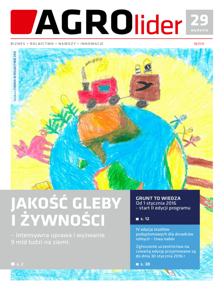 29 w yda n i e 1/2016 Konkurs CHEMIA W ROLNICTWIE 2015 B I Z N E S • R O L N I C T W O • N AW O Z Y • I N N O WA C J E JAKOŚĆ GLEBY I ŻYWNOŚCI – intensywna uprawa i wyzwanie 9 mld ludzi na ziemi. s. 2 GRUNT TO WIEDZA Od 1 stycznia 2016 - start II edycji programu s. 12 IV edycja studiów podyplomowych dla doradców rolnych – trwa nabór Zgłoszenie uczestnictwa na czwartą edycję przyjmowane są do dnia 30 stycznia 2016 r s. 38 SŁOWEM WSTĘPU Jakość gleby i żywności – intensywna uprawa i wyzwanie 9 mld ludzi na ziemi MAGDALENA NISKI Gleba jest początkiem łańcucha przyczynowo - skutkowego: „zdrowa gleba – zdrowe rośliny – zdrowe zwierzęta – zdrowi ludzie”. Zdrowa gleba, bogata w żywe organizmy glebowe, które przekształcają substancję organiczną w pokarm dostępny dla roślin, przyczyniają się do zachowania zasobów próchnicy, magazynowania wody, utrzymania właściwej struktury i właściwości prewencyjnych w stosunku do wielu chorób roślin. Nr 1/2016 ISSN: 1664-7239 Nakład: 15 000 sztuk Wydawca Grupa Azoty Zakłady Azotowe „Puławy” S.A. Al. Tysiąclecia Państwa Polskiego 13 24-110 Puławy Szef Projektu Agrolider Magdalena Niski Redaktor naczelny Sławomir Strzałka Redakcja Karolina Rogozińska Edyta Nowaczek Urszula Czarnecka-Ćwikła Anna Popławska Sylwia Sykut Katarzyna Barańska Według Światowej Organizacji Zdrowia (WHO), w ciągu ostatnich lat liczba osób chorych ze względu na niewłaściwe odżywianie znacznie wzrosła. Dziś politycy i społeczności międzynarodowe starają się wypracować rozwiązania, aby uporać się z tym problemem. Aby pomóc konsumentom w podejmowaniu zdrowych decyzji żywieniowych i wpłynąć na kierunek polityki w tym zakresie powinniśmy rozszerzyć znaczenie rolnictwa w Unii Europejskiej. Do tej pory skupialiśmy swoją uwagę na wyzwaniu związanym z liczebnością populacji ziemskiej, czyli 9 mld ludzi w 2050 roku (za 34 lata). Jednocześnie obszar gruntów ornych nie zwiększa się a to oznaczać musi zwiększenie intensywności uprawy, nowe technologie. Popyt na produkty rolne do 2050 roku osiągnie poziom do 80% powyżej dzisiejszego poziomu produkcji. www.yellowgoup.pl Już dziś 48% populacji całego globu ma pożywienie dzięki wykorzystaniu nawozów mineralnych. Bez nawozów życie ludzkie byłoby zagrożone. Wyzwaniem jednak staje się połączenie optymalnego nawożenia, niezbędnej wielkości produkcji rolnej oraz jakości żywności. Copyright © 2016 Grupa Azoty PUŁAWY Wszystkie prawa zastrzeżone. Nieustanny rozwój technologii uprawy gleby oraz wytwarzania żywności prowadzi do Zdjęcia Sławomir Kłak Opracowanie graficzne i skład intensywnego traktowania środowiska, co pomimo wielu zalet niesie ze sobą ogromne zagrożenia. Gleba i utrzymanie jej żyzności jest dla rolnika poważnym wyzwaniem. Ziemia jest przecież najważniejszym aktywem rolnika – to jego warsztat pracy. Dziś duża część potencjalnie dostępnych gruntów nie nadaje się dla rolnictwa ze względu na wysokie koszty dostosowania w aspektach ekologicznym, społecznym i gospodarczym. Szacuje się, że w ciągu ostatnich 40 lat aż jedna trzecia wszystkich obszarów uprawnych na świecie padła ofiarą erozji lub zanieczyszczenia gleby, co w sytuacji ciągłego wzrostu popytu na żywność i nasilającej się zmiany klimatu może mieć znaczące skutki. Nowe badania wskazują, że aż 33% gleb o wysokiej produktywności uległo degradacji w tempie szybszym niż wynosi ich zdolność do regeneracji. Badacze z Uniwersytetu w Sheffield przeanalizowali prace z ostatnich 10 lat, stwierdzając, że utrata gleb będzie miała charakter nieodwracalny, jeśli rozpowszechnione obecnie praktyki rolnicze nie ulegną zmianie. Zgodnie z decyzją ONZ rok 2015 był ogłoszony Międzynarodowym Rokiem Gleb, pod hasłem „Zdrowe gleby, zdrowe życie” – w roku 2015 wspierając rolników w Polsce Grupa Azoty we współpracy z PKO Bankiem Polskim rozpoczęła ogólnopolski 3 letni program badań pH gleb oraz zasobności w składniki odżywcze, program GRUNT TO WIEDZA. Chcemy aby Polska i polscy rolnicy stali się liderami eksportu najwyższych standardów środowiskowych oraz produktów w Europie. Już dziś dysponują kompetencjami do pozycji lidera w sektorze rolno-spożywczym, kreując klaster produkcji żywości oraz rozwijając polskie marki. W numerze Spis treści Przegląd rynku rolnego 4-7 Rynki nawozowe 8 7 Przegląd rynku rolnego Dopłaty dla rolników Z przemysłu9 Agronewsy10-11 Warto wiedzieć 12-13 Grunt to wiedza 14 Spotkania z młodzieżą W uprawie rzepaku 15 Nawożenie16 Azot mineralny20 Branża rolniczo – spożywcza 23 Dodatki mineralno – witaminowe 26 Mali artyści30 Znamy najlepszych32 IV edycja studiów 38 Liderzy rolnictwa44 Finał konkursu Polifoska 46 Azot – ważny składnik 47 11 Agronewsy 12 Grunt to wiedza 38 Studia podyplomowe od 1 stycznia 2016 zmiany w ubezpieczeniach Od 1 stycznia 2016 - start II edycji programu Portrety42-43 Grupakowy kącik rozrywkowy54-58 IV edycja – trwa nabór Przegląd rynku rolnego B I Z N E S • R O L N I C T W O • N AW O Z Y • I N N O WA C J E Zboża Wg informacji publikowanych przez Ministerstwo Rolnictwa i Rozwoju Wsi (Zintegrowany System Rolniczej Informacji Rynkowej) w połowie grudnia 2015 r. nie odnotowano większych zmian cen zbóż konsumpcyjnych. W porównaniu do cen z połowy listopada ziarno pszenicy konsumpcyjnej zdrożało o 1%, a żyta konsumpcyjnego o 1,2%. Jęczmień paszowy zdrożał o 2,8%, a cena kukurydzy wzrosła o 5,8%. W porównaniu do cen skupu z grudnia 2014 roku ziarno pszenicy konsumpcyjnej było tańsze jedynie o 1,2%, a pszenicy paszowej droższe o 0,7%. Natomiast w skali roku cena skupu żyta paszowego wzrosła o 2,6%, zaś kukurydza paszowa była w skupie o 20,6% droższa niż w grudniu 2014 roku. Cena jęczmienia paszowego w skali roku wzrosła w skupie o 3,5%. W grudniu 2015 r. na krajowych giełdach obserwowano brak