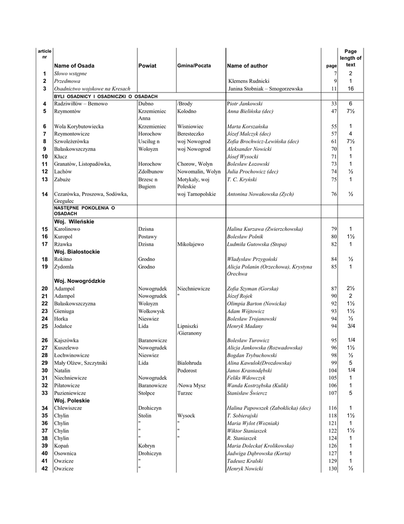 article nr 1 2 3 4 5 6 7 8 9 10 11 12 13 14 Name of Osada Powiat Słowo wstępne Przedmowa Osadnictwo wojskowe na Kresach Wschodnich BYLI OSADNICY I OSADNICZKI O OSADACH Radziwiłłów – Bemowo Dubno Reymontów Krzemieniec Anna Wola Korybutowiecka Krzemieniec Reymontowicze Horochow Szwoleżerówka Uscilug n Bugiem Bałaskowszczyzna Woloyzn Klucz Granatów, Listopadówka, Horochow Krzemienice Lachów Zdolbunow Zabuże Brzesc n Bugiem Cezarówka, Proszowa, Sodówka, Gregulec Gmina/Poczta Name of author Page length of text page Klemens Rudnicki Janina Stobniak – Smogorzewska 7 9 11 2 1 16 /Brody Kolodno Piotr Jankowski Anna Bielińska (dec) 33 47 6 7½ Wisniowiec Beresteczko woj Nowogrod woj Nowogrod Marta Korszańska Józef Malczyk (dec) Zofia Brochwicz-Lewińska (dec) Aleksander Nowicki Jósef Wysocki Bolesław Łozowski Julia Prochowicz (dec) T. C. Kryński 55 57 61 70 71 73 74 75 1 4 7½ 1 1 1 ½ 1 Antonina Nowakowska (Zych) 76 ½ Halina Kurzawa (Zwierzchowska) Bolesław Polnik Ludmiła Gutowska (Stopa) 79 80 82 1 1½ 1 Władysław Przygoński Alicja Polanin (Orzechowa), Krystyna Orechwa 84 85 ½ 1 Zofia Szyman (Gorska) Józef Rojek Olimpia Barton (Nowicka) Adam Wójtowicz Bolesław Trojanowski Henryk Madany 87 90 92 93 94 94 2½ 2 1½ 1½ ½ 3/4 Bolesław Turowicz Alicja Jankowska (Rozwadowska) Bogdan Trybuchowski Alina Kawulok(Drozdowska) Janos Krasnodębski Feliks Wdowczyk Wanda Kostrzębska (Kulik) Stanisław Świercz 95 96 98 99 104 105 106 107 1/4 1½ ½ 5 1/4 1 1 5 Halina Papowszek (Zaboklicka) (dec) T. Sobierajski Maria Wylot (Wozniak) Wiktor Staniaszek R. Staniaszek Maria Dolecka( Krolikowska) Jadwiga Dąbrowska (Korta) Tadeusz Kralski Henryk Nowicki 116 118 121 122 124 126 127 129 130 1 1½ 1 1½ 1 1 1 1 ½ Chorow, Wolyn Nowomalin, Wolyn Motykaly, woj Poleskie woj Tarnopolskie NASTĘPNE POKOLENIA O OSADACH 18 19 Woj. Wileńskie Karolinowo Kuropol Rżawka Woj. Białostockie Rokitno Zydomla 20 21 22 23 24 25 Woj. Nowogródzkie Adampol Adampol Bałaskowszczyzna Gieniuga Horka Jodańce 15 16 17 26 27 28 29 30 31 32 33 34 35 36 37 38 39 40 41 42 Kajszówka Kuszelewo Łochwinowicze Mały Olżew, Szczytniki Natalin Niechniewicze Piłatowicze Puzieniewicze Woj. Poleskie Chlewiszcze Chylin Chylin Chylin Chylin Kopań Osownica Owzicze Owzicze Dzisna Postawy Dzisna Mikolajewo Grodno Grodno Nowogrudek Nowogrudek Woloyzn Wolkowysk Nieswiez Lida Baranowicze Nowogrudek Nieswiez Lida Nowogrudek Baranowicze Stolpce Drohiczyn Stolin " " " Kobryn Drohiczyn " " Niechniewicze " Lipniszki /Gieranony Bialohruda Podorost /Nowa Mysz Turzec Wysock " " " Irena Orzeł(Kujawa) Halina Szulc (Sobocka) Irena Czwordon (Muszynska) Genowefa Rataj (Swistak) Irena Mańka (Grzyb) 130 131 133 139 141 1 2 4 1 ½ /Dabrowica Aleksandra Rymaszewska (Jarmulska) 144 ½ Kowel Wielick Genowefa Kwiecińska (Staniszewska) 145 2 3/4 Bajonówka Bajonówka Belweder Bolesławice Bortnica Chorów Rowne Rowne Luck Rowne Dubno Zdolbunow Tuczyn Tuczyn Poddebce Ostrog n Horyniem Krystyna Ostrowska(Chyzy) Genowefa Laska(Nosek) Janina Tarandzio H. Reywer (Rozycka) Irena Haniewicz (Idkowiak) Jadwiga Markiewicz (Winnicka) 148 153 155 157 160 167 4 2 1½ 3 2 1 56 57 58 Chrobrowicze Chrobrów Chrynów Jaroslawice Czarukow Grzybowica L. Rybacka (Reszkiewicz) Irena Ryduchowska (Matkowska) Wiesława Saternus (Derfel) 168 169 171 1 2 5 1/4 59 60 61 62 63 64 65 66 67 68 69 70 71 72 73 74 Dorotycze Dorotycze-Sarny Drozdów Hallerowo Hallerowo Hallerowo Janina Janina Janówka Janówka Janówka Jazłowiecka Jazłowiecka Jełomalin Jełomalin Karczówka Dubno Luck Wlodzimierz Wolynski Sarny Sarny Rowne Rowne Rowne Rowne Horochow Horochow Dubno Dubno Dubno Rowne Rowne Zdolbunow Zdolbunow Luck ½ 180 181 1 3/4 3 183 1 187 189 1 3/4 191 3 3/4 196 2 1/4 4 198 2 203 3½ 205 ½ 213 2 213 4½ 215 1½ 220 222 poem 2½ 1 225 75 76 Konstantynów Kościuszków Rowne Luck Klewan Polonka 77 78 79 80 81 82 83 84 85 86 87 Krechowiecka Krechowiecka Krechowiecka Krechowiecka Krechowiecka Kurhany n/Horyniem Kurhany n/Horyniem Chorów n/Horyniem Listopadówka Łany Maczkowce Rowne Rowne Rowne Rowne Rowne Zdolbunow Zdolbunow Zdolbunow Horochow Krzemieniec Luck Aleksandria Aleksandria Aleksandria Aleksandria Aleksandria /Mogilany /Mogilany Katerburg Polonka /Czarukow Grażyna Dąbrowska (Wizgird) Wiesława Chmura (Miszela) Teresa Palej (Domagalska) (dec) Zofia Bronowicka (Pasik) Jadwiga Pawłowicz (Pleciak) Irena Rybiczonek (Budzyn) (dec) Witold Więckowski (dec) Mieczysław Więckowski Felicja Iskrzyńska (Walczak) Tadeusz Walczak (dec) Stefania Ducheńska (Urban) L. Cabut Karol Olszewski Jadwiga Pszonka (Wilczek) Kazimierz Chyży Irena Bieżańska (Pajdowska), Jósef Pajdowski Mieczysaw Wodecki Jerzy Kondziela (dec) i Alicja Kondziela (Szalast) Danuta Mączka-Gradosielska Danuta Mączka-Gradosielska Jan Kulik Janina Misik (Goral) ks. Czesław Pukacz Maria Kruczkiewicz (Kacperska) Stefania Borowy (Kacperska) Stanisław Borowy E. P. Brzeziński Jadwiga Osostowicz (Wnek) Zofia Repa (Stepek) 88 Maczkowce Luck Polonka /Czarukow 89 90 Naręczyn Narutowicze Horochow Krzemieniec 43 44 45 46 47 Brzesc n Bugiem Stolin Drohiczyn " Pinsk 48 Stawy Trebieżów Woławel Woławka Żabczyce Woj. Wołyńskie Antonin Sarny 49 Arsonowicze 50 51 52 53 54 55 Tuczyn Tuczyn Tuczyn Tuczyn Skobelka Skobelka Mlynow Mlynow Mlynow Tuczyn Tuczyn Rozyszcze 226 227 ½ 3½ 231 247 250 254 256 260 262 64 270 272 275 5 3 4 1 4 1½ 2½ 5 1 3 ½ Bronisław Piotr Wawrzkowicz (dec) 275 4 A. Kozłowska (Jasko) Janina Walbach (Warzecha) (dec) 282 282 1/4 1 Zdzisław Michalski 286 ½ Krystyna Zielkiewicz (Zelazik) Marian Chlebik Zyta Szulejewska (Rzehak) Maria Filon (Oles) 287 291 297 300 3 1/4 2 ½ 3/4 Józef Ćwirko Teresa Rafaląt (Miloszewska) B. Stępniewski Alina Żbikowska (Musial) Dorota Jasińska (Jarosz) Jan W. Salomonowicz (dec) Eugenia Zakłada (Popsowska) (dec) Bronisława Kacperek(Bielinska) (dec) Leokadia Zabłocka (Turzynska) Franciszek Gall L. Szydłowski Henryk Sopala Franciszek Zimnow