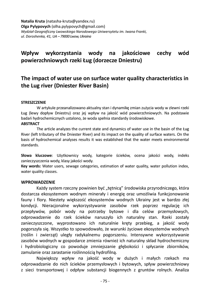 Natalia Kruta ([email protected]) Olga Pylypovych ([email protected]) Wydział Geograficzny Lwowskiego Narodowego Uniwersytetu im. Iwana Franki, ul. Doroshenka, 41, UA – 79000 Lwow, Ukraina Wpływ wykorzystania wody na jakościowe powierzchniowych rzeki Ług (dorzecze Dniestru) cechy wód The impact of water use on surface water quality characteristics in the Lug river (Dniester River Basin) STRESZCZENIE W artykule przeanalizowano aktualny stan i dynamikę zmian zużycia wody w zlewni rzeki Ług (lewy dopływ Dniestru) oraz jej wpływ na jakość wód powierzchniowych. Na podstawie badań hydrochemicznych ustalono, że woda spełnia standardy środowiskowe. ABSTRACT The article analyzes the current state and dynamics of water use in the basin of the Ług River (left tributary of the Dniester River) and its impact on the quality of surface waters. On the basis of hydrochemical analyses results it was established that the water meets environmental standards. Słowa kluczowe: Użytkownicy wody, kategorie ścieków, ocena jakości wody, indeks zanieczyszczenia wody, klasy jakości wody. Key words: Water users, sewage categories, estimation of water quality, water pollution index, water quality classes. WPROWADZENIE Każdy system rzeczny powinien być „tętnicą” środowiska przyrodniczego, która dostarcza ekosystemom wodnym minerały i energię oraz umożliwia funkcjonowanie fauny i flory. Niestety większość ekosystemów wodnych Ukrainy jest w bardzo złej kondycji. Nieracjonalne wykorzystywanie zasobów rzek poprzez regulację ich przepływów, pobór wody na potrzeby bytowe i dla celów przemysłowych, odprowadzenie do rzek ścieków naruszyło ich naturalny stan. Rzeki zostały zanieczyszczone, wyprostowano ich naturalnie kręty przebieg, a jakość wody pogorszyła się. Wszystko to spowodowało, że warunki życiowe ekosystemów wodnych (roślin i zwierząt) uległy radykalnemu pogorszeniu. Intensywne wykorzystywanie zasobów wodnych w gospodarce zmienia również ich naturalny skład hydrochemiczny i hydrobiologiczny co powoduje zmniejszanie głębokości i spłycanie zbiorników, zamulanie oraz zarastanie roślinnością hydrofilną. Największy wpływ na jakość wody w dużych i małych rzekach ma odprowadzanie do nich ścieków przemysłowych i bytowych, spływ powierzchniowy z sieci transportowej i odpływ substancji biogennych z gruntów rolnych. Analiza - 75 - hydroekologiczna oraz poznanie przyczyn zanieczyszczeń jest bardzo ważne ponieważ małe cieki decydują o przepływach i jakości wód w głównych rzekach. AKTUALNY STAN WIEDZY Badania nad wykorzystaniem zasobów wodnych i ich ochroną na Ukrainie prowadzili m.in.: V. Vyshnevskyy (1999), D. Zakrewskyy (1987), M. Klymenko (2006), O. Obodowskyy (2006), L. Gorjev (1995), V. Peleshenko (1995), S. Snizhko (2001), V. Khilczewsky (2013), i inni naukowcy. Duży wkład w badanie tego problemu wniosła Lwowska Szkoła Hydroekologii (Kowalczuk 1997), T. Bondarczuk (2003), O. Pylypovych (2005), i inni. PODSTAWOWE MATERIAŁY Aby zbadać dynamikę zużycia wody opracowano dane statystyczne dotyczące użytkowników wody zamieszkałych w zlewni rzeki Ług. Wykorzystano w tym celu formularz 2-TP (przemysł i wody), a dane zebrano za lata 1995 – 2012. Posłużono się także literaturą, mapami topograficznymi w skali 1:100000 oraz bazami danych wykonanymi w programie ArcView firmy ESRI. Analizę jakościową wykonano w oparciu o własne badania terenowe, polegające m.in. na poborze próbek wody z cieku głównego zlewni Ługu oraz jego dopływów. OBSZAR BADAŃ Rzeka Ług jest lewym dopływem Dniestru (ryc. 1.). Płynie z Zhydachivskogo obszaru Lwowskiego Obwodu, z zbiornika Otynevytskoho i wpada do Dniestru 5 km poniżej miejscowości Bortnyky, na jego 1169 kilometrze biegu. Dwa główne dopływa Ługu to Boberka i Davydivka. Długość rzeki wynosi 56 km, powierzchnia zlewni 616 km², różnica wysokości źródło-ujście to 193,6 metry, natomiast średnie nachylenie 3,4 ‰ (Yakushev i in. 1994). Ryc. 1. Zlewnia rzeki Ług na terenie Lwowskiego regionu, Ukraina (źródło: opracowanie własne). Fig. 1. The Ług River Basin within the Lviv region, Ukraine (source: own elaboration). - 76 - WYNIKI Główne obszary wykorzystania wód w zlewni Ługu to: zaopatrzenie w wodę pitną ludności, przemysł i rolnictwo. Ujęcia wody w badanej zlewni wykorzystuje 20 firm pobierających wodę zarówno z źródeł powierzchniowych jak i podziemnych. Największymi biorcami są: przedsiębiorstwo przemysłu rybnego „Khodoriv”, przedsiębiorstwo państwowe „Khodorivvodokanal”, wspólnota „Bibrskyy Komunalnyk”, własność miejska „Lvivvodokanal”, Bibrska administracja gazociągowa oraz obiekt rekreacyjny ”Uzlissia”. Na badanym terenie woda pobierana jest zarówno z ujęć podziemnych jak i powierzchniowych. W roku 2012 całkowita objętość wody zużytej wyniosła 7794 tysięcy m³ (przy zużyciu średnim 97-100 tysięcy m3 rocznie). W ciągu ostatnich 20 lat zanotowano spadek poboru wody o 54%. Od roku 1995 do 2012 ilość pobranej wody spadła z 16926,7 tys. m³ do 7913 tys. m³ (ryc. 2), a w ciągu ostatnich siedmiu lat spadek zużycia wody wyniósł 1410 tys. m³ (z 9204 tys. m³ w roku 2005 do 7794 tys. m³ w roku 2012). Spadek ten jest spowodowany zamknięciem po 1995 roku szeregu dużych przedsiębiorstw. W latach 1995-2000 zamknięto m.in.: Khodorivsky zakład cukrowniczy, „Khodorivpolihrafmash”, Khodorivskie Zakłady Mięsne, fabrykę „Trojanda”, Zhidaczivską fabrykę żywności, fermę drobiu „Davydiv”, „Lwowagroremontmontazkomplekt” w Bibrkce, Hlibovytski zakład drzewny. W miejscu zamkniętych zakładów pojawili się nowi odbiorcy wody tacy jak obiekty rekreacyjne „Uzlissia”, Zhidachiwska fabryka serów i baza lokomotyw. Do 2012 roku zmniejszono również zużycie wody w przedsiębiorstwach funkcjonujących, należą do nich „Lwiwwodokanal” (z 8814 tys. m³ w roku 1995 do 6 46