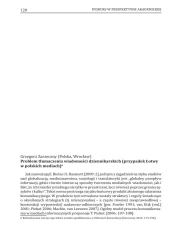 120 DYSKURS W PERSPEKTYWIE AKADEMICKIEJ Grzegorz Zarzeczny (Polska, Wrocław) Problem tłumaczenia wiadomości dziennikarskich (przypadek Łotwy w polskich mediach)6 Jak zauważają E. Bielsa i S. Bassnett [2009: 2], jednym z zagadnień na styku studiów nad globalizacją, medioznawstwa, socjologii i translatoryki jest „globalny przepływ informacji, gdzie równie istotne są sposoby tworzenia medialnych wiadomości, jak i fakt, że ich transfer przebiega nie tylko w przestrzeni, lecz również poprzez granice języków i kultur”. Tekst newsa postrzega się jako końcowy produkt złożonego zdarzenia komunikacyjnego. W produkcie tym utrwalone zostały struktury i reguły świadczące o określonych strategiach (tj. intencjonalnej – a często również niesprawiedliwej – konstrukcji wypowiedzi) nadawczo-odbiorczych [por. Fowler 1991; van Dijk (red.) 2001; Piekot 2006; Machin, van Leeuven 2007]. Ogólny model procesu komunikowania w mediach informacyjnych proponuje T. Piekot [2006: 107-108]: 6 Rozbudowana wersja tego tekstu została opublikowana w Obliczach Komunikacji [Zarzeczny 2012: 173-190]. STUDIA PRZYPADKÓW 121 (1.) W ramach pewnego kręgu kulturowego (2.) i w pewnych warunkach społecznych (3.) ktoś (osoba, instytucja) postrzega zdarzenia, (4.) dokonuje ich selekcji i interpretacji, (5.) aby je upowszechnić (6.) za pomocą dostępnych środków językowych (7.) z pewnymi intencjami (8.) oraz w pewnej formie. (9.) Odbiorca odczytuje i interpretuje ów tekst (10.) dzięki własnym umiejętnościom, (11.) uwzględniając własne potrzeby i oczekiwania, (12.) korzysta też z wiedzy o świecie i z osobistych doświadczeń (13.) oraz z informacji o faktach przekazanych przez inne źródła. (14.) W rezultacie tego procesu w umyśle nadawcy powstaje mentalny obraz zdarzeń opisywanych w tekście. W świecie globalnych agencji dziennikarskich ów produkt zdarzenia komunikacyjnego staje się częścią kolejnego procesu – tłumaczenia, w którego „centrum zainteresowania nie pojawia się zagadnienie ekwiwalencji językowej, lecz raczej przekształcenie informacji w sposób zgodny z oczekiwaniami nowych czytelników” [Bielsa, Bassnett 2009: 132]. Oczywiście „czytelnik oryginału i czytelnik przekładu należą do dwóch różnych społeczności językowych i kulturowych, nie mają więc tych samych doświadczeń, które są składnikiem wiedzy uprzedniej, z jaką przystępują do lektury; dzieli ich odmienność kodów kulturowych” [Skibińska, Cieński 2002: 5]. Ponadto nieuchronnie manipulacyjny charakter tłumaczenia może wyrażać (oraz utrwalać, jak i obalać) określone relacje nierówności w praktykach społecznych. Spośród wielu zagadnień wpływających na ostateczny kształt każdego tłumaczenia wiadomości, do najważniejszych należą relacje postkolonialne [por. Venuti 1995; Bassnett, Trivedi (ed.) 1999; Hatim, Munday 2004] oraz tłumaczenie ideologii [por. Hatim, Mason 1997]. Studium przypadku. Istnieją dwie wersje (Tekst A i Tekst C) angielskojęzycznej wiadomości opublikowanej przez rosyjską agencję informacyjną Ria Novosti7 oraz polskie tłumaczenie tej wiadomości (Tekst B) pochodzące z elektronicznego wydania Dziennika8. Opublikowany o 17.26 Tekst A informuje o zamiarze upamiętnienia niemieckich żołnierzy w byłym obozie koncentracyjnym: TEKST A (2) Latvia builds monument to German soldiers at former death camp (4) RIGA, September 25 (RIA Novosti) - Work on a monument to German soldiers who died in WWII is underway at the site of a former death camp in the small Latvian city of Salaspils, the Salaspils Vestis paper said on Thursday. (5) The city of Salaspils, located 18 km (11 miles) to the southeast of Latvia’s capital Riga, was home to the WWII Stalag-350-s camp for Soviet prisoners of war. (6) The newspaper said that the construction of the monument was being financed by the administration of the German city of Bremen. (7) According to documents presented at the Nuremberg Trials, over 100,000 people, including children, were killed at the Nazi death camp. Torture and ‘medical experiments’ were common. (8) Galina Mushtavinskaya, an activist from a pro-Russian movement in Latvia, said that surviving Salaspils death camp inmates regard the monument as “an outrage” and “an insult”. (10) A Soviet monument to the dead was unveiled at the camp in 1967. (13) Russia has repeatedly drawn the EU’s attention to what it calls Estonia and Latvia’s attempts to glorify Nazi Germany. It has also spoken out against their “discriminatory policies” with regard to ethnic Russians resident in the two former Soviet republics. (14) In spring of this year, Riga hosted a march by Waffen SS veterans, which involved over 200 Latvian Legion veterans and their supporters. The march passed through Riga under tight police security, and commemorated Latvians who had fought for the Nazis during WWII. co zostaje przetłumaczone i opublikowane po polsku jako Tekst B o godz. 18.51: 7 http://en.rian.ru/world/20080925/117104195.html; http://en.rian.ru/world/20080925/117109698.html 8 http://www.dziennik.pl/swiat/article243280/W_dawnym_obozie_postawia_pomnik_hitlerowcom.html 122 DYSKURS W PERSPEKTYWIE AKADEMICKIEJ TEKST B (1) Kontrowersyjna decyzja łotewskich władz (2) W dawnym obozie postawią pomnik hitlerowcom (4) Co można postawić w miejscu niemieckiego obozu zagłady? Władze łotewskie twierdzą, że najlepiej stworzyć tam pomnik żołnierzy... niemieckich, którzy zginęli w czasie II wojny światowej. (6) Prace w miasteczku Salaspils sfinansują władze niemieckiej Bremy. (8) „Dla tych, którzy przeżyli obóz zagłady w Salaspils ta decyzja to jeden wielki skandal” - krytykuje władze, w rosyjskiej agencji „Ria Novosti” Galina Musztawińskaja z rosyjskiej mniejszości na Łotwie. Bo nikt nie może zrozumieć dlaczego, za niemieckie pieniądze, na terenie dawnego obozu, tuż obok pomnika ofiar zagłady, stanie pomnik poświęcony ic