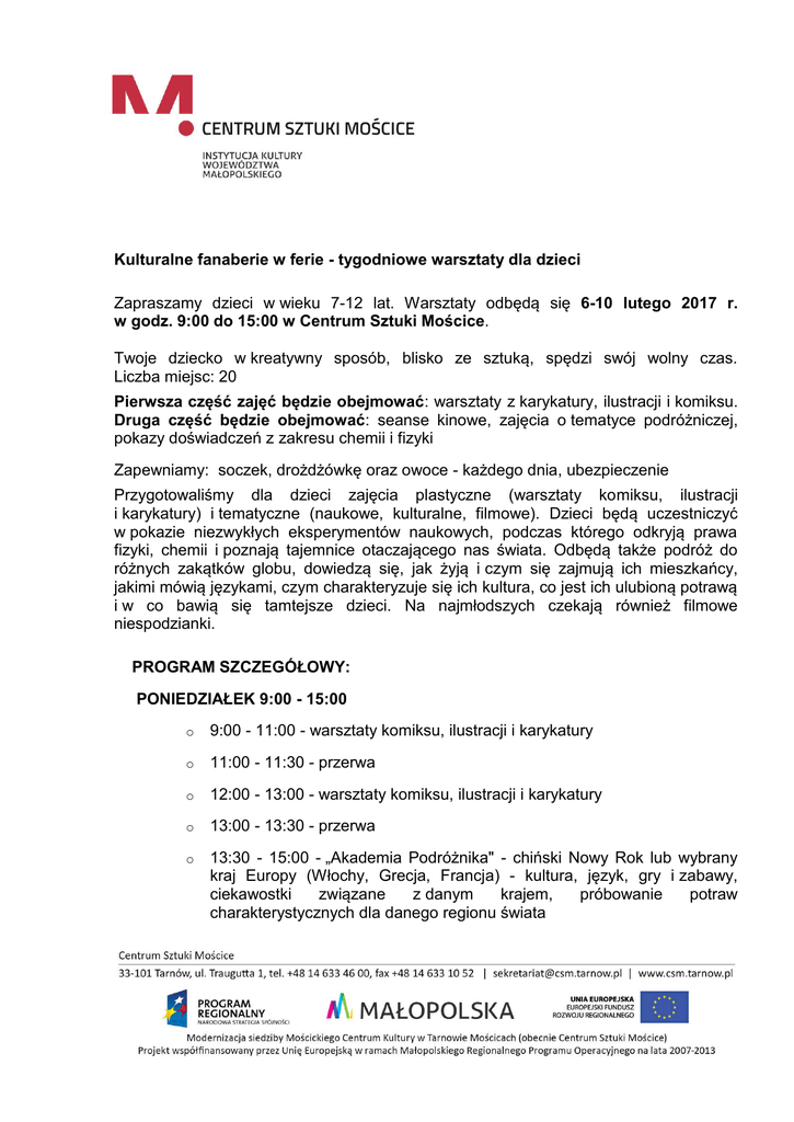 Kulturalne fanaberie w ferie - tygodniowe warsztaty dla dzieci Zapraszamy dzieci w wieku 7-12 lat. Warsztaty odbędą się 6-10 lutego 2017 r. w godz. 9:00 do 15:00 w Centrum Sztuki Mościce. Twoje dziecko w kreatywny sposób, blisko ze sztuką, spędzi swój wolny czas. Liczba miejsc: 20 Pierwsza część zajęć będzie obejmować: warsztaty z karykatury, ilustracji i komiksu. Druga część będzie obejmować: seanse kinowe, zajęcia o tematyce podróżniczej, pokazy doświadczeń z zakresu chemii i fizyki Zapewniamy: soczek, drożdżówkę oraz owoce - każdego dnia, ubezpieczenie Przygotowaliśmy dla dzieci zajęcia plastyczne (warsztaty komiksu, ilustracji i karykatury) i tematyczne (naukowe, kulturalne, filmowe). Dzieci będą uczestniczyć w pokazie niezwykłych eksperymentów naukowych, podczas którego odkryją prawa fizyki, chemii i poznają tajemnice otaczającego nas świata. Odbędą także podróż do różnych zakątków globu, dowiedzą się, jak żyją i czym się zajmują ich mieszkańcy, jakimi mówią językami, czym charakteryzuje się ich kultura, co jest ich ulubioną potrawą i w co bawią się tamtejsze dzieci. Na najmłodszych czekają również filmowe niespodzianki. PROGRAM SZCZEGÓŁOWY: PONIEDZIAŁEK 9:00 - 15:00 o 9:00 - 11:00 - warsztaty komiksu, ilustracji i karykatury o 11:00 - 11:30 - przerwa o 12:00 - 13:00 - warsztaty komiksu, ilustracji i karykatury o 13:00 - 13:30 - przerwa o 13:30 - 15:00 - „Akademia Podróżnika" - chiński Nowy Rok lub wybrany kraj Europy (Włochy, Grecja, Francja) - kultura, język, gry i zabawy, ciekawostki związane z danym krajem, próbowanie potraw charakterystycznych dla danego regionu świata WTOREK 9:00 - 15:00 o 9:00 - 11:00 - warsztaty komiksu, ilustracji i karykatury o 11:00 - 11:30 - przerwa o 12:00 - 13:00 - warsztaty komiksu, ilustracji i karykatury o 13:00 - 13:30 - przerwa o 13:30 - 15:00 - projekcja filmu ŚRODA 9:00 - 15:00 o 9:00 - 11:00 - warsztaty komiksu, ilustracji i karykatury o 11:00 - 11:30 - przerwa o 12:00 - 13:00 - warsztaty komiksu, ilustracji i karykatury o 13:00 - 13:30 - przerwa o 13:30 - 15:00 - „Odlotowe eksperymenty naukowe z TATE" - pokaz doświadczeń z dziedziny fizyki i chemii CZWARTEK 9:00 - 15:00 o 9:00 - 11:00 - warsztaty komiksu, ilustracji i karykatury o 11:00 - 11:30 - przerwa o 12:00 - 13:00 - warsztaty komiksu, ilustracji i karykatury o 13:00 - 13:30 - przerwa o 13:30 - 15:00 - projekcja filmu PIĄTEK 9:00 - 15:00 o 9:00 - 11:00 - warsztaty komiksu, ilustracji i karykatury o 11:00 - 11:30 - przerwa o 12:00 - 13:00 - warsztaty komiksu, ilustracji i karykatury o 13:00 - 13:30 - przerwa o 13:30 - 15:00 - „Akademia Podróżnika" - chiński Nowy Rok lub wybrany kraj Europy (Włochy, Grecja, Francja) - kultura, język, gry i zabawy, ciekawostki związane z danym krajem, próbowanie potraw charakterystycznych dla danego regionu świata Pierwszą część warsztatów poprowadzi Szymon Teluk - rysownik, karykaturzysta, malarz, autor komiksów. Wykładowca Ośrodka Postaw Twórczych we Wrocławiu i Uniwersytetu Zielonogórskiego. Prowadzi zajęcia z malarstwa, komiksu, ilustracji, rysunku koncepcyjnego i anatomicznego. Współtwórca kierunku studiów na Uniwersytecie Zielonogórskim: „Komiks i ilustracja z elementami concept art". Pracownik dydaktyczny na zlecenie instytucji kultury. Twórca działającego w całym kraju projektu: "Warsztaty komiksu, ilustracji i karykatury" popularyzującego komiks i rysunek wśród różnych grup wiekowych. Centrum Sztuki Mościce 6-10 lutego 2017 r. 9:00 do 15:00 Ul. Traugutta 1, 33 – 101 Tarnów Cena: 260 zł - od dziecka 230 zł - za każde dziecko z rodzeństwa(w przypadku, gdy zapisuje się więcej niż jedno dziecko) Zapisy i zakup biletów: Aby zapisać dziecko zadzwoń lub napisz do Anny Damian i Anny Sadowskiej: [email protected] lub 14 633 46 11 (od poniedziałku do piątku w godz. 8:00 - 16:00) [email protected] lub 14 633 46 21 Bilety będzie można zakupić w kasie PO UPRZEDNIM ZAPISANIU DZIECKA. Nie można zakupić biletu bez wcześniejszej rezerwacji miejsc pod wskazanym wyżej adresem.