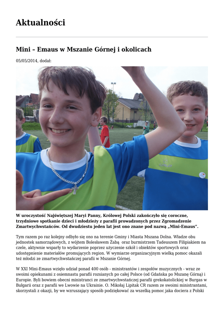 Aktualności Mini – Emaus w Mszanie Górnej i okolicach 05/05/2014, dodał: W uroczystość Najświętszej Maryi Panny, Królowej Polski zakończyło się coroczne, trzydniowe spotkanie dzieci i młodzieży z parafii prowadzonych przez Zgromadzenie Zmartwychwstańców. Od dwudziestu jeden lat jest ono znane pod nazwą „Mini-Emaus”. Tym razem po raz kolejny odbyło się ono na terenie Gminy i Miasta Mszana Dolna. Władze obu jednostek samorządowych, z wójtem Bolesławem Żabą oraz burmistrzem Tadeuszem Filipiakiem na czele, aktywnie wsparły to wydarzenie poprzez użyczenie szkół i obiektów sportowych oraz udostępnienie materiałów promujących region. W wymiarze organizacyjnym wielką pomoc okazali też młodzi ze zmartwychwstańczej parafii w Mszanie Górnej. W XXI Mini-Emaus wzięło udział ponad 400 osób - ministrantów i zespołów muzycznych - wraz ze swoimi opiekunami z osiemnastu parafii rozsianych po całej Polsce (od Gdańska po Mszanę Górną) i Europie. Byli bowiem obecni ministranci ze zmartwychwstańczej parafii grekokatolickiej w Burgas w Bułgarii oraz z parafii we Lwowie na Ukrainie. O. Mikołaj Lipitak CR razem ze swoimi ministrantami, skorzystali z okazji, by we wzruszający sposób podziękować za wszelką pomoc jaka dociera z Polski także do naszej parafii na lwowskich Zboiskach. Wszystkie wspólnoty radośnie prezentowały się każdego wieczoru i w ten sposób mogliśmy nieco przedłużyć atmosferę wielkanocnych spotkań ze Zmartwychwstałym Chrystusem oraz wyrazić swoją wdzięczność Bogu za dar kanonizacji dwóch wielkich papieży: Jana XXIII oraz Jana Pawła II – relacjonują organizatorzy. Okazją do tego były również codzienne Eucharystie. Pierwsza miała miejsce w gościnnych progach nowo wybudowanego kościoła p.w. Miłosierdzia Bożego w Mszanie Dolnej. Tamtejszy proboszcz, ks. Tadeusz Mrowiec z radością przyjął zmartwychwstańczych ministrantów i schole w prowadzonej przez siebie parafii. Młodzi wzięli udział w uroczystej, procesyjnej inauguracji nabożeństw majowych. Podczas Mszy św. o. Mariusz Mazur CR, jeden z poprzednich duszpasterzy powołań (obecnie proboszcz na poznańskich Smochowicach), w swoim kazaniu zachęcał młodzież do żywej wiary w Jezusa Chrystusa, z której płynie prawdziwa radość. Do tej radości, następnego dnia, nawiązał też w homilii o. Tomasz Baniak CR, jeden z głównych organizatorów Zmartwychwstańczych Spotkań Młodych w Gdańsku. Wskazał, że prawdziwa radość płynąca od Zmartwychwstałego, znajduje swe uwidocznienie w codziennej służbie. Nie tylko przy ołtarzu, ale w każdej życiowej sytuacji. Natomiast o. Wiesław Śpiewak CR, prowincjał Polskiej Prowincji Zmartwychwstańców, który przewodniczył Mszy św. na zakończenie XXI Mini-Emaus, mówił o pięknie tego świata, przywołując malownicze krajobrazy otaczające Mszanę Dolną. Powinno to być inspiracją do poszukiwania piękna w sobie i do bycia pięknym, takim jakim stworzył nas Bóg mówił Ojciec Prowincjał. O. Śpiewak, po Mszy św. uhonorował medalami i pucharami zwycięzców sportowych zmagań, które były istotną częścią XXI Mini-Emaus. Było ich niemal 150. W rozgrywkach brali udział zarówno chłopcy, jak i dziewczęta. Każdy w swej kategorii wiekowej. Nad sprawiedliwym przebiegiem konkurencji sportowych czuwali miejscowi nauczyciele wychowania fizycznego. Było co robić ponieważ młodzież i dzieci startowały w różnych rozgrywkach. Były to: koszykówka, tenis stołowy, zawody lekkoatletyczne i oczywiście turniej piłki nożnej, w którym zwyciężyli ministranci z Krakowa z Woli Duchackiej w kategorii młodszej oraz przedstawiciele służby liturgicznej z Kościerzyny i Koniecpola w starszej kategorii. Niektórzy doczekali się miana „złotych chłopaków”, zdobywając trzy złote krążki. Ów entuzjazm i energia, które pięknie ujawniły się podczas sportowych zmagań, w twórczy sposób ujawniają się też na co dzień w miejscach, do których młodzi dziś powrócili. Jednak za rok pojawią się znów w Mszanie Dolnej. Dobrze im tu było, podobnie jak uczniom w Emaus, do których w gościnę przyszedł Jezus. Teraz wrócili ogłaszać, że oni też wiedzieli Pana. ks. Jan Kaczmarek CR dyrektor Centrum Powołaniowego „Emaus” w Mszanie Górnej