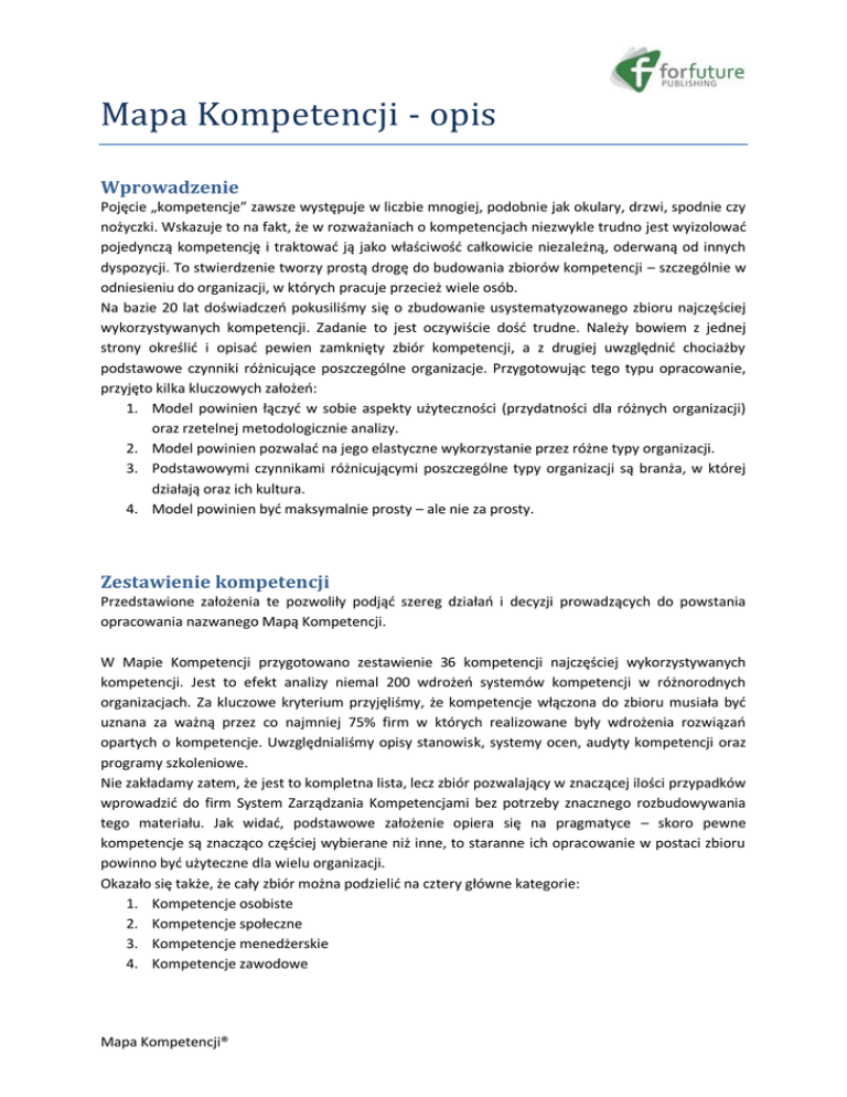 Mapa Kompetencji - opis Wprowadzenie Pojęcie „kompetencje” zawsze występuje w liczbie mnogiej, podobnie jak okulary, drzwi, spodnie czy nożyczki. Wskazuje to na fakt, że w rozważaniach o kompetencjach niezwykle trudno jest wyizolować pojedynczą kompetencję i traktować ją jako właściwość całkowicie niezależną, oderwaną od innych dyspozycji. To stwierdzenie tworzy prostą drogę do budowania zbiorów kompetencji – szczególnie w odniesieniu do organizacji, w których pracuje przecież wiele osób. Na bazie 20 lat doświadczeń pokusiliśmy się o zbudowanie usystematyzowanego zbioru najczęściej wykorzystywanych kompetencji. Zadanie to jest oczywiście dość trudne. Należy bowiem z jednej strony określić i opisać pewien zamknięty zbiór kompetencji, a z drugiej uwzględnić chociażby podstawowe czynniki różnicujące poszczególne organizacje. Przygotowując tego typu opracowanie, przyjęto kilka kluczowych założeń: 1. Model powinien łączyć w sobie aspekty użyteczności (przydatności dla różnych organizacji) oraz rzetelnej metodologicznie analizy. 2. Model powinien pozwalać na jego elastyczne wykorzystanie przez różne typy organizacji. 3. Podstawowymi czynnikami różnicującymi poszczególne typy organizacji są branża, w której działają oraz ich kultura. 4. Model powinien być maksymalnie prosty – ale nie za prosty. Zestawienie kompetencji Przedstawione założenia te pozwoliły podjąć szereg działań i decyzji prowadzących do powstania opracowania nazwanego Mapą Kompetencji. W Mapie Kompetencji przygotowano zestawienie 36 kompetencji najczęściej wykorzystywanych kompetencji. Jest to efekt analizy niemal 200 wdrożeń systemów kompetencji w różnorodnych organizacjach. Za kluczowe kryterium przyjęliśmy, że kompetencje włączona do zbioru musiała być uznana za ważną przez co najmniej 75% firm w których realizowane były wdrożenia rozwiązań opartych o kompetencje. Uwzględnialiśmy opisy stanowisk, systemy ocen, audyty kompetencji oraz programy szkoleniowe. Nie zakładamy zatem, że jest to kompletna lista, lecz zbiór pozwalający w znaczącej ilości przypadków wprowadzić do firm System Zarządzania Kompetencjami bez potrzeby znacznego rozbudowywania tego materiału. Jak widać, podstawowe założenie opiera się na pragmatyce – skoro pewne kompetencje są znacząco częściej wybierane niż inne, to staranne ich opracowanie w postaci zbioru powinno być użyteczne dla wielu organizacji. Okazało się także, że cały zbiór można podzielić na cztery główne kategorie: 1. Kompetencje osobiste 2. Kompetencje społeczne 3. Kompetencje menedżerskie 4. Kompetencje zawodowe Mapa Kompetencji® Tab 1. Zestawienie kompetencji w podziale na kategorie KOMPETENCJE KOMPETENCJE KOMPETENCJE SPOŁECZNE OSOBISTE MENEDŻERSKIE Budowanie relacji Dążenie do rezultatów Budowanie sprawnej (przedsiębiorczość) organizacji Dzielenie się wiedzą i doświadczeniem Innowacyjność i elastyczność Budowanie zespołów KOMPETENCJE ZAWODOWE Administracja /prowadzenie dokumentacji Negocjowanie Identyfikacja z firmą Myślenie analityczne Delegowanie Orientacja w biznesie Komunikatywność Samodzielność Motywowanie Procedury – znajomość i stosowanie Orientacja na klienta Podejmowanie decyzji Myślenie strategiczne Umiejętności IT Praca zespołowa /współpraca w zespole Rozwiązywanie problemów Planowanie Umiejętności techniczne Rozwiązywanie konfliktów Sumienność/rzetelność Przywództwo Wiedza zawodowa Współpraca wewnątrz firmy Rozwój zawodowy /gotowość do uczenia się Zarządzanie sobą Zarządzanie projektami Zarządzanie procesami Zarządzanie zespołem Znajomość języków obcych Wywieranie wpływu Źródło: opracowanie własne. Każda z kompetencji podstawowych zamieszczonych w zestawieniu posiada: Nazwę, definicję oraz wskaźniki – jakiego rodzaju zachowania składają się na opis danej kompetencji, skalę obserwacyjną – każdy wskaźnik opisany na pięciu poziomach przyswojenia, wskazówki rozwojowe, pytania do testu kompetencyjnego, pytania do wywiadu kwalifikacyjnego. Uznajemy bowiem, że dopiero taki materiał może być w pełni użyteczny dla organizacji. Tab 2. Lista kompetencji podstawowych z definicjami NAZWA KOMPETENCJI DEFINICJA KOMPETENCJI Sprawna realizacja zadań administracyjno-organizacyjnych. Zgodne z 1. Administrowanie /prowadzenie dokumentacji formalnymi wymogami prowadzenie dokumentacji. Gromadzenie 2. Budowanie i rozwój organizacji 3. Budowanie relacji Mapa Kompetencji® oraz zapewnianie wymiany informacji umożliwiające efektywną organizację pracy. Podejmowanie działań mających na celu doskonalenie funkcjonowania organizacji i zapewnienie jej jak największej efektywności. Nawiązywanie i budowanie dobrych relacji. Dbałość o kontakty i efektywną współpracę. Pozyskiwanie zaufania i poparcia współpracowników. 4. Budowanie zespołów 5. Dążenie do rezultatów /przedsiębiorczość 6. Delegowanie 7. Dzielenie się wiedzą i doświadczeniem Identyfikacja z firmą 8. 9. Innowacyjność i elastyczność 10. Język obcy 11. Komunikatywność 12. Motywowanie 13. Myślenie analityczne 14. Myślenie strategiczne 15. Negocjowanie 16. Orientacja na klienta 17. Orientacja w biznesie 18. Planowanie 19. Podejmowanie decyzji 20. Praca zespołowa 21. 22. Procedury – znajomość i stosowanie Przywództwo 23. Rozwiązywanie konfliktów Mapa Kompetencji® Dobór odpowiednich ludzi. Tworzenie, integrowanie i organizowanie działań zespołu. Dążenie do osiągnięcia wyznaczonych celów. Podejmowanie działań ukierunkowanych na doskonalenie przebiegu pracy. Pozytywne nastawienie do pracy oraz wychodzenie naprzeciw trudnościom i szukanie nowych wyzwań. Przekazywanie pracownikom zadań do wykonania. Zapewnienie odpowiednich informacji i uprawnień oraz wsparcia niezbędnego do ich realizacji. Przekazywanie praktycznej wiedzy i porad w sposób użyteczny, ułatwiający