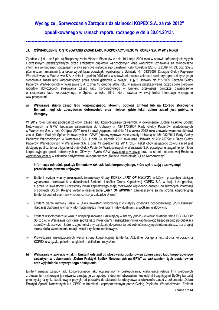 Wyciąg ze „Sprawozdania Zarządu z działalności KOPEX S.A. za rok 2012” opublikowanego w ramach raportu rocznego w dniu 30.04.2013r. --------------------------------------------------------------------------------------------------------------„4. OŚWIADCZENIE O STOSOWANIU ZASAD ŁADU KORPORACYJNEGO W KOPEX S.A. W 2012 ROKU Zgodnie z § 91 ust.5 pkt. 4) Rozporządzenia Ministra Finansów z dnia 19 lutego 2009 roku w sprawie informacji bieżących i okresowych przekazywanych przez emitentów papierów wartościowych oraz warunków uznawania za równoważne informacji wymaganych przepisami prawa państwa niebędącego państwem członkowskim (Dz. U. z 2009, Nr 33, poz. 259 z późniejszymi zmianami ), a także wypełniając obowiązki wynikające z Uchwały Nr 1013/2007 Zarządu Giełdy Papierów Wartościowych w Warszawie S.A. z dnia 11 grudnia 2007 roku w sprawie określenia zakresu i struktury raportu dotyczącego stosowania zasad ładu korporacyjnego przez spółki giełdowe w związku z § 2 Uchwały Nr 718/2009 Zarządu Giełdy Papierów Wartościowych w Warszawie S.A. z dnia 16 grudnia 2009 roku w sprawie przekazywania przez spółki giełdowe raportów dotyczących stosowania zasad ładu korporacyjnego – Emitent przekazuje poniższe oświadczenie o stosowaniu ładu korporacyjnego w Spółce w roku 2012, które zawiera w swej treści informacje wymagane w/w przepisami. a) Wskazanie zbioru zasad ładu korporacyjnego, któremu podlega Emitent lub na którego stosowanie Emitent mógł się zdecydować dobrowolnie oraz miejsce, gdzie tekst zbioru zasad jest publicznie dostępny. W 2012 roku Emitent podlegał zbiorowi zasad ładu korporacyjnego zawartych w dokumencie „Dobre Praktyki Spółek Notowanych na GPW” będącym załącznikiem do Uchwały nr 12/1170/2007 Rady Giełdy Papierów Wartościowych w Warszawie S.A. z dnia 04 lipca 2007 roku i obowiązującemu od dnia 01 stycznia 2012 roku znowelizowanemu zbiorowi zasad „Dobre Praktyki Spółek Notowanych na GPW” (zmiany wprowadzone zostały Uchwałą nr 15/1282/2011 Rady Giełdy Papierów Wartościowych w Warszawie S.A. z dnia 31 sierpnia 2011 roku oraz Uchwałą nr 20/1287/2011 Rady Giełdy Papierów Wartościowych w Warszawie S.A. z dnia 19 października 2011 roku). Tekst obowiązującego zbioru zasad jest dostępny publicznie na oficjalnej stronie Giełdy Papierów Wartościowych w Warszawie S.A. poświęconej zagadnieniom ładu korporacyjnego spółek notowanych na Głównym Rynku GPW www.corp-gov.gpw.pl oraz na stronie internetowej Emitenta www.kopex.com.pl w zakładce dedykowanej akcjonariuszom „Relacje inwestorskie” /„Ład Korporacyjny”. Informacja odnośnie praktyk Emitenta w zakresie ładu korporacyjnego, które wykraczają poza wymogi przewidziane prawem krajowym. • Emitent wydaje własny miesięcznik internetowy Grupy KOPEX „ART OF MINING”, w którym prezentuje bieżące wydarzenia i ciekawostki z działalności Emitenta i spółek Grupy Kapitałowej KOPEX S.A. w kraju i za granicą, a przez to inwestorzy i uczestnicy rynku kapitałowego mają możliwość większego dostępu do bieżących informacji o spółkach Grupy. Kolejne wydania miesięcznika „ART OF MINING”, zamieszczone są na stronie korporacyjnej Emitenta pod adresem www.kopex.com.pl w zakładce „Firma”; • Emitent bierze aktywny udział w „Akcji Inwestor” stworzonej z inicjatywy dziennika gospodarczego „Puls Biznesu” i będącej platformą wymiany informacji między inwestorami indywidualnymi, a spółkami giełdowymi. • Emitent współorganizuje wraz z wyspecjalizowaną i działającą w branży public i investor relations firmą CC GROUP Sp. z o.o. w Warszawie cykliczne spotkania z inwestorami i analitykami rynku kapitałowego bezpośrednio po publikacji raportów okresowych, które to z jednej strony są okazją do poznania potrzeb informacyjnych interesariuszy, a z drugiej strony służą wzmacnianiu relacji i więzi z rynkiem kapitałowym. • Prowadzenie wielojęzycznych wersji strony korporacyjnej Emitenta. Aktualnie dostępna jest strona korporacyjna KOPEX-u w języku polskim, angielskim, chińskim i rosyjskim. b) Wskazanie w zakresie w jakim Emitent odstąpił od stosowania postanowień zbioru zasad ładu korporacyjnego zawartych w dokumencie „Dobre Praktyki Spółek Notowanych na GPW” ze wskazaniem tych postanowień oraz wyjaśnienie przyczyn tego odstąpienia. Emitent uznając zasady ładu korporacyjnego jako etyczne normy postępowania, kształtujące relacje firm giełdowych z otoczeniem rynkowym jak również uznając je za zgodne z dobrymi obyczajami kupieckimi i czyniącymi Spółkę bardziej przejrzystą na rynku kapitałowym przyjęła od początku do stosowania zdecydowaną większość zasad z dokumentu „Dobre Praktyki Spółek Notowanych Na GPW” w brzmieniu zaproponowanym przez Giełdę Papierów Wartościowych. Emitent Strona 1 z 13 zgodnie z podejściem „przestrzegaj lub wyjaśnij” w odniesieniu do nielicznych zasad, które w Spółce nie są (w części lub w całości) i do odwołania nie będą stosowane Spółka publikowała raporty bieżące, a także odnosiła się do nich w „Oświadczeniach o stosowaniu w „KOPEX” S.A. zasad ładu korporacyjnego” zamieszczanych w ramach raportów rocznych za lata 2008-2011. W związku opublikowanym raportem bieżącym EBI nr 1/2012 z dnia 11.10.2012 w którym Emitent poinformował o powołaniu przez Radę Nadzorczą Komitetu Audytu oraz o ustaniu tym samym stanu nieprzestrzegania zasad ładu korporacyjnego, o których mowa w części III. pkt. 8., a także w części III. pkt. 6. „Dobrych Praktyk Spółek Notowanych na GPW”, co do których wcześniej „KOPEX” S.A. oświadczył, iż nie są i nie będą do odwołania stosowane, Emitent w niniejszym oświadczeniu zasad tych nie wymienia jako niestosowane w 2012 roku. Informacje dotyczące zasad ładu korporacyjnego jak i raporty EBI Spółki w zakresie ładu korporacyjnego, E