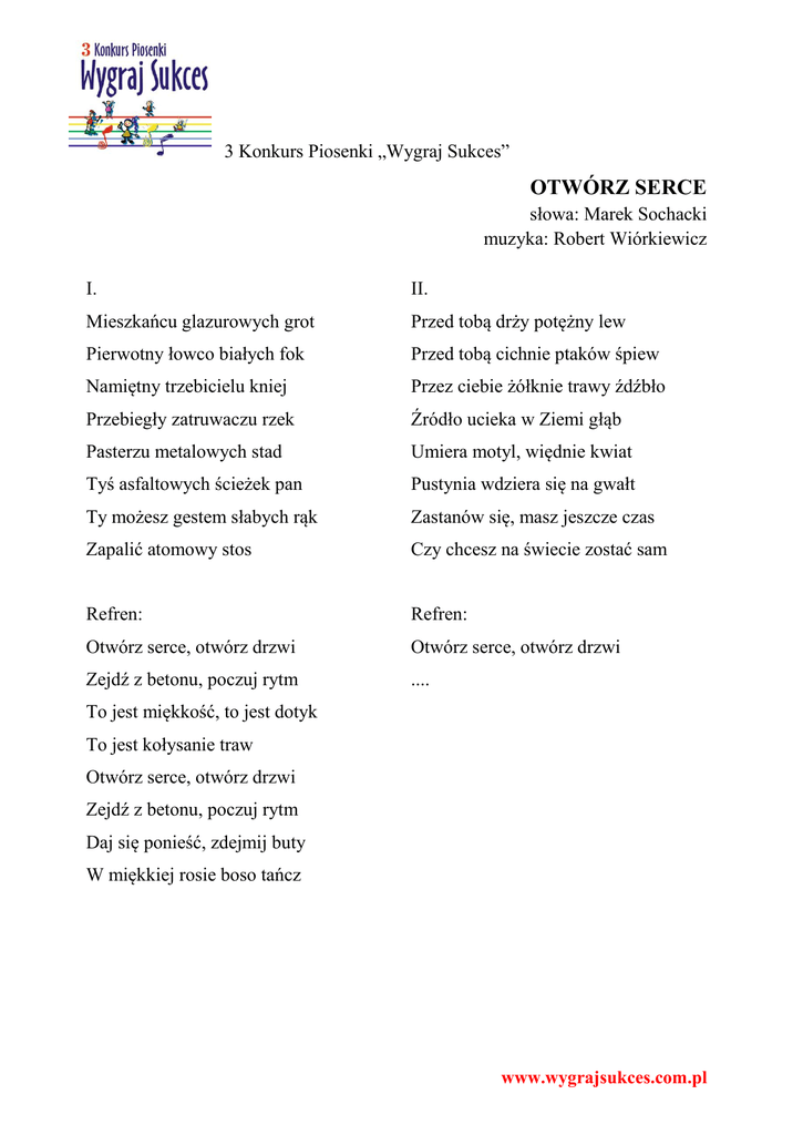 3 Konkurs Piosenki „Wygraj Sukces” OTWÓRZ SERCE słowa: Marek Sochacki muzyka: Robert Wiórkiewicz I. II. Mieszkańcu glazurowych grot Przed tobą drży potężny lew Pierwotny łowco białych fok Przed tobą cichnie ptaków śpiew Namiętny trzebicielu kniej Przez ciebie żółknie trawy źdźbło Przebiegły zatruwaczu rzek Źródło ucieka w Ziemi głąb Pasterzu metalowych stad Umiera motyl, więdnie kwiat Tyś asfaltowych ścieżek pan Pustynia wdziera się na gwałt Ty możesz gestem słabych rąk Zastanów się, masz jeszcze czas Zapalić atomowy stos Czy chcesz na świecie zostać sam Refren: Refren: Otwórz serce, otwórz drzwi Otwórz serce, otwórz drzwi Zejdź z betonu, poczuj rytm .... To jest miękkość, to jest dotyk To jest kołysanie traw Otwórz serce, otwórz drzwi Zejdź z betonu, poczuj rytm Daj się ponieść, zdejmij buty W miękkiej rosie boso tańcz www.wygrajsukces.com.pl