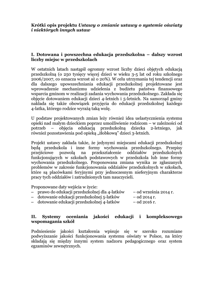 Krótki opis projektu Ustawy o zmianie ustawy o systemie oświaty i niektórych innych ustaw I. Dotowana i powszechna edukacja przedszkolna – dalszy wzrost liczby miejsc w przedszkolach W ostatnich latach nastąpił ogromny wzrost liczby dzieci objętych edukacją przedszkolną (o 250 tysięcy więcej dzieci w wieku 3-5 lat od roku szkolnego 2006/2007, co oznacza wzrost aż o 20%). W celu utrzymania tej tendencji oraz dla dalszego upowszechniania edukacji przedszkolnej projektowane jest wprowadzenie mechanizmu udzielenia z budżetu państwa finansowego wsparcia gminom w realizacji zadania wychowania przedszkolnego. Zakłada się objęcie dotowaniem edukacji dzieci 4-letnich i 5-letnich. Na samorząd gminy nakłada się także obowiązek przyjęcia do edukacji przedszkolnej każdego 4-latka, którego rodzice wyrażą taką wolę. U podstaw projektowanych zmian leży również idea uelastycznienia systemu opieki nad małym dzieckiem poprzez umożliwienie rodzicom – w zależności od potrzeb – objęcia edukacją przedszkolną dziecka 2-letniego, jak również pozostawienia pod opieką „żłobkową” dzieci 3-letnich. Projekt ustawy zakłada także, że jedynymi miejscami edukacji przedszkolnej będą przedszkola i inne formy wychowania przedszkolnego. Przepisy przejściowe pozwolą na przekształcenie oddziałów przedszkolnych funkcjonujących w szkołach podstawowych w przedszkola lub inne formy wychowania przedszkolnego. Proponowana zmiana wynika ze zgłaszanych problemów w zakresie funkcjonowania oddziałów przedszkolnych w szkołach, które są placówkami feryjnymi przy jednoczesnym nieferyjnym charakterze pracy tych oddziałów i zatrudnionych tam nauczycieli. Proponowane daty wejścia w życie: – prawo do edukacji przedszkolnej dla 4-latków – dotowanie edukacji przedszkolnej 5-latków – dotowanie edukacji przedszkolnej 4-latków II. Systemy oceniania wspomagania szkół jakości – od września 2014 r. – od 2014 r. – od 2016 r. edukacji i kompleksowego Podniesienie jakości kształcenia wpisuje się w szeroko rozumiane podwyższanie jakości funkcjonowania systemu oświaty w Polsce, na który składają się między innymi system nadzoru pedagogicznego oraz system egzaminów zewnętrznych. Minister Edukacji Narodowej Naczelny Inspektor Jakości Edukacji (Sekretarz Stanu lub Podsekretarz Stanu) Krajowy Ośrodek Jakości Edukacji wymaganie Sieć Regionalnych Ośrodków Jakości Edukacji Krajowy Ośrodek Rozwoju Edukacji wspomaganie Sieć Lokalnych Centrów Rozwoju Edukacji Celem zmian w systemie oświaty w zakresie nadzoru pedagogicznego oraz doskonalenia nauczycieli jest budowa nowoczesnego systemu, obejmującego z jednej strony jednoznaczne określenie wymagań (wraz z badaniem poziomu ich realizacji), z drugiej zaś oferującego szkołom powszechnie dostępne i profesjonalnie zorganizowane, kompleksowe wspomaganie w rozwoju. Zmiana w nadzorze pedagogicznym polegać będzie na tym, że ewaluację i kontrolę zewnętrzną w szkołach i placówkach, nad którymi nadzór pedagogiczny sprawuje obecnie kurator oświaty, będą prowadzić jednostki zajmujące się badaniem jakości pracy szkół. Powstaną one na bazie obecnych zasobów kadrowych i lokalowych – centralnej i okręgowych – komisji egzaminacyjnych oraz kuratoriów oświaty. Zadania kuratora oświaty będą nadal realizowane. Te wynikające ze sprawowania nadzoru pedagogicznego od września 2012 roku przejmą regionalne ośrodki jakości edukacji - które mieścić się będą w każdym województwie – ze stojącym na ich czele regionalnym inspektorem jakości edukacji. Pozostałe zadania będą wykonywane przez wojewodów. Efektem funkcjonowania nowego nadzoru pedagogicznego będzie zbieranie, w jednolitej w całym kraju formie, informacji o jakości pracy szkół, w tym informacji o wynikach egzaminów zewnętrznych. Będą one powszechnie dostępne dla dyrektorów placówek i rodziców. Informacje te będą także narzędziem służącym prowadzeniu polityki oświatowej na poziomie samorządu, regionu i kraju. Proponowane zmiany w organizacji systemu oceniania jakości edukacji są wynikiem przeprowadzonych konsultacji. W dyskusji akceptowano konieczność powstania profesjonalnych instytucji, wyspecjalizowanych w ocenianiu jakości pracy szkół, połączonych z systemem egzaminów zewnętrznych. Zwrócono jednak uwagę, że sieć tych instytucji powinna być spójna z podziałem administracyjnym kraju. Ważne jest, aby regionalne ośrodki jakości edukacji były instytucjami, których zadaniem będzie - podobnie jak obecnie okręgowych 2 komisji egzaminacyjnych - ustalanie i udostępnianie opinii publicznej rzetelnej informacji na temat pracy szkół. W jednej ustawie zostanie opisany zarówno nowy system oceniania jakości pracy szkół, jak i nowy system ich wspomagania. System kompleksowego wspomagania szkół w rozwoju będzie opierać się na centrach rozwoju edukacji. Zakłada się, że do 2016 roku w każdym powiecie będzie funkcjonować centrum rozwoju edukacji – powstałe z połączenia zadań poradni psychologicznopedagogicznej, placówki doskonalenia nauczycieli i biblioteki pedagogicznej. Centra rozwoju edukacji będą mogły być prowadzone przez wszystkie jednostki samorządu terytorialnego oraz przez organy niepubliczne. Docelowo zmieni się sposób subwencjonowania ich zadań na proporcjonalny do liczby obejmowanych opieką szkół i uczniów. Obowiązkiem szkoły będzie dokonanie wyboru centrum rozwoju edukacji (które będzie sprawować nad nią opiekę) i podpisanie z nim kontraktu określającego zarówno obszary standardowego wspomagania, jak i szczególnego wspomagania w danym roku szkolnym. III. Zmiany dotyczące specjalnych potrzeb edukacyjnych Główna zmiana w tym obszarze to możliwość objęcia małych dzieci wczesnym wspomaganiem rozwoju już od stwierdzenia zagrożenia niepełnosprawnością, a nie – jak dotychczas - dopiero po wykryciu niepełnosprawnośc