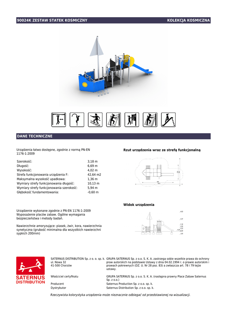 90024K ZESTAW STATEK KOSMICZNY KOLEKCJA KOSMICZNA DANE TECHNICZNE Urządzenia łatwo dostępne, zgodnie z normą PN-EN 1176-1:2009 Szerokość: Długość: Wysokość: Strefa funkcjonowania urządzenia F: Maksymalna wysokość upadkowa: Wymiary strefy funkcjonowania długość: Wymiary strefy funkcjonowania szerokość: Głębokość fundamentowania: Rzut urządzenia wraz ze strefą funkcjonalną 3,18 m 6,69 m 4,02 m 42,64 m2 1,36 m 10,13 m 5,94 m -0,60 m Widok urządzenia Urządzenie wykonane zgodnie z PN-EN 1176:1-2009 Wyposażenie placów zabaw. Ogólne wymagania bezpieczeństwa i metody badań. Nawierzchnie amoryzujące: piasek, żwir, kora, nawierzchnia synetyczna (grubość minimalna dla wszystkich nawierzchni sypkich 200mm) SATERNUS DISTRIBUTION Sp. z o. o. sp. k. GRUPA SATERNUS Sp. z o.o. S. K. A. zastrzega sobie wszelkie prawa do ochrony ul. Nowa 32 praw autorskich na podstawie Ustawy z dnia 04.02.1994 r. o prawie autorskim i 41-500 Chorzów prawach pokrewnych (DZ. U. Nr 28 poz. 83) a zwłaszcza art. 78 i 79 tejże ustawy. Właściciel certyfikatu Producent Dystrybutor GRUPA SATERNUS Sp. z o.o. S. K. A. (następna prawny Place Zabaw Saternus Sp. z o.o.) Saternus Production Sp. z o.o. sp. k. Saternus Distribution Sp. z o.o. sp. k. Rzeczywista kolorystyka urządzenia może nieznacznie odbiegać od przedstawionej na wizualizacji. SKŁAD URZĄDZENIA Drabinka pionowa dwuszczeblowa: Drabinka pionowa jednoszczeblowa: Linarium ukośne wys. 90cm: Maszt z żaglem: Rura strażacka wys. 90cm: Ścianka wspinaczkowa wys. 90cm: Tablica rysunkowa: Wieża bez dachu, podest wys. 136 cm: Wieża bez dachu, podest wys. 20 cm: Wieża bez dachu, podest wys. 50 cm: Wieża bez dachu, podest wys. 90 cm: Zjeżdżalnia wys. 136 cm: MATERIAŁY 1 1 2 1 1 2 1 1 3 1 1 1 Elementy połaciowe: Elementy stalowe: Fundamenty: Kotwy: Liny: Nogi konstrukcyjne: Podesty, schody: Ścianka wspinaczkowa: Ślizg: Tablica rysunkowa: Zaślepki: płyty HDPE stal cynkowana cynkoprimem, malowana proszkowo beton klasy min. C12/15 stal ocynkowana kąpielowo polipropylenowe, wielooplotowe o grubości min. 16 mm, z rdzeniem stalowym, niepalne połączone ze sobą poprzez plastikowe łączniki profile stalowe ocynkowane cynkoprimem, malowane proszkowo konstrukcja samonośna,powlekana materiałem antypoślizgowym sklejka wodoodporna szalunkowa, uchwyty alpinistyczne z tworzywa opartego na żywicach stal nierdzewna sklejka wodoodporna szalunkowa gr. 15mm, malowana farbą tablicową tworzywo sztuczne SATERNUS DISTRIBUTION Sp. z o. o. sp. k. GRUPA SATERNUS Sp. z o.o. S. K. A. zastrzega sobie wszelkie prawa do ochrony ul. Nowa 32 praw autorskich na podstawie Ustawy z dnia 04.02.1994 r. o prawie autorskim i 41-500 Chorzów prawach pokrewnych (DZ. U. Nr 28 poz. 83) a zwłaszcza art. 78 i 79 tejże ustawy. Właściciel certyfikatu Producent Dystrybutor GRUPA SATERNUS Sp. z o.o. S. K. A. (następna prawny Place Zabaw Saternus Sp. z o.o.) Saternus Production Sp. z o.o. sp. k. Saternus Distribution Sp. z o.o. sp. k. Rzeczywista kolorystyka urządzenia może nieznacznie odbiegać od przedstawionej na wizualizacji.