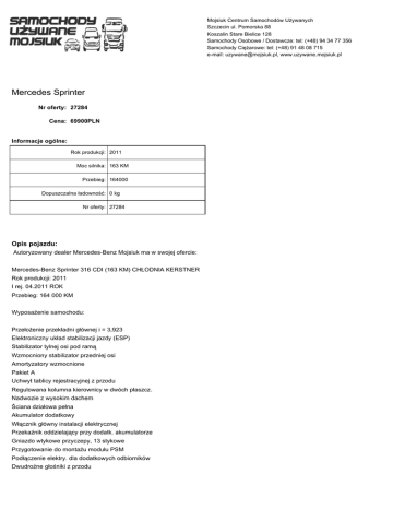 Mojsiuk Centrum Samochodów Używanych Szczecin ul. Pomorska 88 Koszalin Stare Bielice 128 Samochody Osobowe / Dostawcze: tel: (+48) 94 34 77 356 Samochody Ciężarowe: tel: (+48) 91 48 08 715 e-mail: [email protected], www.uzywane.mojsiuk.pl Mercedes Sprinter Nr oferty: 27284 Cena: 69900PLN Informacje ogólne: Rok produkcji: 2011 Moc silnika: 163 KM Przebieg: 164000 Dopuszczalna ładowność: 0 kg Nr oferty: 27284 Opis pojazdu: Autoryzowany dealer Mercedes-Benz Mojsiuk ma w swojej ofercie: Mercedes-Benz Sprinter 316 CDI (163 KM) CHŁODNIA KERSTNER Rok produkcji: 2011 I rej. 04.2011 ROK Przebieg: 164 000 KM Wyposażenie samochodu: Przełożenie przekładni głównej i = 3,923 Elektroniczny układ stabilizacji jazdy (ESP) Stabilizator tylnej osi pod ramą Wzmocniony stabilizator przedniej osi Amortyzatory wzmocnione Pakiet A Uchwyt tablicy rejestracyjnej z przodu Regulowana kolumna kierownicy w dwóch płaszcz. Nadwozie z wysokim dachem Ściana działowa pełna Akumulator dodatkowy Włącznik główny instalacji elektrycznej Przekaźnik oddzielający przy dodatk. akumulatorze Gniazdo wtykowe przyczepy, 13 stykowe Przygotowanie do montażu modułu PSM Podłączenie elektry. dla dodatkowych odbiorników Dwudrożne głośniki z przodu Przygotowanie do montażu radia Ułatwienie rozruchu System Parktronic (PTS) Spryskiwacze reflektorów Lusterka zewnętrzne sterowane i ogrzewane elek. Półka nad przednią szybą Alarm antywłamaniowy Skrzynia manualna 6-biegowa ECO Gear 360 Ogrzewanie siedzenia kierowcy Klimatyzacja półautomatyczna TEMPMATIC Sprinter standard Szybkościomierz ze skalą w kilometrach Wskaźnik temperatury zewnętrznej Filtr paliwa z separatorem wody i grzałką 600W Światła przeciwmgłowe halogenowe Boczne światła pozycyjne Trzecie światło hamowania Panel w podsufitce z dwoma światłami punktowymi Adaptacyjne światła stop Reflektory Bi-ksen., doświetlenie kierunku skrętu Alternator 14 V / 180 A Silnik OM 651 DE 22 LA 120 kW (163 KM) 3800/min Wersja silnika Euro V Tempomat Dodatkowe koło pasowe z mocowaniem pod sprężarkę Hak holowniczy kulowy, zdejmowany Mocowanie koła zapasowego pod końcem ramy Koło zapasowe Opony bez wyboru producenta Ogumienie 235/65 R16 C Opony letnie Stalowe obręcze 6,5 J x 16 Rezygnacja z uszczelniacza opon i sprężarki Podłokietnik dla siedzenia kierowcy Siedzenie pasażera dwuosobowe Obniżona skrzynka fotela kierowcy Poduszka powietrzna kierowcy Siedzenie kierowcy komfortowe, hydrau. resorowane Drzwi przesuwne prawe, specjalne wykonanie Drzwi przesuwne po prawej stronie Uchwyt do wsiadania przy drzwiach przesuwnych Tapicerka materiałowa „Lima” czarna Tabliczki i dokumentacja w języku niemieckim Generacja modelu 0 Podnośnik samochodowy hydrauliczny Dopuszczenie jako pojazd użytkowy UE Biel arktyczna Tapicerka zgodnie z wyborem Trójkąt ostrzegawczy Gaśnica Transport do dealera Usługi magazynowe Apteczka Sprinter 3.. rozstaw 3665 mm Bezwypadkowy Serwisowany Zadbany Jeden właściciel Niniejsze ogłoszenie jest wyłącznie informacją handlową i nie stanowi oferty w myśl art. 66, § 1. Kodeksu Cywilnego. Sprzedający nie odpowiada za ewentualne błędy lub nieaktualność ogłoszenia. KONTAKT HANDLOWY: TEL. 692-409-582 TEL. 795-142-622 Jeżeli w naszej ofercie nie ma samochodu który Państwa interesuje proszę o kontakt telefoniczny pod nr tel. 795-142-622 lub przybycie do siedziby naszej firmy Mercedes-Benz Mojsiuk przy ul. Pomorskiej 88. Istnieje możliwość wyszukania indywidualnej oferty na samochód używany. 795-142-622 Jest to informacja handlowa nie stanowiąca oferty w rozumieniu prawa cywilnego, kolory na zdjęciach mogą być inne niż w rzeczywistości. Oferta nie przedstawia rzeczywistych stanów magazynowych
