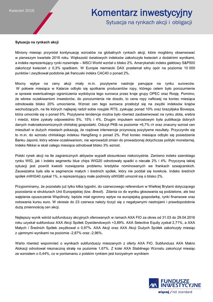 Kwiecień 2016 Komentarz inwestycyjny Sytuacja na rynkach akcji i obligacji Sytuacja na rynkach akcji Miniony miesiąc przyniósł kontynuację wzrostów na globalnych rynkach akcji, które mogliśmy obserwować w pierwszym kwartale 2016 roku. Większość światowych indeksów zakończyła kwiecień z dodatnimi wynikami, a indeks reprezentujący rynki rozwinięte – MSCI World wzrósł o blisko 2%. Amerykański indeks giełdowy S&P500 zakończył kwiecień z 0,3% spadkiem. W Europie niemiecki DAX przełamał silny opór na poziomie 10 000 punktów i zwyżkował podobnie jak francuski indeks CAC40 o ponad 2%. Mocny wpływ na ceny akcji miały m.in. pozytywne nastroje panujące na rynku surowców. W połowie miesiąca w Katarze odbyło się spotkanie producentów ropy, którego celem było porozumienie w sprawie ewentualnego ograniczenia wydobycia tego surowca przez kraje grupy OPEC oraz Rosję. Pomimo, że wbrew oczekiwaniom inwestorów, do porozumienia nie doszło, to cena ropy naftowej na koniec miesiąca odnotowała blisko 20% umocnienie. Wzrost cen tego surowca przełożył się na zwyżki indeksów krajów wschodzących, na tle których najlepiej radził sobie rosyjski RTS, zyskując ponad 10% oraz brazylijska Bovespa, która umocniła się o ponad 6%. Pozytywne tendencje można było również zaobserwować na rynku złota, srebra i miedzi, które zyskały odpowiednio 5%, 15% i 4%. Drugim impulsem wzrostowym była publikacja dobrych danych makroekonomicznych chińskiej gospodarki. Odczyt PKB na poziomie +6,7% r/r oraz znaczny wzrost cen mieszkań w dużych miastach pokazują, że rządowe interwencje przynoszą pozytywne rezultaty. Przyczyniło się to m.in. do wzrostu chińskiego indeksu HangSeng o ponad 2%. Pod koniec miesiąca odbyło się posiedzenie Banku Japonii, który wbrew oczekiwaniom, nie wprowadził zmian do prowadzonej dotychczas polityki monetarnej. Indeks Nikkei w skali całego miesiąca odnotował blisko 3% wzrost. Polski rynek akcji na tle zagranicznych aktywów wypadł stosunkowo niekorzystnie. Zarówno indeks szerokiego rynku WIG, jak i indeks segmentu blue chips WIG20 odnotowały spadki o niecałe 2% i 4%. Przyczyną takiej sytuacji jest powrót kwestii rozwiązania problemu kredytów nominowanych we frankach szwajcarskich. Zauważalna była siła w segmencie małych i średnich spółek, który nie poddał się korekcie. Indeks średnich spółek mWIG40 zyskał 1%, a reprezentujący małe podmioty sWIG80 umocnił się o blisko 2%. Przypominamy, że pozostało już tylko kilka tygodni, do czerwcowego referendum w Wielkiej Brytanii dotyczącego pozostania w strukturach Unii Europejskiej (tzw. Brexit). Zdania co do wyniku głosowania są podzielone, ale bez wątpienia opuszczenie Wspólnoty, będzie miał ogromny wpływ na europejską gospodarkę, rynki finansowe oraz notowania kursu euro. W okresie do 23 czerwca należy liczyć się z negatywnymi nastrojami i prawdopodobnie dużą zmiennością cen akcji. Najlepszy wynik wśród subfunduszy akcyjnych oferowanych w ramach AXA FIO za okres od 31.03 do 29.04.2016 roku uzyskał subfundusz AXA Akcji Spółek Dywidendowych +3,89%. AXA Selective Equity zyskał 2,71%, a AXA Małych i Średnich Spółek zwyżkował o 0,97%. AXA Akcji oraz AXA Akcji Dużych Spółek zakończyły miesiąc z ujemnymi wynikami na poziomie -2,87% oraz -2,96%. Warto również wspomnieć o wynikach subfunduszy mieszanych z oferty AXA FIO. Subfundusz AXA Makro Alokacji odnotował nieznaczną stratę na poziomie 1,67%. Z kolei AXA Stabilnego Wzrostu zakończył miesiąc ze wzrostem o 0,44%, co w porównaniu z polskim rynkiem jest korzystnym wynikiem Kwiecień 2016 Komentarz inwestycyjny Sytuacja na rynkach akcji i obligacji Wykres indeksu WIG 12M na dzień 29.04.2016 Sytuacja na rynkach obligacji Pozytywne zaskoczenie przyniosły dane dotyczące chińskiej gospodarki, które poznaliśmy w kwietniu. Opublikowane zostały także dobre dane ze strefy euro, gdzie odczyt PKB za I kwartał wzrósł powyżej oczekiwań rynku do poziomu 0,6%. Patrząc na dane o wyższej częstotliwości, niepokojące są kwestie dotyczące światowego przemysłu. Spadek koniunktury odnotowała zarówno gospodarka USA i strefa euro, co widać we wstępnych odczytach PMI przemysłu. Dynamika produkcji przemysłowej w Polsce uległa pogorszeniu z odczytem na poziomie 0,5% r/r wobec poprzedniego odczytu 6,7% r/r. Sprzedaż detaliczna spadła z kolei o 0,8% r/r w cenach nominalnych, poniżej wyniku z poprzedniego okresu, który wynosił 3,9% r/r. Poprawie uległy dane płynące z rynku pracy, gdzie zatrudnienie wzrosło o 2,7% r/r, co stanowi kontynuację kilkumiesięcznego trendu wzrostowego. Wskaźnik inflacji CPI po raz kolejny znalazł się na ujemnych poziomach (-0,9% r/r). Na kwietniowym posiedzeniu RPP postanowiono pozostawić stopy procentowe na niezmienionym poziomie. W kwietniu rynki bazowe odnotowały spadek cen obligacji. Rentowność niemieckich 10-latek (10DEY.B) znalazła się pod koniec miesiąca na poziomie 0,29%, a amerykańskich (10USY.B) na poziomie 1,82%. Pomimo, iż w minionym miesiącu rentowność polskich 10-letnich obligacji skarbowych wzrosła do ponad 3% to od kilku miesięcy możemy obserwować wahania w kanale między 2,8% a 3,2%. Warto przy tym zauważyć, że utrzymuje się tendencja do coraz mniejszej zmienności tych walorów. Czynnikiem, który może pozytywnie wpłynąć na rentowność polskich obligacji jest ekspansywna polityka monetarna prowadzona przez EBC. W okresie od 31.03 do 29.04.2016 roku nasz subfundusz AXA Obligacji odnotował nieznaczną stratę o 0,17%,co w porównaniu z rynkiem jest korzystnym wynikiem. Subfundusz AXA Obligacji Korporacyjnych zyskał w analogicznym okresie 0,69%. Zespół inwestycyjny AXA TFI Kwiecień 2016 Komentarz inwestycyjny Sytuacja na rynkach akcji i obligacji Niniejszy materiał został przygotowany przez AXA TFI S.A. w dobrej wierze i z należytą starannością, tym niemniej ma on charakter wyłąc