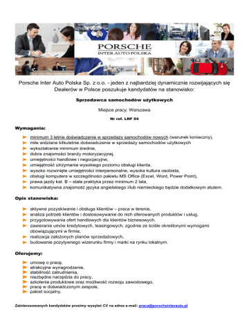 Porsche Inter Auto Polska Sp. z o.o. - jeden z najbardziej dynamicznie rozwijających się Dealerów w Polsce poszukuje kandydatów na stanowisko: Sprzedawca samochodów użytkowych Miejsce pracy: Warszawa Nr ref. LNF 04 Wymagania: minimum 3 letnie doświadczenie w sprzedaży samochodów nowych (warunek konieczny), mile widziane kilkuletnie doświadczenie w sprzedaży samochodów użytkowych wykształcenie minimum średnie, dobra znajomości branży motoryzacyjnej, umiejętności handlowe i negocjacyjne, umiejętność utrzymania wysokiego poziomu obsługi klienta, wysoko rozwinięte umiejętności interpersonalne, wysoka kultura osobista, obsługi komputera w szczególności pakietu MS Office (Excel, Word, Power Point), prawa jazdy kat. B – stała praktyka przez minimum 2 lata, komunikatywna znajomość języka angielskiego i/lub niemieckiego będzie dodatkowym atutem. Opis stanowiska: aktywne pozyskiwanie i obsługa klientów – praca w terenie, analiza potrzeb klientów i dostosowywanie do nich oferowanych produktów i usług, przygotowywania ofert handlowych dla klientów biznesowych, zawieranie umów kredytowych, leasingowych, zgodnie ze ściśle określonymi wymogami obowiązującymi w firmie, realizacja założonych planów sprzedażowych, budowanie pozytywnego wizerunku firmy i marki na rynku lokalnym. Oferujemy: umowę o pracę, atrakcyjne wynagrodzenie, stabilność zatrudnienia, niezbędne narzędzia do pracy, szkolenia produktowe oraz możliwość rozwoju zawodowego, pracę w doświadczonym zespole, pakiet socjalny. Zainteresowanych kandydatów prosimy wysyłać CV na adres e-mail: [email protected] W temacie e-maila prosimy wpisać nr ref. ogłoszenia. Dziękujemy za wszystkie aplikacje. Jednocześnie informujemy, że odpowiemy tylko na wybrane oferty. Prosimy o załączenie klauzuli: "Wyrażam zgodę na przetwarzanie moich danych osobowych zawartych w mojej ofercie pracy dla potrzeb niezbędnych do realizacji procesu rekrutacji (zgodnie z Ustawą z dnia 29.08.97 o ochronie danych osobowych, Dziennik Ustaw Nr 133 Poz. 883)".
