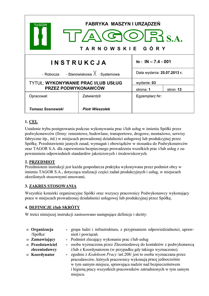 FABRYKA MASZYN I URZĄDZEŃ S.A. T A R N O W S K I E INSTRUKCJA - Robocza - Stanowiskowa - Systemowa G Ó R Y Nr : IN – 7.4 - 001 Data wydania: 25.07.2013 r. TYTUŁ: WYKONYWANIE PRAC I/LUB USŁUG PRZEZ PODWYKONAWCÓW wydanie: 03 Opracował: Zatwierdził: Egzemplarz Nr: Tomasz Sosnowski Piotr Wieszołek strona: 1 stron: 13 1. CEL Ustalenie trybu postępowania podczas wykonywania prac i/lub usług w imieniu Spółki przez podwykonawców (firmy: remontowe, budowlane, transportowe, drogowe, montaŜowe, serwisy fabryczne itp., itd.) w miejscach prowadzonej działalności usługowej lub produkcyjnej przez Spółkę. Przedstawienie jasnych zasad, wymagań i obowiązków w stosunku do Podwykonawców oraz TAGOR S.A. dla zapewnienia bezpiecznego prowadzenia wszelkich prac i/lub usług z zapewnieniem odpowiednich standardów jakościowych i środowiskowych. 2. PRZEDMIOT Przedmiotem instrukcji jest kaŜda gospodarcza praktyka wykonywana przez podmiot obcy w imieniu TAGOR S.A., dotycząca realizacji części zadań produkcyjnych i usług, w miejscach określonych stosownymi umowami. 3. ZAKRES STOSOWANIA Wszystkie komórki organizacyjne Spółki oraz wszyscy pracownicy Podwykonawcy wykonujący prace w miejscach prowadzonej działalności usługowej lub produkcyjnej przez Spółkę. 4. DEFINICJE i/lub SKRÓTY W treści niniejszej instrukcji zastosowano następujące definicje i skróty: • Organizacja /Spółka/ • Zamawiający • Przedstawiciel zleceniodawcy • Koordynator - grupa ludzi i infrastruktura, z przypisaniem odpowiedzialności, uprawnień i powiązań. - Podmiot zlecający wykonanie prac i/lub usług - osoba wyznaczona przez Zleceniodawcę do kontaktów z podwykonawcą i/lub z Koordynatorem (w przypadku gdy takiego wyznaczono). - zgodnie z Kodeksem Pracy /art.208/ jest to osoba wyznaczana przez pracodawców, których pracownicy wykonują pracę jednocześnie w tym samym miejscu, sprawująca nadzór nad bezpieczeństwem i higieną pracy wszystkich pracowników zatrudnionych w tym samym miejscu. • Podwykonawca - osoba lub inna organizacja dostarczająca usługi danej organizacji /Spółce/ na jej terenach i w jej miejscach pracy zgodnie z uzgodnionymi wymaganiami, ustaleniami i warunkami. - jest to komórka organizacyjna powołana i działająca w imieniu Zama• SłuŜba bhp wiającego - porozumienie o wykonanie określonego zakresu prac produkcyjnych • Umowa i/lub usług, na podstawie zdefiniowanych warunków, zawarte pomiędzy podwykonawcą a Zleceniodawcą. • Strefa zagroŜenia - teren lub objętość, w której istnieje zagroŜenie czynnikami niebezpiecznymi, szkodliwymi, poŜaru, wybuchu itp. - budynki, place, grunty, drogi stanowiące własność Spółki, lub będące w • Miejsce uŜytkowaniu wieczystym Spółki, oraz wszystkie tereny na których Spółka realizuje swoje produkcyjne i usługowe zobowiązania. - jakikolwiek produkt, substancja lub materiał chemiczny mający szko• Produkty szkodliwy wpływ na otoczenie lub pracowników. dliwe • Czynnik niebez- - jakikolwiek produkt, maszyna, urządzenie lub materiał mogący spowodować wypadek lub zdarzenie potencjalnie wypadkowe. pieczny 5. ODPOWIEDZIALNOŚĆ 5.1 Zamawiający odpowiada za: - przekazanie Podwykonawcy wszelkich niezbędnych informacji niezbędnych do zgodnego z przepisami, bezpiecznego przygotowania oraz wykonania określonego umową zadania. - przeszkolenie pracowników Podwykonawcy w zakresie BHP i wymagań Systemu Zarządzania Środowiskowego TAGOR S.A. oraz wszelkich wymagań określonych przez Zamawiającego. - przekazanie Podwykonawcy Kart Ryzyka zawodowego dla istniejących stanowisk pracy. przekazanie Podwykonawcy istotnych informacji w zakresie wzajemnej komunikacji z podaniem numerów alarmowych i zasadami postępowania w sytuacjach awaryjnych. przekazania Podwykonawcy protokólarnie miejsca pracy. kontrolę przestrzegania przez podwykonawcę postanowień niniejszej instrukcji oraz zgodności prowadzenia prac. poinformowanie Podwykonawcy o zagroŜeniach występujących w obszarze prowadzonych prac, okresowe monitorowanie działań Podwykonawcy pod kątem bezpieczeństwa i higieny pracy oraz aspektów środowiskowych. organizację pracy przy urządzeniach i instalacjach energetycznych w zakresie wymaganym przez przepisy przedmiotowe. wyznaczenie koordynatora w sytuacjach określonych zakresem niniejszej instrukcji dla robót o charakterze produkcyjnym zleconych Podwykonawcy do wykonania na terenie pomieszczeń produkcyjnych spółki, funkcję koordynatora powinna pełnić osoba dozoru działu Zamawiającego odpowiedzialnego za przedmiotową produkcję. - 5.2 Podwykonawca odpowiada za: - zapoznanie swoich pracowników z Wymaganiami ochrony środowiska i BHP dla podmiotów i osób przebywających na terenie TAGOR S.A. w Tarnowskich Górach i w Zabrzu” oraz z Planem Ochrony PrzeciwpoŜarowej Spółki. - przygotowanie „Karty Zgodności Prowadzonych Prac” i przekazanie jej do zatwierdzenia przedstawicielowi TAGOR S.A. - przeprowadzenie oceny ryzyka zawodowego, dla wykonywanych prac (jeŜeli takie do2 tychczas nie były opracowane) i okazywanie ich na Ŝądanie upowaŜnionym słuŜbom, informowanie słuŜby BHP Zamawiającego o wypadkach przy pracy oraz powstałych zagroŜeniach. identyfikowanie stosowanych substancji i preparatów chemicznych oraz posiadanie kart ich charakterystyk. prowadzenie dokumentacji z przebiegu prowadzonych prac: dziennika budowy; montaŜu, remontu. zatrudnianie pracowników z waŜnymi badaniami lekarskimi oraz odbytym przeszkoleniem stanowiskowym. zatrudnianie pracowników z odpowiednimi kwalifikacjami gwarantującymi wykonanie prac z godnie z zasadami wiedzy technicznej i wymaganymi standardami jakościowymi. wyznaczenie osoby nadzorującej stale przebywającej na terenie prowadzonych prac, upowaŜnionej do kontaktowania się z Zamawiającym oraz podejmowania decyzji w zakresie rozwiązywania bieŜących problemów. Wyznaczenie, w razie potrzeby prowadzenia prac je