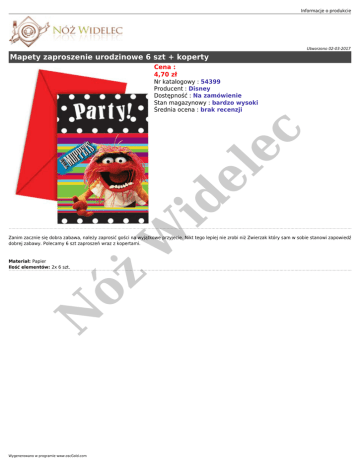 Informacje o produkcie Utworzono 02-03-2017 Mapety zaproszenie urodzinowe 6 szt + koperty Cena : 4,70 zł W id e le c Nr katalogowy : 54399 Producent : Disney Dostępność : Na zamówienie Stan magazynowy : bardzo wysoki Średnia ocena : brak recenzji Zanim zacznie się dobra zabawa, należy zaprosić gości na wyjątkowe przyjecie. Nikt tego lepiej nie zrobi niż Zwierzak który sam w sobie stanowi zapowiedź dobrej zabawy. Polecamy 6 szt zaproszeń wraz z kopertami. N óż Materiał: Papier Ilość elementów: 2x 6 szt. Wygenerowano w programie www.oscGold.com
