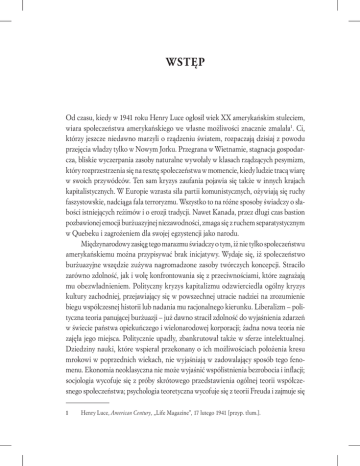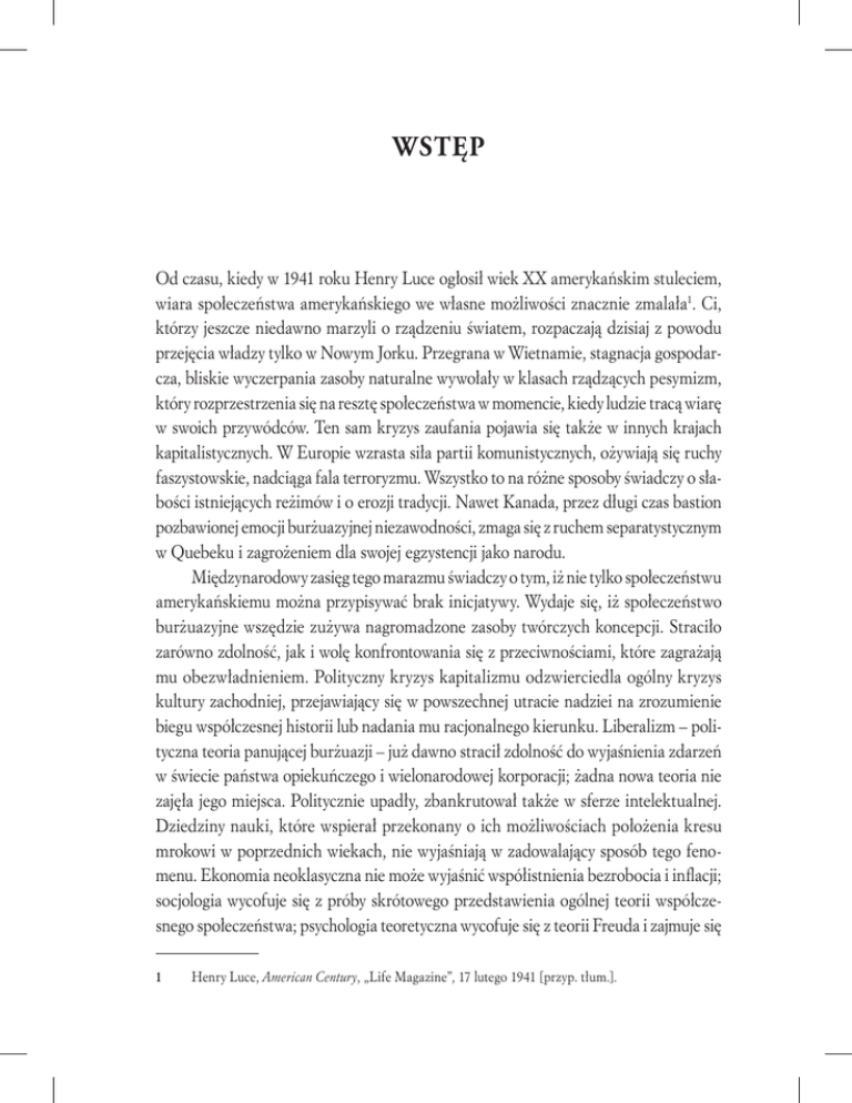 WSTĘP Od czasu, kiedy w 1941 roku Henry Luce ogłosił wiek XX amerykańskim stuleciem, wiara społeczeństwa amerykańskiego we własne możliwości znacznie zmalała1. Ci, którzy jeszcze niedawno marzyli o rządzeniu światem, rozpaczają dzisiaj z powodu przejęcia władzy tylko w Nowym Jorku. Przegrana w Wietnamie, stagnacja gospodarcza, bliskie wyczerpania zasoby naturalne wywołały w klasach rządzących pesymizm, który rozprzestrzenia się na resztę społeczeństwa w momencie, kiedy ludzie tracą wiarę w swoich przywódców. Ten sam kryzys zaufania pojawia się także w innych krajach kapitalistycznych. W Europie wzrasta siła partii komunistycznych, ożywiają się ruchy faszystowskie, nadciąga fala terroryzmu. Wszystko to na różne sposoby świadczy o słabości istniejących reżimów i o erozji tradycji. Nawet Kanada, przez długi czas bastion pozbawionej emocji burżuazyjnej niezawodności, zmaga się z ruchem separatystycznym w Quebeku i zagrożeniem dla swojej egzystencji jako narodu. Międzynarodowy zasięg tego marazmu świadczy o tym, iż nie tylko społeczeństwu amerykańskiemu można przypisywać brak inicjatywy. Wydaje się, iż społeczeństwo burżuazyjne wszędzie zużywa nagromadzone zasoby twórczych koncepcji. Straciło zarówno zdolność, jak i wolę konfrontowania się z przeciwnościami, które zagrażają mu obezwładnieniem. Polityczny kryzys kapitalizmu odzwierciedla ogólny kryzys kultury zachodniej, przejawiający się w powszechnej utracie nadziei na zrozumienie biegu współczesnej historii lub nadania mu racjonalnego kierunku. Liberalizm – polityczna teoria panującej burżuazji – już dawno stracił zdolność do wyjaśnienia zdarzeń w świecie państwa opiekuńczego i wielonarodowej korporacji; żadna nowa teoria nie zajęła jego miejsca. Politycznie upadły, zbankrutował także w sferze intelektualnej. Dziedziny nauki, które wspierał przekonany o ich możliwościach położenia kresu mrokowi w poprzednich wiekach, nie wyjaśniają w zadowalający sposób tego fenomenu. Ekonomia neoklasyczna nie może wyjaśnić współistnienia bezrobocia i inflacji; socjologia wycofuje się z próby skrótowego przedstawienia ogólnej teorii współczesnego społeczeństwa; psychologia teoretyczna wycofuje się z teorii Freuda i zajmuje się 1 Henry Luce, American Century, „Life Magazine”, 17 lutego 1941 [przyp. tłum.]. 22 ⫶ Kultur a narcyzmu przyziemnymi sprawami. Nauki przyrodnicze, które postawiły sobie zbyt wygórowane cele, obecnie chcą jak najszybciej ogłosić światu, iż nauka jako taka nie oferuje żadnych cudownych rozwiązań problemów społecznych. W naukach humanistycznych zepsucie obyczajów doszło do takiego punktu, w którym trzeba przyznać, że dzięki nauce nie da się zrozumieć współczesnego świata. Filozofowie już dłużej nie wyjaśniają natury rzeczy i nie starają się mówić nam, jak mamy żyć. Studenci literatury traktują tekst nie jako odbicie rzeczywistego świata, lecz jako odbicie wewnętrznego stanu umysłu artysty. Historycy przyznają istnienie „poczucia braku związku z historią”, używając słów Davida Donalda 2, „oraz beznadziejność nowej epoki, w którą wkraczamy”. Kultura liberalna była zawsze mocno zależna od badań nad historią, dlatego upadek tej kultury widać bardzo wyraźnie na przykładzie upadku wiary w prawdę historyczną, która wcześniej otaczał zapis dziejów aurą moralnej powagi, patriotyzmu i politycznego optymizmu. W przeszłości historycy zakładali, że ludzie uczą się na własnych błędach. Skoro teraz przyszłość jawi się jako niespokojna i niepewna, przeszłość jawi się jako „nieistotna”, nawet tym, którzy poświęcają swoje życie, aby ją badać. „Wiek dostatku się skończył”, pisze David Donald. „Nauka”, jaką Amerykanie wyciągnęli z przeszłości, jest dzisiaj nie tylko nieistotna, ale także niebezpieczna (…). Być może moim najskuteczniejszym działaniem byłoby uwolnienie studentów od uroku, jaki rzuciła na nich historia, tak aby pomogło to im dostrzec nieistotność przeszłości (…), przypomniało, w jak ograniczonym wymiarze ludzkość kontroluje własne przeznaczenie3. Taki rozpaczliwy obraz przyszłości widziany z lotu ptaka jest również zauważany przez tych, co rządzą społeczeństwem, kształtują opinię publiczną oraz nadzorują naukę i wiedzę, od których społeczeństwo jest zależne. Jeśli z kolei zapytamy, co o swojej przyszłości myśli zwykły człowiek, znajdziemy wiele dowodów na potwierdzenie poglądu, że współczesny świat staje w obliczu przyszłości pozbawionej nadziei. Ale znajdujemy również inną stronę takiego stanu rzeczy, która doprecyzowuje to wrażenie i wskazuje na to, że zachodnia cywilizacja może jeszcze stworzyć moralne podstawy do pokonania obecnego kryzysu. Powszechna nieufność wobec rządzących uczyniła społeczeństwo 2 3 David Donald na ten temat: „New York Times”, 8 września 1977. Ibidem. wstęp ⫶ 23 niesłychanie trudnym do kierowania. Klasa rządząca wielokrotnie narzeka na tę trudność, nie chcąc zrozumieć swojego wkładu; ale ta sama nieufność może być podstawą do zbudowania nowej zdolności do samorządzenia, która zakończyłaby się po usunięciu przeszkody umiejscawiającej klasę panującą na pierwszym miejscu. To, co (zdaniem politologów) wygląda jak apatia wyborców, może w rzeczywistości być zdrowym sceptycyzmem wobec systemu politycznego, w którym okłamywanie opinii publicznej stało się powszechne i codzienne. Brak zaufania do ekspertów może pomóc w osłabieniu zależności od nich, która to mocno ograniczyła zdolność do pomagania sobie nawzajem. Biurokracja znacznie osłabiła wcześniejszą aktywność na szczeblu lokalnym. Ożywienie tej aktywności daje nadzieję na zbudowanie solidnego społeczeństwa na gruzach kapitalizmu. Nieadekwatność odgórnych rozwiązań zmusza obecnie ludzi do 