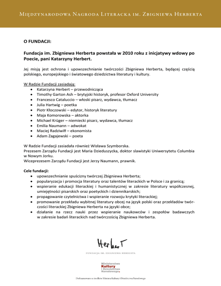 O FUNDACJI: Fundacja im. Zbigniewa Herberta powstała w 2010 roku z inicjatywy wdowy po Poecie, pani Katarzyny Herbert. Jej misją jest ochrona i upowszechnianie twórczości Zbigniewa Herberta, będącej częścią polskiego, europejskiego i światowego dziedzictwa literatury i kultury. W Radzie Fundacji zasiadają: Katarzyna Herbert – przewodnicząca Timothy Garton Ash – brytyjski historyk, profesor Oxford University Francesco Cataluccio – włoski pisarz, wydawca, tłumacz Julia Hartwig – poetka Piotr Kłoczowski – edytor, historyk literatury Maja Komorowska – aktorka Michael Krüger – niemiecki pisarz, wydawca, tłumacz Emilia Naumann – adwokat Maciej Radziwiłł – ekonomista Adam Zagajewski – poeta W Radzie Fundacji zasiadała również Wisława Szymborska. Prezesem Zarządu Fundacji jest Maria Dzieduszycka, doktor slawistyki Uniwersytetu Columbia w Nowym Jorku. Wiceprezesem Zarządu Fundacji jest Jerzy Naumann, prawnik. Cele fundacji: upowszechnianie spuścizny twórczej Zbigniewa Herberta; popularyzacja i promocja literatury oraz talentów literackich w Polsce i za granicą; wspieranie edukacji literackiej i humanistycznej w zakresie literatury współczesnej, umiejętności pisarskich oraz poetyckich i dziennikarskich; propagowanie czytelnictwa i wspieranie rozwoju krytyki literackiej; promowanie przekładu wybitnej literatury obcej na język polski oraz przekładów twórczości literackiej Zbigniewa Herberta na języki obce; działanie na rzecz nauki przez wspieranie naukowców i zespołów badawczych w zakresie badań literackich nad twórczością Zbigniewa Herberta. Działalność: Fundacja Herberta ustanowiła międzynarodową Nagrodę Literacką im. Zbigniewa Herberta w dziedzinie poezji. Wręczenie pierwszej Nagrody odbędzie się 3 czerwca 2013 roku. Jednym z najważniejszych obszarów działalności Fundacji Herberta jest też współpraca z instytucjami, w posiadaniu których znajdują się dobra spuścizny twórczej Zbigniewa Herberta, w szczególności z Biblioteką Narodową w Warszawie. W Polsce i za granicą istnieje już 20 szkół noszących imię Zbigniewa Herberta. Od 2001 roku są one skupione w Klubie Herbertowskich Szkół, którego celem jest integracja środowisk szkolnych oraz organizacja różnego rodzaju imprez kulturalnych upowszechniających poezję i propagujących wartości, którym w życiu i w swojej twórczości hołdował Zbigniew Herbert. Fundacja Herberta współpracuje ze szkołami i Klubem w ramach działań edukacyjnych i upowszechniających poezję oraz znajomość życia i twórczości Zbigniewa Herberta. Fundacja Herberta zajmuje się propagowaniem idei czytelnictwa oraz upowszechnianiem poezji, literatury i krytyki literackiej – poprzez organizowanie i wspieranie projektów edukacyjnych, konferencji, odczytów, warsztatów, konkursów literackich, spotkań autorskich z czytelnikami czy festiwali literackich. Fundacja organizuje coroczny wieczór poezji Zbigniewa Herberta, w dniu Jego urodzin, czyli 29 października. Wydarzenia odbywa się w Warszawie, w Pałacu Rzeczypospolitej – siedzibie Biblioteki Narodowej, która jest jednym z partnerów Fundacji. W domu Zbigniewa Herberta w Warszawie zachowała się prywatna biblioteka poety. Imponujący księgozbiór zawiera blisko 10 000 woluminów ułożonych tematycznie, w porządku nadanym ręką samego Herberta. Biblioteka stanowi jedyny w swoim rodzaju portret intelektualny Zbigniewa Herberta. Pani Katarzyna Herbert przekazała bibliotekę na własność Fundacji, która będzie sprawowała opiekę nad unikalnym księgozbiorem i udostępniała go do celów edukacyjnych i badawczych. Fundacja Herberta współpracuje z instytucjami realizującymi podobne cele w kraju i za granicą, ze szczególnym uwzględnieniem współpracy międzynarodowej, prowadzącej do wymiany intelektualnej pomiędzy poetami, pisarzami, krytykami oraz animatorami życia literackiego. W tym zakresie Fundacja będzie również tworzyć lub wspierać interaktywne projekty internetowe. Fundacja Herberta zamierza prowadzić działalność wydawniczą popularyzującą cele, osiągnięcia i zamierzenia Fundacji. www.fundacjaherberta.com www.facebook.com/FundacjaHerberta