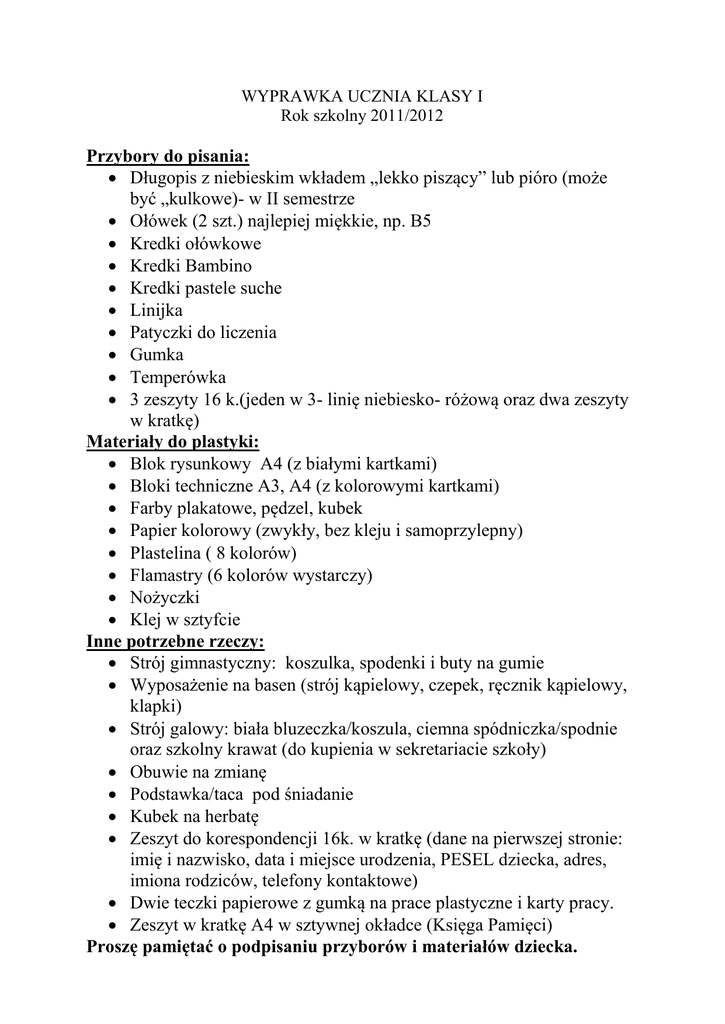 WYPRAWKA UCZNIA KLASY I Rok szkolny 2011/2012 Przybory do pisania: Długopis z niebieskim wkładem „lekko piszący” lub pióro (może być „kulkowe)- w II semestrze Ołówek (2 szt.) najlepiej miękkie, np. B5 Kredki ołówkowe Kredki Bambino Kredki pastele suche Linijka Patyczki do liczenia Gumka Temperówka 3 zeszyty 16 k.(jeden w 3- linię niebiesko- różową oraz dwa zeszyty w kratkę) Materiały do plastyki: Blok rysunkowy A4 (z białymi kartkami) Bloki techniczne A3, A4 (z kolorowymi kartkami) Farby plakatowe, pędzel, kubek Papier kolorowy (zwykły, bez kleju i samoprzylepny) Plastelina ( 8 kolorów) Flamastry (6 kolorów wystarczy) Nożyczki Klej w sztyfcie Inne potrzebne rzeczy: Strój gimnastyczny: koszulka, spodenki i buty na gumie Wyposażenie na basen (strój kąpielowy, czepek, ręcznik kąpielowy, klapki) Strój galowy: biała bluzeczka/koszula, ciemna spódniczka/spodnie oraz szkolny krawat (do kupienia w sekretariacie szkoły) Obuwie na zmianę Podstawka/taca pod śniadanie Kubek na herbatę Zeszyt do korespondencji 16k. w kratkę (dane na pierwszej stronie: imię i nazwisko, data i miejsce urodzenia, PESEL dziecka, adres, imiona rodziców, telefony kontaktowe) Dwie teczki papierowe z gumką na prace plastyczne i karty pracy. Zeszyt w kratkę A4 w sztywnej okładce (Księga Pamięci) Proszę pamiętać o podpisaniu przyborów i materiałów dziecka.