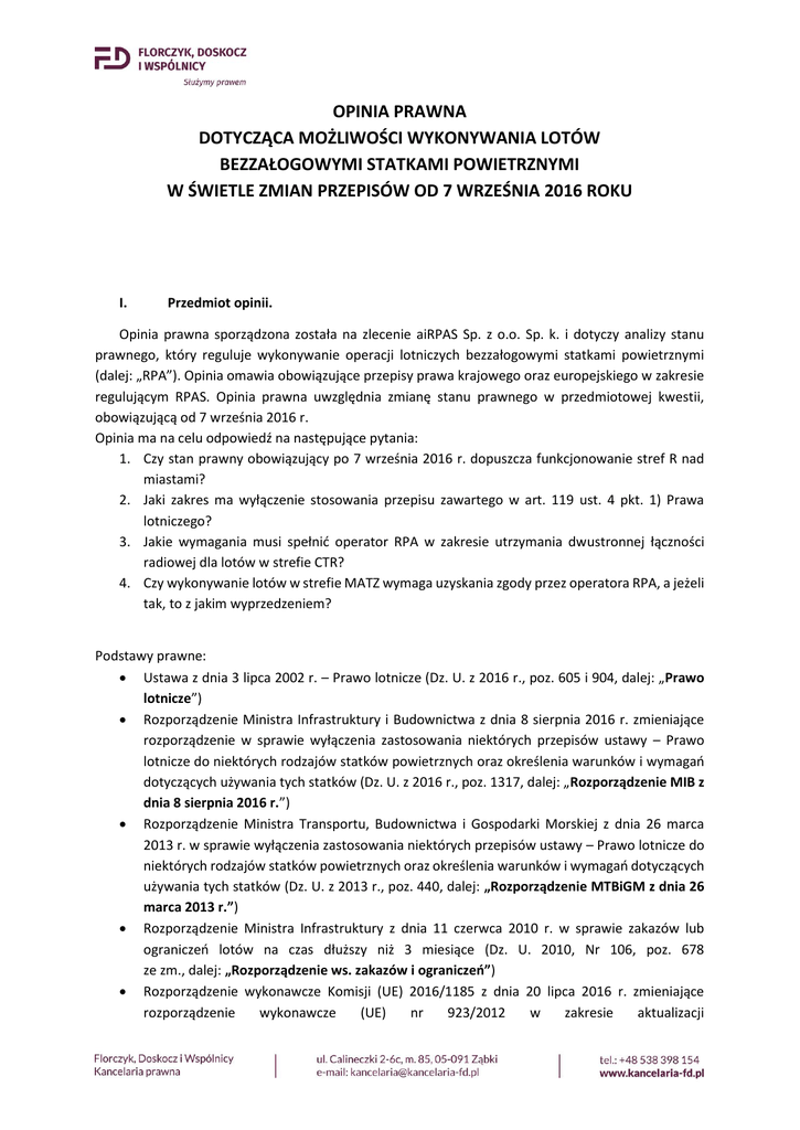 OPINIA PRAWNA DOTYCZĄCA MOŻLIWOŚCI WYKONYWANIA LOTÓW BEZZAŁOGOWYMI STATKAMI POWIETRZNYMI W ŚWIETLE ZMIAN PRZEPISÓW OD 7 WRZEŚNIA 2016 ROKU I. Przedmiot opinii. Opinia prawna sporządzona została na zlecenie aiRPAS Sp. z o.o. Sp. k. i dotyczy analizy stanu prawnego, który reguluje wykonywanie operacji lotniczych bezzałogowymi statkami powietrznymi (dalej: „RPA”). Opinia omawia obowiązujące przepisy prawa krajowego oraz europejskiego w zakresie regulującym RPAS. Opinia prawna uwzględnia zmianę stanu prawnego w przedmiotowej kwestii, obowiązującą od 7 września 2016 r. Opinia ma na celu odpowiedź na następujące pytania: 1. Czy stan prawny obowiązujący po 7 września 2016 r. dopuszcza funkcjonowanie stref R nad miastami? 2. Jaki zakres ma wyłączenie stosowania przepisu zawartego w art. 119 ust. 4 pkt. 1) Prawa lotniczego? 3. Jakie wymagania musi spełnić operator RPA w zakresie utrzymania dwustronnej łączności radiowej dla lotów w strefie CTR? 4. Czy wykonywanie lotów w strefie MATZ wymaga uzyskania zgody przez operatora RPA, a jeżeli tak, to z jakim wyprzedzeniem? Podstawy prawne: Ustawa z dnia 3 lipca 2002 r. – Prawo lotnicze (Dz. U. z 2016 r., poz. 605 i 904, dalej: „Prawo lotnicze”) Rozporządzenie Ministra Infrastruktury i Budownictwa z dnia 8 sierpnia 2016 r. zmieniające rozporządzenie w sprawie wyłączenia zastosowania niektórych przepisów ustawy – Prawo lotnicze do niektórych rodzajów statków powietrznych oraz określenia warunków i wymagań dotyczących używania tych statków (Dz. U. z 2016 r., poz. 1317, dalej: „Rozporządzenie MIB z dnia 8 sierpnia 2016 r.”) Rozporządzenie Ministra Transportu, Budownictwa i Gospodarki Morskiej z dnia 26 marca 2013 r. w sprawie wyłączenia zastosowania niektórych przepisów ustawy – Prawo lotnicze do niektórych rodzajów statków powietrznych oraz określenia warunków i wymagań dotyczących używania tych statków (Dz. U. z 2013 r., poz. 440, dalej: „Rozporządzenie MTBiGM z dnia 26 marca 2013 r.”) Rozporządzenie Ministra Infrastruktury z dnia 11 czerwca 2010 r. w sprawie zakazów lub ograniczeń lotów na czas dłuższy niż 3 miesiące (Dz. U. 2010, Nr 106, poz. 678 ze zm., dalej: „Rozporządzenie ws. zakazów i ograniczeń”) Rozporządzenie wykonawcze Komisji (UE) 2016/1185 z dnia 20 lipca 2016 r. zmieniające rozporządzenie wykonawcze (UE) nr 923/2012 w zakresie aktualizacji i uzupełniania wspólnych zasad w odniesieniu do przepisów lotniczych i operacyjnych dotyczących służb i procedur żeglugi powietrznej (część C SERA) i uchylające rozporządzenie (WE) nr 730/2006 (dalej: „SERA C”) Rozporządzenie wykonawcze Komisji (UE) nr 923/2012 z dnia 26 września 2012 r. ustanawiające wspólne zasady w odniesieniu do przepisów lotniczych i operacyjnych dotyczących służb i procedur żeglugi powietrznej oraz zmieniające rozporządzenie wykonawcze (WE) nr 1035/2011 oraz rozporządzenia (WE) nr 1265/2007, (WE) nr 1794/2006, (WE) nr 730/2006, (WE) nr 1033/2006 i (UE) nr 255/2010 (dalej: „SERA”) Ad. 1) Czy stan prawny obowiązujący po 7 września 2016 r. dopuszcza funkcjonowanie stref R nad miastami? 7 września 2016 roku weszło w życie rozporządzenie Ministra Infrastruktury i Budownictwa z dnia 8 sierpnia 2016 r. zmieniające rozporządzenie w sprawie wyłączenia zastosowania niektórych przepisów ustawy – Prawo lotnicze do niektórych rodzajów statków powietrznych oraz określenia warunków i wymagań dotyczących używania tych statków (Dz. U. z 2016 r., poz. 1317, dalej: „Rozporządzenie MIB z 8 sierpnia 2016 r.”). Przepisy te wskazują, które regulacje Prawa lotniczego nie będą miały zastosowania do RPA, przy czym na potrzeby niniejszej opinii omawiane będą tylko kwestie związane ze strefami R. Należy zaznaczyć, że Rozporządzenie MIB z 8 sierpnia 2016 r. dotyczy operacji VLOS (czyli w zasięgu wzroku operatora). Zasady wykonywania operacji BVLOS (poza zasięgiem wzroku) nie zmieniają się na skutek wejścia w życie rozporządzenia. Rozporządzenie z 8 sierpnia 2016 r. wprowadziło wyłączenie1 stosowania Rozporządzenia ws zakazów i ograniczeń w odniesieniu do RPA następujących kategorii: RPA o masie startowej nie większej niż 150 kg, używanych wyłącznie w celach rekreacyjnych lub sportowych (ust. 1 pkt. 1 lit. d) rozporządzenia); RPA o masie startowej nie większej niż 25 kg, używanych w celach innych niż rekreacyjne i sportowe (ust. 1 pkt. 1 lit f) rozporządzenia) – czyli dla wszystkich związanych z prowadzeniem działalności gospodarczej. Wyłączenie dotyczy tylko operacji VLOS. Ponadto operacje RPA korzystające z powyższego wyłączenia muszą odbywać się na zasadach określonych w Załącznikach 6 i 6a do Rozporządzenia z 8 sierpnia 2016 r. W odniesieniu do lotów rekreacyjnych i sportowych strefy R nad miastami nie obowiązują, o ile RPA ma masę startową nie większą niż 150 kg. Wskazuje na to rozszerzenie zakresu wyłączenia stosowania przepisów wydanych na podst. art. 119 ust. 4 pkt. 1 Prawa lotniczego. Wyłączenie to zostało precyzyjnie określone w § 2 ust. 3 pkt. 1) ujednoliconej wersji rozporządzenia (po zmianie z 8 sierpnia 2016 r.). Ponadto w Załączniku 6 do rozporządzenia w Rozdziale 4 pkt. 4.1. ppkt. 9 znalazł się przepis w brzmieniu „w strefie R obejmującej parki narodowe jedynie za zgodą zarządzającego danym parkiem narodowym i na warunkach przez niego określonych”. Interpretując ten przepis należy wywnioskować a contrario, że skoro najpierw wyłączono stosowanie przepisów wprowadzających strefy R2, a następnie określono szczegółowo warunki lotów w strefach R nad parkami narodowymi, to celowo nie doprecyzowano takich warunków do innych stref R. W konsekwencji w odniesieniu do stref R miastowych nie ma zakazów lotów RPA. Czym innym są ograniczenia wprowadzone w samym załączniku 6, ich istnienie nie wypływa na to, że strefy R miastowe nie obow