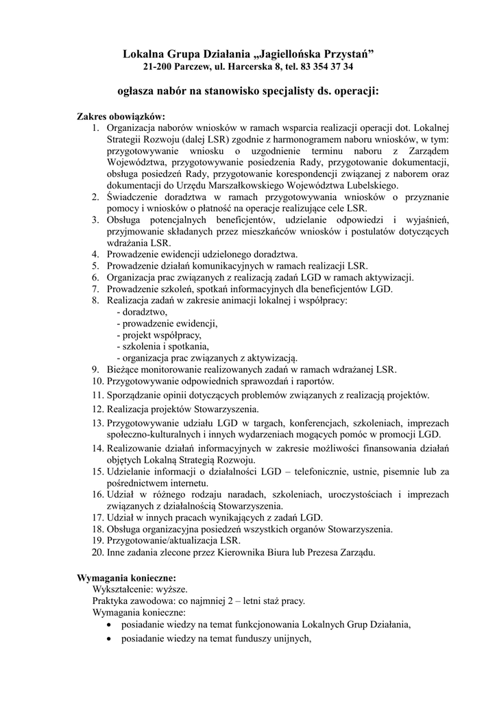 Lokalna Grupa Działania „Jagiellońska Przystań” 21-200 Parczew, ul. Harcerska 8, tel. 83 354 37 34 ogłasza nabór na stanowisko specjalisty ds. operacji: Zakres obowiązków: 1. Organizacja naborów wniosków w ramach wsparcia realizacji operacji dot. Lokalnej Strategii Rozwoju (dalej LSR) zgodnie z harmonogramem naboru wniosków, w tym: przygotowywanie wniosku o uzgodnienie terminu naboru z Zarządem Województwa, przygotowywanie posiedzenia Rady, przygotowanie dokumentacji, obsługa posiedzeń Rady, przygotowanie korespondencji związanej z naborem oraz dokumentacji do Urzędu Marszałkowskiego Województwa Lubelskiego. 2. Świadczenie doradztwa w ramach przygotowywania wniosków o przyznanie pomocy i wniosków o płatność na operacje realizujące cele LSR. 3. Obsługa potencjalnych beneficjentów, udzielanie odpowiedzi i wyjaśnień, przyjmowanie składanych przez mieszkańców wniosków i postulatów dotyczących wdrażania LSR. 4. Prowadzenie ewidencji udzielonego doradztwa. 5. Prowadzenie działań komunikacyjnych w ramach realizacji LSR. 6. Organizacja prac związanych z realizacją zadań LGD w ramach aktywizacji. 7. Prowadzenie szkoleń, spotkań informacyjnych dla beneficjentów LGD. 8. Realizacja zadań w zakresie animacji lokalnej i współpracy: - doradztwo, - prowadzenie ewidencji, - projekt współpracy, - szkolenia i spotkania, - organizacja prac związanych z aktywizacją. 9. Bieżące monitorowanie realizowanych zadań w ramach wdrażanej LSR. 10. Przygotowywanie odpowiednich sprawozdań i raportów. 11. Sporządzanie opinii dotyczących problemów związanych z realizacją projektów. 12. Realizacja projektów Stowarzyszenia. 13. Przygotowywanie udziału LGD w targach, konferencjach, szkoleniach, imprezach społeczno-kulturalnych i innych wydarzeniach mogących pomóc w promocji LGD. 14. Realizowanie działań informacyjnych w zakresie możliwości finansowania działań objętych Lokalną Strategią Rozwoju. 15. Udzielanie informacji o działalności LGD – telefonicznie, ustnie, pisemnie lub za pośrednictwem internetu. 16. Udział w różnego rodzaju naradach, szkoleniach, uroczystościach i imprezach związanych z działalnością Stowarzyszenia. 17. Udział w innych pracach wynikających z zadań LGD. 18. Obsługa organizacyjna posiedzeń wszystkich organów Stowarzyszenia. 19. Przygotowanie/aktualizacja LSR. 20. Inne zadania zlecone przez Kierownika Biura lub Prezesa Zarządu. Wymagania konieczne: Wykształcenie: wyższe. Praktyka zawodowa: co najmniej 2 – letni staż pracy. Wymagania konieczne: posiadanie wiedzy na temat funkcjonowania Lokalnych Grup Działania, posiadanie wiedzy na temat funduszy unijnych, znajomość ustawy o stowarzyszeniach, znajomość procedur administracyjnych, umiejętność obsługi komputera w zakresie: edytorów tekstu, arkuszy kalkulacyjnych, programów do prezentacji, stan zdrowia pozwalający na zatrudnienie na wskazanym stanowisku, niekaralność oraz posiadanie pełnej zdolności do czynności prawnych i korzystanie z pełni praw publicznych. Wymagania pożądane: wykształcenie wyższe ekonomiczne, administracyjne lub inne o profilu zbliżonym do zakresu obowiązków, umiejętność obsługi urządzeń biurowych, znajomość problematyki i doświadczenie zawodowe w zakresie realizacji projektów ze środków UE lub krajowych, prawo jazdy kat. B Wymagane dokumenty i oświadczenia: życiorys zawodowy, list motywacyjny, dokumenty lub kserokopie dokumentów potwierdzających posiadane wykształcenie, staż pracy, doświadczenie zawodowe i umiejętności, oświadczenie o posiadaniu pełnej zdolności do czynności prawnych oraz o korzystaniu z pełni praw publicznych, oświadczenie, że kandydat nie był karany za przestępstwo popełnione umyślnie oraz nie toczy się przeciw niemu postępowanie karne, oświadczenie o posiadaniu stanu zdrowia pozwalającego na zatrudnienie na wyżej określonym stanowisku. Warunki zatrudnienia: umowa o pracę na pełny etat. Termin zatrudnienia: od 1.06.2016 r. Dokumenty aplikacyjne winne być opatrzone klauzulą: Wyrażam zgodę na przetwarzanie moich danych osobowych zawartych w ofercie pracy dla potrzeb niezbędnych do realizacji procesu rekrutacji zgodnie z ustawą z dnia 29 sierpnia 1997 r. o ochronie danych osobowych (Dz. U. z 2002 r. Nr 101, poz. 926, ze zmianami). Kserokopie dokumentów potwierdzających posiadane wykształcenie, staż pracy, doświadczenie zawodowe i umiejętności winne być podpisane czytelnie na każdej stronie przez składającego je kandydata. Dokumenty aplikacyjne należy składać w Biurze Lokalnej Grupy Działania „Jagiellońska Przystań” (21-200 Parczew, ul. Harcerska 8) w terminie od 10.05.2016 r. do 17.05.2016 r., do godz. 13.00 osobiście lub za pośrednictwem poczty (decyduje data i godzina wpłynięcia dokumentów) w zaklejonych i opisanych kopertach z podaniem adresu zamieszkania kandydata aplikującego wraz z telefonem (wyklucza się przesyłanie ofert drogą elektroniczną). Aplikacje niekompletne lub niedostarczone w terminie nie będą rozpatrywane. Złożone dokumenty nie będą zwracane i zostaną zniszczone po 30 dniach od zakończenia naboru. Osoby zakwalifikowane do rozmowy kwalifikacyjnej (na podstawie oceny złożonych dokumentów) zostaną poinformowane o jej terminie telefonicznie. Dopuszcza się dodatkowo przeprowadzenie wśród kandydatów testów kwalifikacyjnych oceniających wiedzę i kompetencje. Informacja o wyniku rekrutacji zostanie umieszczona na stronie internetowej stowarzyszenia LGD „Jagiellońska Przystań” niezwłocznie po przeprowadzonym naborze. Prezes Zarządu Janusz Tryniecki