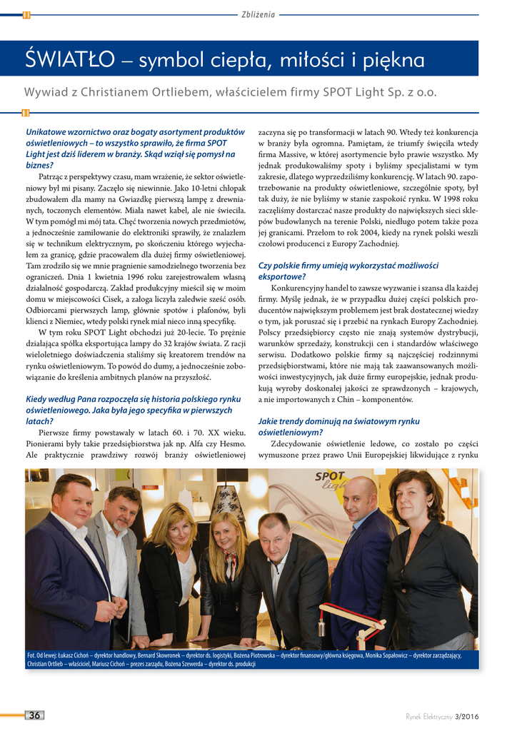 Zbliżenia ŚWIATŁO – symbol ciepła, miłości i piękna Wywiad z Christianem Ortliebem, właścicielem firmy SPOT Light Sp. z o.o. Unikatowe wzornictwo oraz bogaty asortyment produktów oświetleniowych – to wszystko sprawiło, że firma SPOT Light jest dziś liderem w branży. Skąd wziął się pomysł na biznes? Patrząc z perspektywy czasu, mam wrażenie, że sektor oświetleniowy był mi pisany. Zaczęło się niewinnie. Jako 10-letni chłopak zbudowałem dla mamy na Gwiazdkę pierwszą lampę z drewnianych, toczonych elementów. Miała nawet kabel, ale nie świeciła. W tym pomógł mi mój tata. Chęć tworzenia nowych przedmiotów, a jednocześnie zamiłowanie do elektroniki sprawiły, że znalazłem się w technikum elektrycznym, po skończeniu którego wyjechałem za granicę, gdzie pracowałem dla dużej firmy oświetleniowej. Tam zrodziło się we mnie pragnienie samodzielnego tworzenia bez ograniczeń. Dnia 1 kwietnia 1996 roku zarejestrowałem własną działalność gospodarczą. Zakład produkcyjny mieścił się w moim domu w miejscowości Cisek, a załoga liczyła zaledwie sześć osób. Odbiorcami pierwszych lamp, głównie spotów i plafonów, byli klienci z Niemiec, wtedy polski rynek miał nieco inną specyfikę. W tym roku SPOT Light obchodzi już 20-lecie. To prężnie działająca spółka eksportująca lampy do 32 krajów świata. Z racji wieloletniego doświadczenia staliśmy się kreatorem trendów na rynku oświetleniowym. To powód do dumy, a jednocześnie zobowiązanie do kreślenia ambitnych planów na przyszłość. Kiedy według Pana rozpoczęła się historia polskiego rynku oświetleniowego. Jaka była jego specyfika w pierwszych latach? Pierwsze firmy powstawały w latach 60. i 70. XX wieku. Pionierami były takie przedsiębiorstwa jak np. Alfa czy Hesmo. Ale praktycznie prawdziwy rozwój branży oświetleniowej zaczyna się po transformacji w latach 90. Wtedy też konkurencja w branży była ogromna. Pamiętam, że triumfy święciła wtedy firma Massive, w której asortymencie było prawie wszystko. My jednak produkowaliśmy spoty i byliśmy specjalistami w tym zakresie, dlatego wyprzedziliśmy konkurencję. W latach 90. zapotrzebowanie na produkty oświetleniowe, szczególnie spoty, był tak duży, że nie byliśmy w stanie zaspokoić rynku. W 1998 roku zaczęliśmy dostarczać nasze produkty do największych sieci sklepów budowlanych na terenie Polski, niedługo potem także poza jej granicami. Przełom to rok 2004, kiedy na rynek polski weszli czołowi producenci z Europy Zachodniej. Czy polskie firmy umieją wykorzystać możliwości eksportowe? Konkurencyjny handel to zawsze wyzwanie i szansa dla każdej firmy. Myślę jednak, że w przypadku dużej części polskich producentów największym problemem jest brak dostatecznej wiedzy o tym, jak poruszać się i przebić na rynkach Europy Zachodniej. Polscy przedsiębiorcy często nie znają systemów dystrybucji, warunków sprzedaży, konstrukcji cen i standardów właściwego serwisu. Dodatkowo polskie firmy są najczęściej rodzinnymi przedsiębiorstwami, które nie mają tak zaawansowanych możliwości inwestycyjnych, jak duże firmy europejskie, jednak produkują wyroby doskonałej jakości ze sprawdzonych – krajowych, a nie importowanych z Chin – komponentów. Jakie trendy dominują na światowym rynku oświetleniowym? Zdecydowanie oświetlenie ledowe, co zostało po części wymuszone przez prawo Unii Europejskiej likwidujące z rynku Fot. Od lewej: Łukasz Cichoń – dyrektor handlowy, Bernard Skowronek – dyrektor ds. logistyki, Bożena Piotrowska – dyrektor finansowy/główna księgowa, Monika Sopałowicz – dyrektor zarządzający, Christian Ortlieb – właściciel, Mariusz Cichoń – prezes zarządu, Bożena Szewerda – dyrektor ds. produkcji 36 Rynek Elektryczny 3/2016 Zbliżenia tradycyjne żarówki. Już teraz w Niemczech czy Szwajcarii sprzedaż produktów z tradycyjnymi oprawami spadła poniżej 30 proc. całości rynku i to samo czeka Polskę. A takie zmiany wymuszają określony design. Wzrasta popyt na ekstrawaganckie, nowoczesne spoty oraz wszelkie oprawy z zastosowaniem technologii LED, i te tendencje będą się pogłębiać. My, co prawda, sprzedajemy też dużo lamp klasycznych, jednak jest to klasyka odświeżona, odkryta na nowo, pasująca do współczesnych wnętrz i dodająca im ponadczasowej elegancji. Modna jest stylistyka z przełomu lat 60 i 70., a także zwrot ku naturalnym materiałom, przede wszystkim ku drewnu. Jeśli chodzi o kolory na topie, jest to niewątpliwie satyna i chrom; co ciekawe, w wielkim stylu powróciła także biel, która przez długie lata była prawie zupełnie nieobecna na rynku oświetleniowym. Miedź, która spotkała się z wielkim uznaniem wśród architektów, przez konsumentów odbierana jest z większą rezerwą. Jednak aby stwierdzić o sukcesie bądź porażce tego koloru, musimy jeszcze trochę poczekać. Jaka jest specyfika polskiego rynku? Pomimo tego, że od transformacji minęło 25 lat, jest jeszcze wiele polskich mieszkań, gdzie wiszą zabytki oświetleniowe z lat socjalizmu, jest więc przed nami wiele do zrobienia. Jednak świadomość Polaków w tym zakresie przez ostatnie lata bardzo się zmieniła. Kiedyś lampa była dodatkiem użytkowym do mieszkania, teraz staje się elementem dekoracji, który nie tylko określa gust lokatorów, lecz także narzuca styl wnętrza. Wśród naszych klientów zauważamy podział na miłośników tradycji i amatorów nowoczesnego designu. Wyzwaniem jest dostarczać produkty dla obu tych grup. Co istotne, wraz ze wzrostem świadomości zmienia się też podejście do procesu zakupowego. Polscy konsumenci nie patrzą tylko na cenę, teraz liczy się przede wszystkim jakość zastosowanych materiałów i stylowe wzornictwo. Które produkty z oferty SPOT Light odpowiadają najnowszym tendencjom? Na sezon 2016 firma SPOT Light odświeżyła i wzbogaciła swoje portfolio 