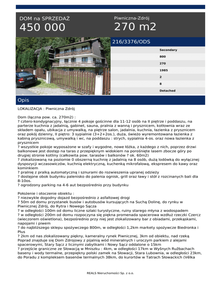 DOM na SPRZEDAŻ 450 000 Piwniczna-Zdrój 270 m2 216/3376/ODS Secondary 800 270 1985 2 8 Detached Opis LOKALIZACJA : Piwniczna Zdrój Dom (łączna pow. ca. 270m2) : ? cztero-kondygnacyjny, łącznie 4 pokoje gościnne dla 11-12 osób na II piętrze i poddaszu, na parterze kuchnia z jadalnią, gabinet, sauna, pralnia z wanną i prysznicem, kotłownia wraz ze składem opału, ubikacja z umywalką, na piętrze salon, jadalnia, kuchnia, łazienka z prysznicem oraz pokój dzienny, II piętro: 3 sypialnie (3+2+2os.), duża, świeżo wyremontowana łazienka z kabiną prysznicową, umywalką i wc, na poddaszu : strych, sypialnia 4-os. oraz nowa łazienka z prysznicem ? wszystkie pokoje wyposażone w szafy i wygodne, nowe łóżka, z każdego z nich, poprzez drzwi balkonowe jest dostęp na taras z przepięknym widokiem na porośnięte lasem zbocze góry po drugiej stronie kotliny (całkowita pow. tarasów i balkonów ? ok. 60m2) ? zlokalizowaną na poziomie 0 obszerną kuchnię z jadalnią na 8 osób, dużą lodówką do wyłącznej dyspozycji wczasowiczów, kuchnią elektryczną, kuchenką mikrofalową, ekspresem do kawy oraz kominkiem ? pralnię z pralką automatyczną i sznurami do rozwieszenia upranej odzieży ? dostępne obok budynku palenisko do palenia ognisk, grill oraz ławy i stół z rozcinanych bali dla 8-10os. ? ogrodzony parking na 4-6 aut bezpośrednio przy budynku Położenie i otoczenie obiektu : ? niezwykle dogodny dojazd bezpośrednio z asfaltowej drogi ? 50m od domu przystanek busów i autobusów kursujących na Suchą Dolinę, do rynku w Piwnicznej Zdrój, do Rytra i Nowego Sącza ? w odległości 100m od domu liczne szlaki turystyczne, ruiny starego młyna z wodospadem ? w odległości 200m od domu rozpoczyna się piękna promenada spacerowa wzdłuż rzeczki Czercz (wieczorem oświetlona), bezpośrednio przy niej jest zlokalizowany bar z obiadami, przekąskami, napojami i piwem ? do najbliższego sklepu spożywczego 800m, w odległości 1,2km markety spożywcze Biedronka i Plus ? 2km od nas zlokalizowany piękny, kameralny rynek Piwnicznej, 3km od obiektu, nad rzeką Poprad znajduje się Dom Zdrojowy z pijalnią wód mineralnych i uroczym parkiem z alejami spacerowymi, Stary Sącz z licznymi zabytkami i Nowy Sącz oddalone o 15km ? przejście graniczne ze Słowacją w Mniszku : 4km, w odległości 17km w Wyšnych Ružbachach baseny i wody termalne, przepiękny polski zamek na Słowacji, Stara Lubownia, w odległości 23km, do Poradu z kompleksem basenów termalnych 38km, do kurortów w Tatrach Słowackich (Vělka REALS Nieruchomości Sp. z o.o. Lomnica, Štrbskě Pleso, Smokovec) 50km Informacje dla narciarzy i rowerzystów górskich (lokalizacja wyciągów) : ? kompleks wyciągów Sucha Dolina : 2,5km ? wyciąg krzesełkowy Kokuszki : 3,5km ? wyciąg krzesełkowy Ryterski Raj w Rytrze : 4km ? stacja narciarska Wierchomla : 10km ? najbliższe wyciągi po stronie słowackiej : 15km Cena do negocjacji. Polecam Łukasz Ziubiński Doradca ds. nieruchomości tel. kom. 883 98 98 60 REALS Nieruchomości www.reals.pl REALS REALS tel. 22 829 92 10 tel. 22 829 92 10 email: [email protected] REALS Nieruchomości Sp. z o.o. Powered by TCPDF (www.tcpdf.org)