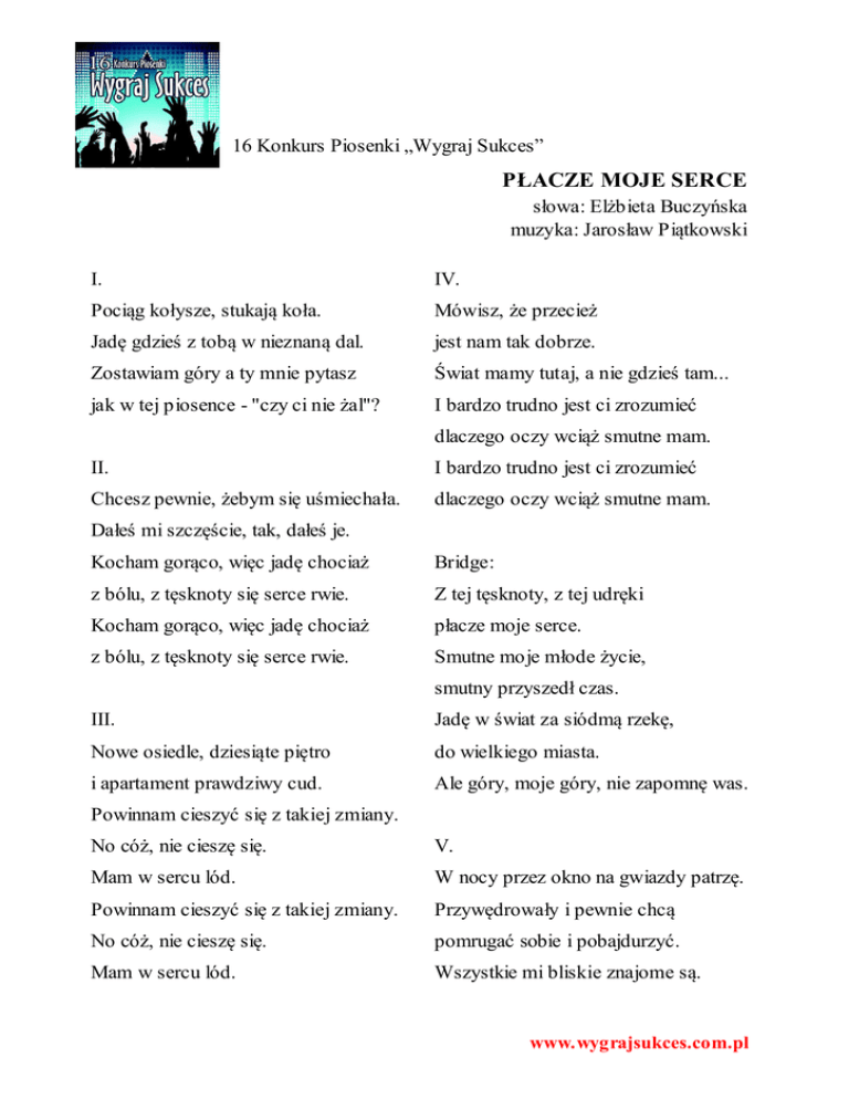 16 Konkurs Piosenki „Wygraj Sukces” PŁACZE MOJE SERCE słowa: Elżbieta Buczyńska muzyka: Jarosław Piątkowski I. IV. Pociąg kołysze, stukają koła. Mówisz, że przecież Jadę gdzieś z tobą w nieznaną dal. jest nam tak dobrze. Zostawiam góry a ty mnie pytasz Świat mamy tutaj, a nie gdzieś tam... jak w tej piosence - "czy ci nie żal"? I bardzo trudno jest ci zrozumieć dlaczego oczy wciąż smutne mam. II. I bardzo trudno jest ci zrozumieć Chcesz pewnie, żebym się uśmiechała. dlaczego oczy wciąż smutne mam. Dałeś mi szczęście, tak, dałeś je. Kocham gorąco, więc jadę chociaż Bridge: z bólu, z tęsknoty się serce rwie. Z tej tęsknoty, z tej udręki Kocham gorąco, więc jadę chociaż płacze moje serce. z bólu, z tęsknoty się serce rwie. Smutne moje młode życie, smutny przyszedł czas. III. Jadę w świat za siódmą rzekę, Nowe osiedle, dziesiąte piętro do wielkiego miasta. i apartament prawdziwy cud. Ale góry, moje góry, nie zapomnę was. Powinnam cieszyć się z takiej zmiany. No cóż, nie cieszę się. V. Mam w sercu lód. W nocy przez okno na gwiazdy patrzę. Powinnam cieszyć się z takiej zmiany. Przywędrowały i pewnie chcą No cóż, nie cieszę się. pomrugać sobie i pobajdurzyć. Mam w sercu lód. Wszystkie mi bliskie znajome są. www.wygrajsukces.com.pl Hej, gwiazdy moje z gór przybywacie. Pogadam z wami i już jest lżej. Łatwiej uporam się z tęsknotami. Nowego życia nauczę. Hej! www.wygrajsukces.com.pl