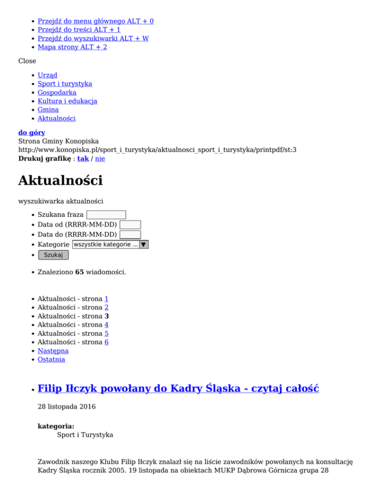 Przejdź do menu głównego ALT + 0 Przejdź do treści ALT + 1 Przejdź do wyszukiwarki ALT + W Mapa strony ALT + 2 Close Urząd Sport i turystyka Gospodarka Kultura i edukacja Gmina Aktualności do góry Strona Gminy Konopiska http://www.konopiska.pl/sport_i_turystyka/aktualnosci_sport_i_turystyka/printpdf/st:3 Drukuj grafikę : tak / nie Aktualności wyszukiwarka aktualności Szukana fraza Data od (RRRR-MM-DD) Data do (RRRR-MM-DD) Kategorie wszystkie kategorie ... ▼ Szukaj Znaleziono 65 wiadomości. Aktualności - strona 1 Aktualności - strona 2 Aktualności - strona 3 Aktualności - strona 4 Aktualności - strona 5 Aktualności - strona 6 Następna Ostatnia Filip Iłczyk powołany do Kadry Śląska - czytaj całość 28 listopada 2016 kategoria: Sport i Turystyka Zawodnik naszego Klubu Filip Iłczyk znalazł się na liście zawodników powołanych na konsultację Kadry Śląska rocznik 2005. 19 listopada na obiektach MUKP Dąbrowa Górnicza grupa 28 najbardziej utalentowanych chłopców w swoim roczniku miała okazję zaprezentować swoje umiejętności przed sztabem szkoleniowym, który na początku 2017 roku wyselekcjonuje przyszłych reprezentantów Kadry Śląska. Filip Iłczyk powołany do Kadry Śląska Filip Iłczyk powołany do Kadry Śląska - czytaj całość Zakończyły się zmagania Polskiej Ligi Bocci - czytaj całość 26 listopada 2016 kategoria: Sport i Turystyka Finał VII Mistrzostw Polski w Bocci 2016 w Drzonkowie/Zielonej Górze 17 - 20 listopada 2016 i kolejne dwa miejsca na podium zawodników "Prometeusa w kategorii BC- 5, drugie miejsce wywalczył RAFAŁ STASIAK, a ŁUKASZ SUDOŁ uplasował się na miejscu trzecim. Zakończyły się zmagania Polskiej Ligi Bocci Zakończyły się zmagania Polskiej Ligi Bocci - czytaj całość Piłka nożna. Lot Konopiska - Jedność Boronów - czytaj całość 14 listopada 2016 kategoria: Sport i Turystyka W niedzielę 13 listopada drużyna Juniorów Starszych Lotu Konopiska w ramach 15 kolejki II Ligi Śląskiej, podejmowała zespół zza miedzy - Jedność Boronów. Gospodarze niepokonani od 3 spotkań (formalnie od 4, ponieważ mecz z Kłomnicami nie odbył się i przyznano walkower) bez straty gola, zdobywali kolejne punkty i pieli się w górę ligowej tabeli. Piłka nożna. Lot Konopiska - Jedność Boronów Piłka nożna. Lot Konopiska - Jedność Boronów - czytaj całość Piłka siatkowa. Dwie wygrane i awans młodzików - czytaj całość 09 listopada 2016 kategoria: Sport i Turystyka W ósmej kolejce spotkań AZS 2020 Konopiska podejmował w we własnej hali rywali z Katowic i Rybnika. Stawką obu meczy było utrzymanie przez nasz zespól trzeciego miejsca w grupie i awans do kolejnego etapu rozgrywek. W walce z rywalami naszą drużynę dzielnie wspierali licznie zgromadzeni kibice , którzy głośnym dopingiem pomagali chłopakom szczególnie w ciężkich chwilach na boisku. Piłka siatkowa. Dwie wygrane i awans młodzików Piłka siatkowa. Dwie wygrane i awans młodzików - czytaj całość Czwarta edycja Częstochowskiego Dnia Sportu - czytaj całość 06 listopada 2016 kategoria: Sport i Turystyka W sobotę, 29 października w hali sportowej przy ul. Żużlowej odbyła się czwarta edycja Częstochowskiego Dnia Sportu. Gościem specjalnym był Tomasz Majewski, złoty medalista w pchnięciu kulą na igrzyskach w Pekinie oraz Londynie. W programie imprezy zaplanowano m.in. turniej piłkarski dla chłopców w dwóch kategoriach wiekowych - rocznika 2006 i 2008. Czwarta edycja Częstochowskiego Dnia Sportu Czwarta edycja Częstochowskiego Dnia Sportu - czytaj całość Lot Konopiska. Kolejne zwycięstwo odnieśli Juniorzy Starsi czytaj całość 05 listopada 2016 kategoria: Sport i Turystyka Kolejne zwycięstwo odnieśli Juniorzy Starsi. Tym razem po raz kolejny pokonali wyżej notowanego rywala – Błękitni Herby. Mecz mocnym uderzeniem zaczęli gospodarze. Dosłownie mówiąc w 6 minucie potężny strzał z rzutu wolnego oddał Kamil Polaczkiewicz. Bramkarz nie zdołał złapać piłki i ku uciesze zawodników i kibiców wpadła do bramki. Kilka minut później, dokładnie w 9 minucie zdobywamy kolejną bramkę. Lot Konopiska. Kolejne zwycięstwo odnieśli Junio Lot Konopiska. Kolejne zwycięstwo odnieśli Juniorzy Starsi - czytaj całość II Zakładowy Turniej Tenisa Stołowego o Puchar Prezesa Zarządu PWiK O.CZ.S.A w Częstochowie - czytaj całość 03 listopada 2016 kategoria: Sport i Turystyka Informujemy, że w dniu 12 listopada 2016r. w Akademickim Centrum Sportowym AJD w Częstochowie odbędzie się II Zakładowy Turniej Tenisa Stołowego o Puchar Prezesa Zarządu PWiK O.CZ.S.A w Częstochowie. II Zakładowy Turniej Tenisa Stołowego o Puchar P II Zakładowy Turniej Tenisa Stołowego o Puchar Prezesa Zarządu PWiK O.CZ.S.A w Częstochowie czytaj całość Finałowy turniej "Z podwórka na stadion o Puchar Tymbarku" - czytaj całość 28 października 2016 kategoria: Sport i Turystyka Chłopcy – piłkarze - rocznik 2007/08 wygrali zawody finałowego turnieju "Z podwórka na stadion o Puchar Tymbarku" na szczeblu powiatu częstochowskiego!!! Na przełomie marca/kwietnia 2017 wystąpią w turnieju wojewódzkim jako reprezentanci naszego powiatu! Finałowy turniej "Z podwórka na stadion o Puchar Finałowy turniej "Z podwórka na stadion o Puchar Tymbarku" - czytaj całość Siatkówka. Młodzicy znów wygrali! - czytaj całość 25 października 2016 kategoria: Kultura i Edukacja W piątej kolejce spotkań zespół AZS 2020 Konopiska rozgrywał swoje mecze w Będzinie. Podopieczni Tomasza Kupczyka spisali się w nich wręcz znakomicie, odnosząc dwa pewne zwycięstwa. W pierwszym meczu pokonali drużynę ANBUD MKS Będzin II 2-0 (25:16, 25:21), a w drugim MKS Żywiec również 2-0 (25:15, 25:21). Siatkówka. Młodzicy znów wygrali! Siatkówka. Młodzicy znów wygrali! - czytaj całość Siatkówka. Pierwsze zwycięstwo młodzików - czytaj całość 20 października 2016 kategoria: Sport i Turystyk