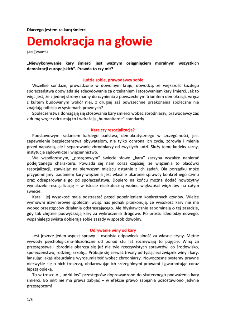 Dlaczego jestem za karą śmierci Demokracja na głowie JAN EWARYST „Niewykonywanie kary śmierci jest ważnym osiągnięciem moralnym wszystkich demokracji europejskich”. Prawda to czy mit? Ludzie sobie, prawodawcy sobie Wszelkie sondaże, prowadzone w dowolnym kraju, dowodzą, że większość każdego społeczeństwa opowiada się zdecydowanie za orzekaniem i stosowaniem kary śmierci. Jak to więc jest, że z jednej strony mamy do czynienia z powszechnym triumfem demokracji, wręcz z kultem budowanym wokół niej, z drugiej zaś powszechne przekonania społeczne nie znajdują odbicia w systemach prawnych? Społeczeństwa domagają się stosowania kary śmierci wobec zbrodniarzy, prawodawcy zaś z dumą wręcz odrzucają to i wdrażają „humanitarne” standardy. Kara czy resocjalizacja? Podstawowym zadaniem każdego państwa, demokratycznego w szczególności, jest zapewnienie bezpieczeństwa obywatelom, nie tylko ochrona ich życia, zdrowia i mienia przed napaścią, ale i separowanie zbrodniarzy od zwykłych ludzi. Służy temu kodeks karny, instytucje sądownicze i więziennictwo. We współczesnym, „postępowym” świecie słowo „kara” zaczyna wszakże nabierać podejrzanego charakteru. Powiada się nam coraz częściej, że więzienia to placówki resocjalizacji, stawiając na pierwszym miejscu ostatnie z ich zadań. Dla porządku może przypomnijmy: zadaniem kary więzienia jest właśnie ukaranie sprawcy konkretnego czynu oraz odseparowanie go od społeczeństwa. Dopiero na końcu można dodać nowożytny wynalazek: resocjalizację – w istocie nieskuteczną wobec większości więźniów na całym świecie. Kara i jej wysokość mają odstraszać przed popełnieniem konkretnych czynów. Wielce wymowni inżynierowie społeczni wciąż nas jednak przekonują, że wysokość kary nie ma wobec przestępców działania odstraszającego. Ale błyskawicznie zapominają o tej zasadzie, gdy tak chętnie podwyższają kary za wykroczenia drogowe. Po prostu ideolodzy nowego, wspaniałego świata dobierają sobie zasady w sposób dowolny. Odrywanie winy od kary Jest jeszcze jeden aspekt sprawy – osobista odpowiedzialność za własne czyny. Mętne wywody psychologiczno-filozoficzne od ponad stu lat rozmywają to pojęcie. Winą za przestępstwa i zbrodnie obarcza się już nie tyle rzeczywistych sprawców, co środowisko, społeczeństwo, rodzinę, szkołę… Próbuje się zerwać trwały od tysiącleci związek winy i kary, lansując jakąś absurdalną wyrozumiałość wobec zbrodniarzy. Nowoczesne systemy prawne niezwykle się o nich troszczą, obdarowując ich szczególnymi prawami i gwarantując coraz lepszą opiekę. To w trosce o „ludzki los” przestępców doprowadzono do skutecznego podważenia kary śmierci. Bo nikt nie ma prawa zabijać – w efekcie prawo zabijania pozostawiono jedynie przestępcom! 1/3 Oczywiście w krajach takich, jak Rosja czy Polska, w systemach społecznych silnie skorumpowanych, z wymiarem sprawiedliwości niesprawnym i często niesprawiedliwym, a za to podatnym na wpływy, kara śmierci jest narzędziem niebezpiecznym. Niech więc tu czasowo obowiązuje stan zawieszenia (kara śmierci jest orzekana, ale niewykonywana). Po stronie katów Można by się zgodzić na niewykonywanie kary śmierci, choć moralnie jest to niezrozumiałe, gdyby zapewniono społeczeństwu, że zbrodniarz nigdy więcej nie będzie miał możliwości zagrożenia komukolwiek, a więc pozostanie na zawsze w murach więzienia. Ale przecież moraliści powiadają, że trzymanie kogokolwiek w więzieniu do śmierci jest nieludzkie. Coraz powszechniejsze jest więc znoszenie kary dożywocia. Ba, okazuje się, że nieludzka jest też kara 25 lat więzienia i ona też jest redukowana. Dochodzą do tego przepustki i obniżanie wyroków za „dobre sprawowanie”. W rezultacie wielokrotni bezwzględni mordercy już po kilku latach odsiadki w majestacie prawa wychodzą na wolność. We wrześniu 2014 r. podano, że w najbliższym czasie polskie więzienia opuści kilkudziesięciu groźnych morderców, z których część zapowiada, że będą nadal robili swoje. Ale choćby i nie, choćby z ich rąk nie miała już zginąć żadna niewinna osoba (w co nie wierzę), to i tak jaka tu sprawiedliwość wobec ofiar tych zwyrodnialców? Dlaczego śmierć każdej z tych ofiar jest tak nisko ceniona? Dlaczego systemy prawne demokratycznych państw stają nieodmiennie po stronie katów, a nigdy ofiar? Przesadzam? W Hiszpanii, Niemczech, Włoszech więzienia opuszczają terroryści winni zamachów bombowych, w których zginęły dziesiątki niewinnych osób. Wbrew protestom rodzin osób zamordowanych. W imię humanitaryzmu mordercom skraca się wyroki i wypuszcza na wolność – wbrew nawet ich bezczelnym zapewnieniom, że niczego nie żałują. Krzycząca niesprawiedliwość W niedawnym wyroku norweski sąd skazał Andersa Breivika, mordercę 77 osób, na najwyższą możliwą karę: 21 lat więzienia. Jest właściwie pewne, że i tej kary nie odbędzie i za kilka lat będzie mógł znowu przystąpić do realizacji swych planów. Podejrzewam przy tym, że wiele polskich rodzin, chcąc sobie podwyższyć standard życia, zapoznawszy się z warunkami w norweskich więzieniach, chętnie zamieszkałoby w nich na prawach więźniów na stałe czy na jakiś czas. Ryzyko niewinnej śmierci Powiada się, że w USA, które akurat pod tym względem szczęśliwie opierają się postępowi, gdzie kara śmierci jest stosowana, zdarzają się pomyłki sądowe. Bardzo rzadko, ale się rzeczywiście zdarzają. Tyle że, po pierwsze, globalnie i tak społeczeństwo wychodzi na tym dobrze – mordercy nie mają szans po kilku latach wrócić do swego procederu. Po drugie, ryzykiem śmierci niewinnej osoby obarczona jest każda działalność ludzka, nawet jazda na wrotkach. Czy jest to powód, żeby z niej rezygnować? Zbójów chronić, dzieci zabijać Jest może jeszcze dziwniej, choć mało k