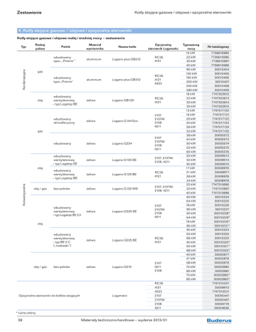 Zestawienie Kotły stojące gazowe / olejowe i opcjonalne sterowniki 4. Kotły stojące gazowe / olejowe i opcjonalne sterowniki Kotły stojące gazowe i olejowe małej i średniej mocy – zestawienie Rodzaj paliwa Kondensacyjne Typ Materiał wymiennika Palnik Nazwa kotła Opcjonalny sterownik Logamatic wbudowany typu „„Premix”” aluminium Logano plus GB212 RC35 4121 wbudowany typu „Premix” aluminium Logano plus GB312 RC35 4121 4323 wbudowany wentylatorowy – typ Logatop BE żeliwo Logano GB125 RC35 4121 gaz olej wbudowany atmosferyczny żeliwo Logano G144 Eco 2107 2107M 2109 4211 wbudowany żeliwo Logano G234 2107 2107M 2109 4211 wbudowany wentylatorowy – typ Logatop SE żeliwo Logano G125 SE 2107, 2107M, 2109, 4211 wbudowany wentylatorowy – typ Logatop BE żeliwo Logano G125 BE RC35 4121 żeliwo Logano G125 WS 2107, 2107M, 2109, 4211 wbudowany wentylatorowy – typ Logatop SE 2.0 żeliwo Logano G225 SE 2107 2107M 2109 4211 wbudowany wentylatorowy – typ BE 2.C („niebieski”) żeliwo Logano G225 BE RC35 4121 żeliwo Logano G215 2107 4211 2109 Logamatic RC35 4121 4323 2107 2107M 2109 4211 gaz Konwencjonalne olej olej / gaz bez palnika olej olej / gaz bez palnika Opcjonalne sterowniki do kotłów stojących * luźne człony 38 Materiały techniczno-handlowe – wydanie 2013/01 Typoszereg mocy 15 kW 22 kW 30 kW 40 kW 90 kW 120 kW 160 kW 200 kW 240 kW 280 kW 18 kW 22 kW 30 kW 35 kW 13 kW 16 kW 20 kW 24 kW 28 kW 32 kW 38 kW 44 kW 50 kW 55 kW 60 kW 25 kW 32 kW 40 kW 17 kW 21 kW 28 kW 34 kW 25 kW 32 kW 40 kW 50 kW 64 kW 78 kW 95 kW 50 kW 64 kW 78 kW 95 kW 45 kW 55 kW 68 kW 45 kW 55 kW 68 kW 40 kW 47 kW 58 kW 70 kW 85 kW 70 kW 85 kW Nr katalogowy 7736615985 7736615986 7736615987 7736615988 30010404 30010405 30010406 30010407 30010408 30010409 7747303912 7747303913 7747303914 7747303915 7747017120 7747017121 7747017122 7747017123 7747017124 7747017125 30005572 30005573 30005574 30005575 30005576 30009013 30009014 30009015 30008976 30008977 30008978 30008979 7747310896 7747310897 7747310898 30010224 30010225 30010226 30010227 30010228* 30010229* 30010230* 30010231* 30010323 30010324 30010325 30010320* 30010321* 30010322* 30002877 30002878 30002879 30002880 30002881 30002882* 30002883* 7747312327 30008912 7747310531 30005447 30005467 30005719 30004836 Logano GB125 Kondensacyjne kotły gazowe i olejowe 4.1.3 Kotły olejowe Logano GB125 (18...35 kW) Kotły stojące, olejowe, kondensacyjne, z wymiennikiem żeliwnym, o mocach od 18 do 35 kW • SP ŚĆ •S ŚĆ P WN RA O 104% WNO RA Logano plus GB125 Typ Logano plus GB125 z podgrzewaczem c.w.u. Logalux LT.../1 Nr katalogowy GB125-18 7 747 303 912 GB125-22 7 747 303 913 GB125-30 7 747 303 914 GB125-35 7 747 303 915 Kotły przystosowane do zasilania olejem opałowym Oznaczenia: 18…35 – znamionowa max moc urządzenia [kW] Zastosowanie Kocioł przeznaczony jest do podgrzewania wody w instalacjach c.o. i przygotowania c.w.u. np. w domach jedno- lub wielorodzinnych. Kocioł może pracować w systemie zależnym lub niezależnym od powietrza w pomieszczeniu. Wymiana stojących kotłów konwencjonalnych na efektywne kotły kondensacyjne w korzystnej cenie, wysokiej sprawności współpracujące z nowoczesną automatyką, modernizacja starszych nieefektywnych kotłowni. Opis • Olejowy kocioł kondensacyjny z płynną regulacją temperatury wody w kotle bez temperatury progowej. • Zintegrowany wymiennik ciepła do kondensacji z nierdzewnej stali szlachetnej. • Cztery wielkości kotłów, nominalne moce grzewcze od 18-35 kW, ze znakiem CE. • Kocioł grzewczy można opalać olejem opałowym lekkim EL standard i o niskiej zawartości siarki (<0,005 %) wg DIN 51 603. • Może współpracować z pojemnościowymi podgrzewaczami c.w.u. Logalux LT.../1 (leżący pod kotłem, trzy wielkości konstrukcyjne o pojemności 160-300 litrów) oraz Logalux ST.../4 (stojący, trzy wielkości konstrukcyjne o pojemności 160-300 litrów), Logalux SU (stojący, trzy wielkości konstrukcyjne o pojemności 160-300 litrów). • Wersje „Unit“ ze wzajemnie zestrojonymi składnikami (kocioł grzewczy, palnik i sterownik), zapewniające niskoemisyjną eksploatację przy wysokiej sprawności znormalizowanej do 104%. • Tryb pracy zależny i niezależny od powietrza w pomieszczeniu. • Podłączenie do różnych systemów spalinowo-powietrznych, dopuszczonych do stosowania w Polsce. • Niskoszumowy tryb pracy i o niskiej zawartości substancji szkodliwych, • Wersje „Unit“ z palnikami niebieskimi, ze spalaniem praktycznie bez sadzy. • Z ceramiczną rurą palnika dla zapewnienia wysokiej trwałości do wszystkich dopuszczalnych jakości oleju opałowego. • Prosta i komfortowa obsługa. • Wyposażenie wszystkich sterowników indywidualnie rozszerzalne poprzez moduły dodatkowe. • Logamatic EMS z obszernymi funkcjami serwisowymi i z kontrolą płomienia. • Logamatic EMS z automatem palnikowym SAFe, zapewniającym perfekcyjną informację dzięki wskazywaniu stanów pracy, świadczenia konserwacyjne i serwisowe w tekście niezaszyfrowanym, szybki montaż, uruchomienie i konserwacja. • System do szybkiego montażu dostosowany do danego układu hydraulicznego, z energooszczędną pompą klasy efektywności energetycznej A. • Natychmiastowa gotowość do pracy dzięki fabrycznie sprawdzonemu na gorąco palnikowi Logatop, prosta optymalizacja na miejscu zainstalowania. • Bezproblemowe przyłączenie podgrzewacza c.w.u. przy pomocy przewodów połączeniowych kocioł-podgrzewacz. Kocioł olejowy kondensacyjny Palnik Urządzenie regulacyjne (sterownik) Odprowadzenie spalin Podgrzewacz c.w.u. Wykonanie/ kombinacja bez Logano plus GB125 44 Logamatic EMS z RC35 zależne od powietrza w pomieszczeniu Logamatic 4121 niezależne od powietrza w pomieszczeniu Logatop BE Materiały techniczno-handlowe – wydanie 2013/01 Logalux LT160 LT200 LT300 Logalux SU/ST160 SU/ST200 SU/ST300 GB125-18 -22 -30 -35 Logano GB125 Kondensacyjne kotły gazowe i olej