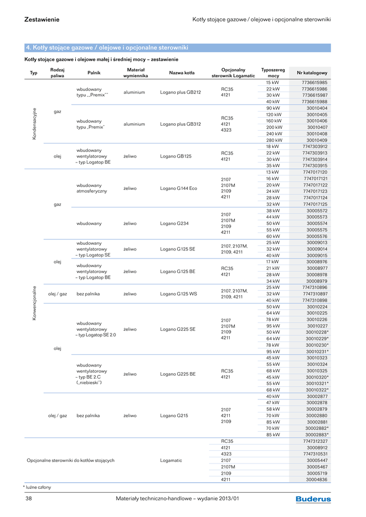 4. Kotły stojące gazowe / olejowe i opcjonalne sterowniki Zestawienie