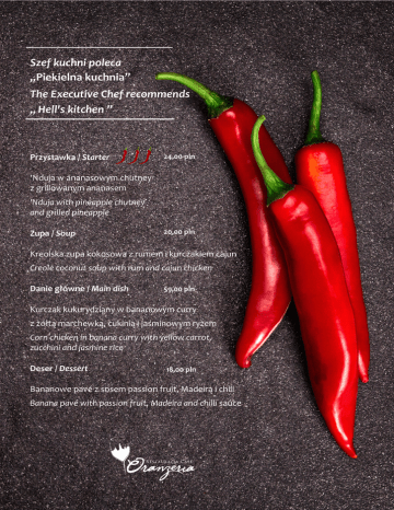Szef kuchni poleca „Piekielna kuchnia” The Executive Chef recommends „ Hell's kitchen ” Przystawka / Starter 24,00 pln 'Nduja w ananasowym chutney z grillowanym ananasem 'Nduja with pineapple chutney and grilled pineapple Zupa / Soup 20,00 pln Kreolska zupa kokosowa z rumem i kurczakiem cajun Creole coconut soup with rum and cajun chicken Danie g³ówne / Main dish 59,00 pln Kurczak kukurydziany w bananowym curry z ¿ó³t¹ marchewk¹, cukini¹ i jaœminowym ry¿em Corn chicken in banana curry with yellow carrot, zucchini and jasmine rice Deser / Dessert 18,00 pln Bananowe pavé z sosem passion fruit, Madeir¹ i chili Banana pavé with passion fruit, Madeira and chilli sauce