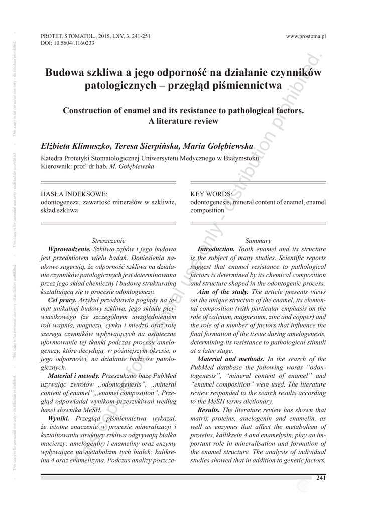 ed . www.prostoma.pl tio np roh ibit Budowa szkliwa a jego odporność na działanie czynników patologicznych – przegląd piśmiennictwa Construction of enamel and its resistance to pathological factors. A literature review Elżbieta Klimuszko, Teresa Sierpińska, Maria Gołębiewska dis tr ibu Katedra Protetyki Stomatologicznej Uniwersytetu Medycznego w Białymstoku Kierownik: prof. dr hab. M. Gołębiewska KEY WORDS: odontogenesis, mineral content of enamel, enamel composition Streszczenie Wprowadzenie. Szkliwo zębów i jego budowa jest przedmiotem wielu badań. Doniesienia naukowe sugerują, że odporność szkliwa na działanie czynników patologicznych jest determinowana przez jego skład chemiczny i budowę strukturalną kształtującą się w procesie odontogenezy. Cel pracy. Artykuł przedstawia poglądy na temat unikalnej budowy szkliwa, jego składu pierwiastkowego (ze szczególnym uwzględnieniem roli wapnia, magnezu, cynku i miedzi) oraz rolę szeregu czynników wpływających na ostateczne uformowanie tej tkanki podczas procesu amelogenezy, które decydują, w późniejszym okresie, o jego odporności, na działanie bodźców patologicznych. Materiał i metody. Przeszukano bazę PubMed używając zwrotów „odontogenesis”, „mineral content of enamel”,,,enamel composition”. Przegląd odpowiadał wynikom przeszukiwań według haseł słownika MeSH. Wyniki. Przegląd piśmiennictwa wykazał, że istotne znaczenie w procesie mineralizacji i kształtowaniu struktury szkliwa odgrywają białka macierzy: amelogeniny i enameliny oraz enzymy wpływające na metabolizm tych białek: kalikreina 4 oraz enamelizyna. Podczas analizy poszcze- Summary Introduction. Tooth enamel and its structure is the subject of many studies. Scientific reports suggest that enamel resistance to pathological factors is determined by its chemical composition and structure shaped in the odontogenic process. Aim of the study. The article presents views on the unique structure of the enamel, its elemental composition (with particular emphasis on the role of calcium, magnesium, zinc and copper) and the role of a number of factors that influence the final formation of the tissue during amelogenesis, determining its resistance to pathological stimuli at a later stage. Material and methods. In the search of the PubMed database the following words “odontogenesis”, “mineral content of enamel” and “enamel composition” were used. The literature review responded to the search results according to the MeSH terms dictionary. Results. The literature review has shown that matrix proteins, amelogenin and enamelin, as well as enzymes that affect the metabolism of proteins, kallikrein 4 and enamelysin, play an important role in mineralisation and formation of the enamel structure. The analysis of individual studies showed that in addition to genetic factors, is c op y is for pe rso na lu se on ly - HASŁA INDEKSOWE: odontogeneza, zawartość minerałów w szkliwie, skład szkliwa Th This copy is for personal use only - distribution prohibited. This copy is for personal use only - distribution prohibited. This copy is for personal use only - distribution prohibited. This copy is for personal use only - distribution prohibited. - PROTET. STOMATOL., 2015, LXV, 3, 241-251 DOI: 10.5604/.1160233 241 zinc and copper may have a significant effect on the mineralisation of the enamel. In the bioptats of the superficial layer of enamel of the worn teeth significant differences were found in the content of these elements, dependent on the degree of tooth wear. Conclusions. Suitable concentrations of certain minerals in the successive enamel layers may be indicative of the absence or presence of a disorder during enamel maturation, and thus the enamel resistance to the pathological factors or its absence. Wprowadzenie w późniejszym okresie, o jego odporności, na działanie bodźców patologicznych. tio np roh ibit ibu dis tr ly - on Materiał i metody se Przegląd piśmiennictwa przeprowadzono 1 marca 2015 roku. Przeszukano bazę PubMed używając zwrotów „odontogenesis”, „mineral content of enamel”,,,enamel composition” w zakresie lat 1995-2015. Znaleziono w sumie 2972 pozycje. Podczas wyszukiwania za pomocą wszystkich wyżej wymienionych haseł jednocześnie baza wskazała 5 pozycji. Przegląd odpowiadał wynikom przeszukiwań według haseł słownika MeSH. W przeglądzie nie wzięto pod uwagę pozycji dotyczących opisu przypadków oraz genetycznych wad szkliwa W pracy cytowano piśmiennictwo polskie i zagraniczne. W publikacji zostało także uwzględnione piśmiennictwo dotyczące czynników działających szkodliwie na szkliwo oraz 7 pozycji pochodzących z lat nie uwzględnionych w przeszukiwaniu bazy danych. for pe rso na lu Korony zębów są pokryte szkliwem, które decyduje o odporności zębów na zużycie, szczególnie podczas funkcji żucia oraz w złożonych warunkach obciążeń okluzyjnych. Szkliwo ulega starciu i w pewnym okresie życia proces ten dotyczy większości populacji (1-3). Starcie jest zjawiskiem fizjologicznym, które zachodzi w efekcie zużycia i jest to również mechanizm dostosowawczy w US do zmian, jakie zachodzą w trakcie całego życia osobniczego. Coraz więcej badań sugeruje, że odporność szkliwa, na działanie czynników patologicznych, warunkuje jego skład chemiczny i budowa strukturalna, kształtująca się w procesie odontogenezy, a uwarunkowania dietetyczne po okresie rozwoju zęba mogą nasilać ten proces (4). ed . gólnych badań stwierdzono, że oprócz czynników genetycznych istotny wpływ na procesy mineralizacji szkliwa mogą mieć cynk i miedź. W bioptatach powierzchownej warstwy szkliwa zębów startych stwierdzono istotne różnice zawartości tych pierwiastków w zależności od stopnia starcia zębów. Wnioski. Odpowiednie stężenia niektórych minerałów w kolejnych warstwach szkliwa mogą świadczyć o braku lub występowaniu zaburz