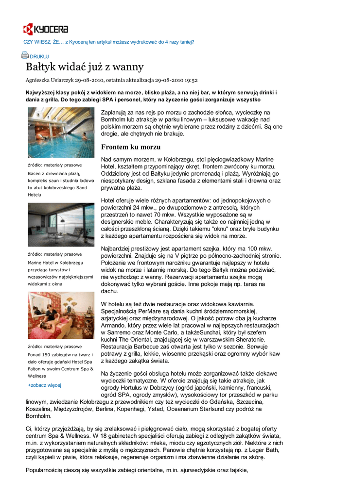 CZY WIESZ, ŻE… z Kyocerą ten artykuł możesz wydrukować do 4 razy taniej? DRUKUJ Agnieszka Usiarczyk 29-08-2010, ostatnia aktualizacja 29-08-2010 19:52 Najwyższej klasy pokój z widokiem na morze, blisko plaża, a na niej bar, w którym serwują drinki i dania z grilla. Do tego zabiegi SPA i personel, który na życzenie gości zorganizuje wszystko Zaplanują za nas rejs po morzu o zachodzie słońca, wycieczkę na Bornholm lub atrakcje w parku linowym – luksusowe wakacje nad polskim morzem są chętnie wybierane przez rodziny z dziećmi. Są one drogie, ale chętnych nie brakuje. Frontem ku morzu źródło: materiały prasowe Basen z drewniana plażą, kompleks saun i studnia lodowa to atut kołobrzeskiego Sand Hotelu źródło: materiały prasowe Marine Hotel w Kołobrzegu przyciąga turystów i wczasowiczów najpiękniejszymi widokami z okna źródło: materiały prasowe Ponad 150 zabiegów na twarz i ciało oferuje gdański Hotel Spa Nad samym morzem, w Kołobrzegu, stoi pięciogwiazdkowy Marine Hotel, kształtem przypominający okręt, frontem zwrócony ku morzu. Oddzielony jest od Bałtyku jedynie promenadą i plażą. Wyróżniają go niespotykany design, szklana fasada z elementami stali i drewna oraz prywatna plaża. Hotel oferuje wiele różnych apartamentów: od jednopokojowych o powierzchni 24 mkw., po dwupoziomowe z antresolą, których przestrzeń to nawet 70 mkw. Wszystkie wyposażone są w designerskie meble. Charakteryzują się także co najmniej jedną w całości przeszkloną ścianą. Dzięki takiemu "oknu" oraz bryle budynku z każdego apartamentu rozpościera się widok na morze. Najbardziej prestiżowy jest apartament szejka, który ma 100 mkw. powierzchni. Znajduje się na V piętrze po północno-zachodniej stronie. Położenie we frontowym narożniku gwarantuje najlepszy w hotelu widok na morze i latarnię morską. Do tego Bałtyk można podziwiać, nie wychodząc z wanny. Rezerwacji apartamentu szejka mogą dokonywać tylko wybrani goście. Inne pokoje mają np. taras na dachu. W hotelu są też dwie restauracje oraz widokowa kawiarnia. Specjalnością PerMare są dania kuchni śródziemnomorskiej, azjatyckiej oraz międzynarodowej. O jakość potraw dba ją kucharze Armando, który przez wiele lat pracował w najlepszych restauracjach w Sanremo oraz Monte Carlo, a takżeSunchai, który był szefem kuchni The Oriental, znajdującej się w warszawskim Sheratonie. Restauracja Barbecue zaś otwarta jest tylko w sezonie. Serwuje potrawy z grilla, lekkie, wiosenne przekąski oraz ogromny wybór kaw z każdego zakątka świata. Falton w swoim Centrum Spa & Na życzenie gości obsługa hotelu może zorganizować także ciekawe wycieczki tematyczne. W ofercie znajdują się takie atrakcje, jak +zobacz więcej ogrody Hortulus w Dobrzycy (ogród japoński, kamienny, francuski, ogród SPA, ogrody zmysłów), wysokościowy tor przeszkód w parku linowym, zwiedzanie Kołobrzegu z przewodnikiem czy też wycieczki do Gdańska, Szczecina, Koszalina, Międzyzdrojów, Berlina, Kopenhagi, Ystad, Oceanarium Starlsund czy podróż na Bornholm. Wellness Ci, którzy przyjeżdżają, by się zrelaksować i pielęgnować ciało, mogą skorzystać z bogatej oferty centrum Spa & Wellness. W 18 gabinetach specjaliści oferują zabiegi z odległych zakątków świata, m.in. z wykorzystaniem naturalnych składników: mleka, miodu czy egzotycznych ziół. Niektóre z nich przygotowane są specjalnie z myślą o mężczyznach. Panowie chętnie korzystają np. z Leger Bath, czyli kąpieli w piwie, która relaksuje, regeneruje organizm i ma zbawienne działanie na skórę. Popularnością cieszą się wszystkie zabiegi orientalne, m.in. ajurwedyjskie oraz tajskie, wykonywane przez rodowitą Tajkę. W części SPA dostępnej bez ograniczeń dla każdego gościa można korzystać w dwóch basenów wykonanych z nierdzewnej stali i połączonej z nimi strefy łaźni oraz sauny. Na zewnątrz zaś znajduje się hot tub, czyli całoroczne zewnętrzne jacuzzi. Można korzystać także z tureckiej łaźni hammam. Osoby, które preferują aktywny wypoczynek, z pewnością zainteresuje MarineS. Znajdują się tam nie tylko sale fitness czy też cardio fitness, ale również kort do ricochet. Organizowane są także zajęcia z jogi, body pump, pilates czy też aqua aerobik. Działa także wypożyczalnia rowerów (tuż obok hotelu przebiega ścieżka rowerowa do Ustronia Morskiego) oraz sprzętów wodnych, np. skuterów wodnych. Natomiast aby uprzyjemnić pobyt najmłodszym gościom, przygotowana została sala zabaw. Pod opieką doświadczonych animatorów dzieciaki mogą uczestniczyć w różnorodnych zajęciach, a rodzice spokojnie spędzić chwilę, nie martwiąc się o swoje pociechy. Marine Hotel otwarto w połowie lipca. Goście mogą liczyć na zniżki i promocje nawet do 20 proc. Na wakacje przygotowano pakiety zarówno rodzinne, jak i dla par. Kosztują one od 1910 zł za osobę (tygodniowy pobyt). Za dzieci do trzeciego roku życia nie trzeba płacić. Spełniają życzenia gości Wybierając się do Kołobrzegu, można zamieszkać także w czterogwiazdkowym Sand Hotelu. Wyróżnia się on przede wszystkim wielkością pokoi hotelowych (najmniejszy ma jedynie 25 mkw.) i świetnie wyposażonym centrum SPA. Dojście na plażę nie zajmuje więcej niż pięć minut. W hotelu jest basen z drewnianą plażą, kompleks saun oraz studnia lodowa. Miłośnicy sportów mają okazję poćwiczyć indywidualnie w salach lub z trenerem, który prowadzi m.in. Body Ball, BS (brzuch i streching), Body Art, Body Pump, Pilates, Aqua Aerobik i zajęcia fitness na tarasie. Przy sprzyjającej pogodzie odbywają się zajęcia na świeżym powietrzu, takie jak nordic walking, jogging, wycieczki rowerowe czy wyprawa w morze na skuterach wodnych. Dla dzieci w hotelu organizowane są m.in. konkursy plastyczne z nagrodami, zabawy tematyczne, zabawy integracyjne, wieczory baśniowe, wspólne czytanie bajek i baśni 