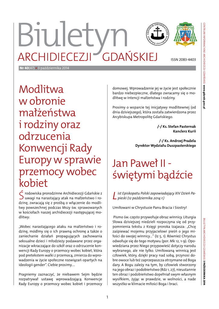 Nr 40(47) • 3 października 2014 Modlitwa w obronie małżeństwa i rodziny oraz odrzucenia Konwencji Rady Europy w sprawie przemocy wobec kobiet Ś domowej. Wprowadzenie jej w życie jest społecznie bardzo niebezpieczne, dlatego zwracamy się o modlitwę w intencji małżeństwa i rodziny. Prosimy o wsparcie tej inicjatywy modlitewnej (od dnia dzisiejszego), która została zatwierdzona przez Arcybiskupa Metropolitę Gdańskiego. Centrum Informacyjne Archidiecezji Gdańskiej www.gdansk.gosc.pl ISSN 2083-4403 /-/ Ks. Stefan Pasternak Kanclerz Kurii /-/ Ks. Andrzej Pradela Dyrektor Wydziału Duszpasterskiego Jan Paweł II świętymi bądźcie L rodowiska prorodzinne Archidiecezji Gdańskie z uwagi na narastający atak na małżeństwo i rodzinę, zwracają się z prośbą o włączenie do modlitwy powszechnej podczas Mszy św. sprawowanych w kościołach naszej archidiecezji następującej modlitwy: ist Episkopatu Polski zapowiadający XIV Dzień Papieski (12 października 2014 r.) Umiłowani w Chrystusie Panu Bracia i Siostry! „Wobec narastającego ataku na małżeństwo i rodzinę, módlmy się o ich prawną ochronę a także o zaniechanie działań propagujących zachowania seksualne dzieci i młodzieży podawane przez organizacje wkraczające do szkół oraz o odrzucenie konwencji Rady Europy o przemocy wobec kobiet, która pod pretekstem walki z przemocą, zmierza do wprowadzenia w życie społeczne rozwiązań opartych na ideologii gender”. Ciebie prosimy…. Pragniemy zaznaczyć, że niebawem Sejm będzie rozpatrywał ustawę wprowadzającą Konwencje Rady Europy o przemocy wobec kobiet i przemocy 1 Biuletyn Archidiecezji Gdańskiej 3 października 2014 Pismo św. często przywołuje obraz winnicy. Liturgia Słowa dzisiejszej niedzieli rozpoczyna się od przypomnienia tekstu z Księgi proroka Izajasza: „Chcę zaśpiewać mojemu przyjacielowi pieśń o jego miłości do swojej winnicy…” (Iz 5, 1). Również Chrystus odwołuje się do tego motywu (por. Mk 12, 1-9). Opowiedziana przez Niego przypowieść dotyczy narodu wybranego, ale nie tylko. Umiłowaną winnicą jest człowiek, który, dzięki pracy nad sobą, przynosi dobre owoce lub też zaprzepaszcza otrzymane od Boga dary. A Bogu zależy na tym, by człowiek stworzony na jego obraz i podobieństwo (Rdz 1, 27), nieustannie ten obraz i podobieństwo dopełniał swym własnym wysiłkiem, żyjąc w prawdzie, w wolności, a nade wszystko w klimacie miłości Boga i braci. Centrum Informacyjne Archidiecezji Gdańskiej www.gdansk.gosc.pl nr 40 (297) Lubaczowie: „Wiara i szukanie świętości jest sprawą prywatną tylko w tym sensie, że nikt nie zastąpi człowieka w jego osobistym spotkaniu z Bogiem. (…) Postulat neutralności światopoglądowej jest słuszny głównie w tym zakresie, że państwo powinno chronić wolność sumienia i wyznania wszystkich swoich obywateli, niezależnie od tego, jaką religię lub światopogląd oni wyznają. Ale postulat, ażeby do życia społecznego i państwowego w żaden sposób nie dopuszczać wymiaru świętości, jest postulatem ateizowania państwa i życia społecznego i niewiele ma wspólnego ze światopoglądową neutralnością”. Zdaniem Jana Pawła II świętość nigdy nie osłabia życia publicznego, ale je dynamizuje wznosząc na wyższy poziom. Dojrzała świętość obywateli zawsze służyła wielkości Rzeczypospolitej. Ogołacanie człowieka z tych wartości prowadzi do jego degradacji i jest przyczyną wielu życiowych tragedii. Ich brak powodował w historii niezwykle bolesne, często trwające przez wieki dramaty w skali narodu. Świętość nie rodzi się w próżni. Rozwój i wzrastanie do świętości domagają się przyjaznego środowiska, wspólnoty żyjącej ewangelicznymi zasadami, gwarantującej wzajemne wsparcie. 1. Potrzeba świętości Już za tydzień będziemy przeżywać XIV Dzień Papieski pod hasłem „Jan Paweł II – Świętymi bądźcie!” Słowa te zostały zaczerpnięte z Księgi Kapłańskiej, gdzie Pan Bóg nawołuje: „Bądźcie więc świętymi, bo Ja jestem święty!” (Kpł 11, 45). Wezwanie do świętości jest jedną z przewodnich myśli Starego i Nowego Testamentu oraz fundamentalną troską Kościoła o każdego z nas. Świat różnie podchodzi do świętości. Jest ona tematem z jednej strony obcym współczesnej mentalności, a z drugiej niezwykle pożądanym. Niektórzy zdają się nie interesować świętością w ogóle, czasem odrzucają ją jako niemożliwą do osiągnięcia lub nawet niepotrzebną. Tymczasem Jan Paweł II przekonywał, że świętość jest głębokim, choć czasem nieuświadomionym pragnieniem człowieka oraz odpowiedzią na wiele nurtujących nas problemów. Niewątpliwie dążąc do świętości powinniśmy unikać wszystkiego co ją wypacza. Nie można ograniczać świętości jedynie do praktyk pobożnych. Trudno ją odnaleźć także w postawie ucieczki przed życiem, odpowiedzialnością czy światem. Świętość to nie tylko troska o piękno własnego człowieczeństwa, ale to więź z Bogiem oraz bohaterskie niekiedy otwarcie się na człowieka. Zamieńmy tę teoretyczną refleksję na przykład świętości Jana Pawła II. 3. Kanonizacja Jana XXIII i Jana Pawła II Niedawne uroczystości kanonizacyjne dwóch papieży były głębokim doświadczeniem duchowym. Wierząc w świętych obcowanie, zwracamy się do nich z prośbami i ufamy, że pomogą nam jako nasi orędownicy przed Bogiem. Świadectwa świętych Jana XXIII i Jana Pawła II są tym silniejsze, że zostały złożone w niełatwych czasach. Ich życie było naznaczone przez systemy totalitarne i najokrutniejsze w historii świata wojny. W homilii kanonizacyjnej Ojciec Święty Franciszek podkreślił, że papieże Jan XXIII i Jan Paweł II: „Byli kapłanami, biskupami i papieżami dwudziestego wieku. Poznali jego tragedie, ale nie byli nimi przytłoczeni. Silniejszy był w nich Bóg”. Papież podkreślił, że nadzieja i rad