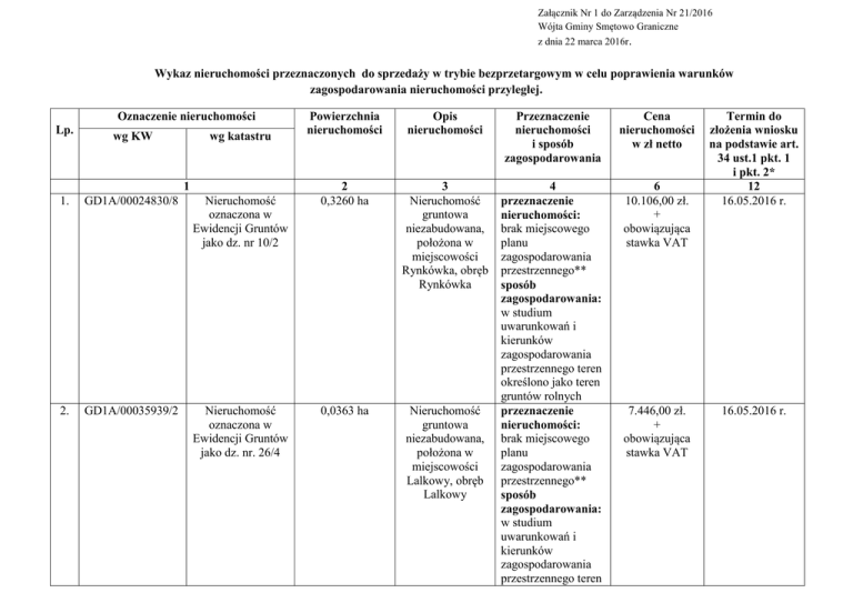 Załącznik Nr 1 do Zarządzenia Nr 21/2016 Wójta Gminy Smętowo Graniczne z dnia 22 marca 2016r. Wykaz nieruchomości przeznaczonych do sprzedaży w trybie bezprzetargowym w celu poprawienia warunków zagospodarowania nieruchomości przyległej. Oznaczenie nieruchomości Lp. wg KW 1. GD1A/00024830/8 Nieruchomość oznaczona w Ewidencji Gruntów jako dz. nr 10/2 2. GD1A/00035939/2 Nieruchomość oznaczona w Ewidencji Gruntów jako dz. nr. 26/4 wg katastru 1 Powierzchnia nieruchomości Opis nieruchomości Przeznaczenie nieruchomości i sposób zagospodarowania Cena nieruchomości w zł netto 2 0,3260 ha 3 Nieruchomość gruntowa niezabudowana, położona w miejscowości Rynkówka, obręb Rynkówka 6 10.106,00 zł. + obowiązująca stawka VAT 0,0363 ha Nieruchomość gruntowa niezabudowana, położona w miejscowości Lalkowy, obręb Lalkowy 4 przeznaczenie nieruchomości: brak miejscowego planu zagospodarowania przestrzennego** sposób zagospodarowania: w studium uwarunkowań i kierunków zagospodarowania przestrzennego teren określono jako teren gruntów rolnych przeznaczenie nieruchomości: brak miejscowego planu zagospodarowania przestrzennego** sposób zagospodarowania: w studium uwarunkowań i kierunków zagospodarowania przestrzennego teren 7.446,00 zł. + obowiązująca stawka VAT Termin do złożenia wniosku na podstawie art. 34 ust.1 pkt. 1 i pkt. 2* 12 16.05.2016 r. 16.05.2016 r. 3. GD1A/00035939/2 Nieruchomość oznaczona w Ewidencji Gruntów jako dz. nr. 26/5 0,0352 ha Nieruchomość gruntowa niezabudowana, położona w miejscowości Lalkowy, obręb Lalkowy określono jako teren zabudowy mieszkaniowej przeznaczenie nieruchomości: brak miejscowego planu zagospodarowania przestrzennego** sposób zagospodarowania: w studium uwarunkowań i kierunków zagospodarowania przestrzennego teren określono jako teren zabudowy mieszkaniowej 7.218,00 zł. + obowiązująca stawka VAT 16.05.2016 r. 5) Termin zagospodarowania nieruchomości – nie dotyczy, 7) Wysokość stawek procentowych opłat z tytułu użytkowania wieczystego – nie dotyczy, 8) Wysokość opłat z tytułu użytkowania, najmu lub dzierżawy – nie dotyczy, 9) Terminy wnoszenia opłat – nie dotyczy, 10) Zasady aktualizacji opłat – nie dotyczy, *) ustala się 6-cio tygodniowy termin (licząc od dnia wywieszenia niniejszego wykazu) do złożenia wniosku przez osoby, którym przysługuje pierwszeństwo w nabyciu nieruchomości na podstawie art. 34 ust. 1 pkt. 1 i 2 ustawy z dnia 21 sierpnia 1997r. o gospodarce nieruchomościami. **) miejscowy plan ogólny zagospodarowania przestrzennego gminy Smętowo Graniczne zatwierdzony Uchwałą Nr XXII/108/92 Rady Gminy w Smętowie Granicznym z dnia 17.08.1992r. stracił ważność 31.12.2003r. Wykaz niniejszy podlega wywieszeniu na tablicy ogłoszeń w siedzibie Urzędu Gminy w Smętowie Granicznym przez okres 21 dni, tj. od dnia 1 kwietnia 2016r. w Biuletynie Informacji Publicznej oraz w prasie lokalnej o zasięgu powiatu.