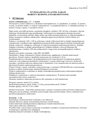 1 Załącznik nr 8 do SIWZ WYPOSAŻENIA PLACÓW ZABAW ROBOTY BUDOWLANO-REMONTOWE 1. SP Oparzno Zestaw wielofunkcyjny „A” – 1 zestaw Dwuwieżowy zestaw zabawowy z daszkami czterospadowym, 1x zjeżdżalnia, 2x schody, 3x pomost wysoki, 2x pomost średni, 1x wejście wspinaczkowe, 1x przeplotnia łukowa, 1x drabinka pozioma, 1x pomost wiszący z gumy, 1x przejście rurowe. Słupy nośne oraz belki poziome o przekroju okrągłym i średnicy 100 i 60 mm, wykonane z drewna klejonego lub bezrdzeniowego powlekanego wielowarstwowo preparatami chroniącymi przed pękaniem, zwietrzeniem, pleśnią. Słupy nośne oraz belki poziome połączone ze sobą prostopadle w jednej osi poprzez siodłowe zakończenie, zabezpieczające przed obrotem wokół własnej osi i rozchwianiem. Podesty o wymiarach 1,00 x 1,00 m wykonane z desek ryflowanych lub ze sklejki antypoślizgowej, wmontowane w podfrezowane zagłębienia poziomych belek stanowiących elementy konstrukcyjne. Schody wejściowe, zabiegowe wykonane ze stalowej konstrukcji malowanej proszkowo. Stopnice trójkątne wykonane ze sklejki antypoślizgowej. Podparte belkami z drewna klejonego lub bezrdzeniowego o średnicy 100 mm, połączonych z nogą wieży prostopadle poprzez siodłowe zakończenie. Barierki oraz daszki wykonane z płyt HPL lub HDPE. Zjeżdżalnia o ślizgu wykonanym z blachy nierdzewnej, zagłębionej w burtach malowanych proszkowo. Poziom startowy zjeżdżalni usytuowany na wysokości 1,10 m. Przeplotnia łukowa wykonana z lin polipropylenowych wzmocnionych wewnętrznym splotem stalowym. Liny połączone łącznikami wykonanymi z wysoko udarowego tworzywa. Końcówki mocujące z gwintem stalowym zaprasowane w aluminium. Liny zamontowane na stalowej ramie o łukowatym kształcie malowanej proszkowo. Pomost wiszący z gumy wykonany z pasa gumowego o szerokości 300 lub 600 mm wzmocnionego kordem ze splotu syntetycznego uniemożliwiającym rozerwanie. Wejście wspinaczkowe wykonane ze sklejki wodoodpornej pomalowanej wodorozpuszczalnymi farbami akrylowymi. Dodatkowo wyposażone w uchwyty (kamienie) wspinaczkowe. W górnej części posiada znormalizowane otwory wejściowe. Elementy metalowe malowane proszkowo lub wykonane ze stali nierdzewnej. Wymiary zestawu: około 8,75 x 6,65m Strefa bezpieczeństwa: około 10,00 x 11,25m, powierzchnia strefy 76,60m2 Produkt zgodny z PN EN 1176-1:2009 Montaż na kotwach - Nogi belek zamontowane w gruncie za pomocą stalowych kotew połączonych z belką przy użyciu jednego, centralnie usytuowanego złącza gwintowanego. Kotwy zabezpieczone przed korozją poprzez cynkowanie. Karuzela – 1 szt. Konstrukcja i ramiona karuzeli wykonana z rur stalowych. Element obrotowy oparty na konstrukcji złożonej z dwóch łożysk. Całość malowana metodą proszkową odporną na warunki atmosferyczne. Talerz płyta ryflowana, aluminiowa Wszelkie śruby i mocowania wystawione na działanie warunków zewnętrznych nierdzewne, od strony wewnętrznej w plastikowych zaślepkach. Siedziska karuzeli wykonane ze sklejki wodoodpornej. 2 Kotwienie: Zagłębione około 75cm w gruncie. Wymiary: około 155 x 155cm; Strefa bezpieczeństwa: około 555 x 555cm; powierzchnia strefy 17,45m2 Wysokość całkowita: około 85cm. Produkt zgodny z PN EN 1176-1:2009 2. SP Lekowo Zestaw wielofunkcyjny „A” – 1 zestaw Dwuwieżowy zestaw zabawowy z daszkami czterospadowym, 1x zjeżdżalnia, 2x schody, 3x pomost wysoki, 2x pomost średni, 1x wejście wspinaczkowe, 1x przeplotnia łukowa, 1x drabinka pozioma, 1x pomost wiszący z gumy, 1x przejście rurowe. Słupy nośne oraz belki poziome o przekroju okrągłym i średnicy 100 i 60 mm, wykonane z drewna klejonego lub bezrdzeniowego powlekanego wielowarstwowo preparatami chroniącymi przed pękaniem, zwietrzeniem, pleśnią. Słupy nośne oraz belki poziome połączone ze sobą prostopadle w jednej osi poprzez siodłowe zakończenie, zabezpieczające przed obrotem wokół własnej osi i rozchwianiem. Podesty o wymiarach 1,00 x 1,00 m wykonane z desek ryflowanych lub ze sklejki antypoślizgowej, wmontowane w podfrezowane zagłębienia poziomych belek stanowiących elementy konstrukcyjne. Schody wejściowe, zabiegowe wykonane ze stalowej konstrukcji malowanej proszkowo. Stopnice trójkątne wykonane ze sklejki antypoślizgowej. Podparte belkami z drewna klejonego lub bezrdzeniowego o średnicy 100 mm, połączonych z nogą wieży prostopadle poprzez siodłowe zakończenie. Barierki oraz daszki wykonane z płyt HPL lub HDPE. Zjeżdżalnia o ślizgu wykonanym z blachy nierdzewnej, zagłębionej w burtach malowanych proszkowo. Poziom startowy zjeżdżalni usytuowany na wysokości 1,10 m. Przeplotnia łukowa wykonana z lin polipropylenowych wzmocnionych wewnętrznym splotem stalowym. Liny połączone łącznikami wykonanymi z wysoko udarowego tworzywa. Końcówki mocujące z gwintem stalowym zaprasowane w aluminium. Liny zamontowane na stalowej ramie o łukowatym kształcie malowanej proszkowo. Pomost wiszący z gumy wykonany z pasa gumowego o szerokości 300 lub 600 mm wzmocnionego kordem ze splotu syntetycznego uniemożliwiającym rozerwanie. Wejście wspinaczkowe wykonane ze sklejki wodoodpornej pomalowanej wodorozpuszczalnymi farbami akrylowymi. Dodatkowo wyposażone w uchwyty (kamienie) wspinaczkowe. W górnej części posiada znormalizowane otwory wejściowe. Elementy metalowe malowane proszkowo lub wykonane ze stali nierdzewnej. Wymiary zestawu: około 8,75 x 6,65m Strefa bezpieczeństwa: około 10,00 x 11,25m, powierzchnia strefy 76,60m2 Produkt zgodny z PN EN 1176-1:2009 Montaż na kotwach - Nogi belek zamontowane w gruncie za pomocą stalowych kotew połączonych z belką przy użyciu jednego, centralnie usytuowanego złącza gwintowanego. Kotwy zabezpieczone przed korozją poprzez cynkowanie. 3. SP Bierzwnica Zestaw wielofunkcyjny „B” – 1 zestaw Zestaw zawiera 2x zjeżdżalnia, 5x pomost, 2x pomost niski, 2x pomost skośny krótki, 1x pomost wiszący,1x drabinka pozioma,