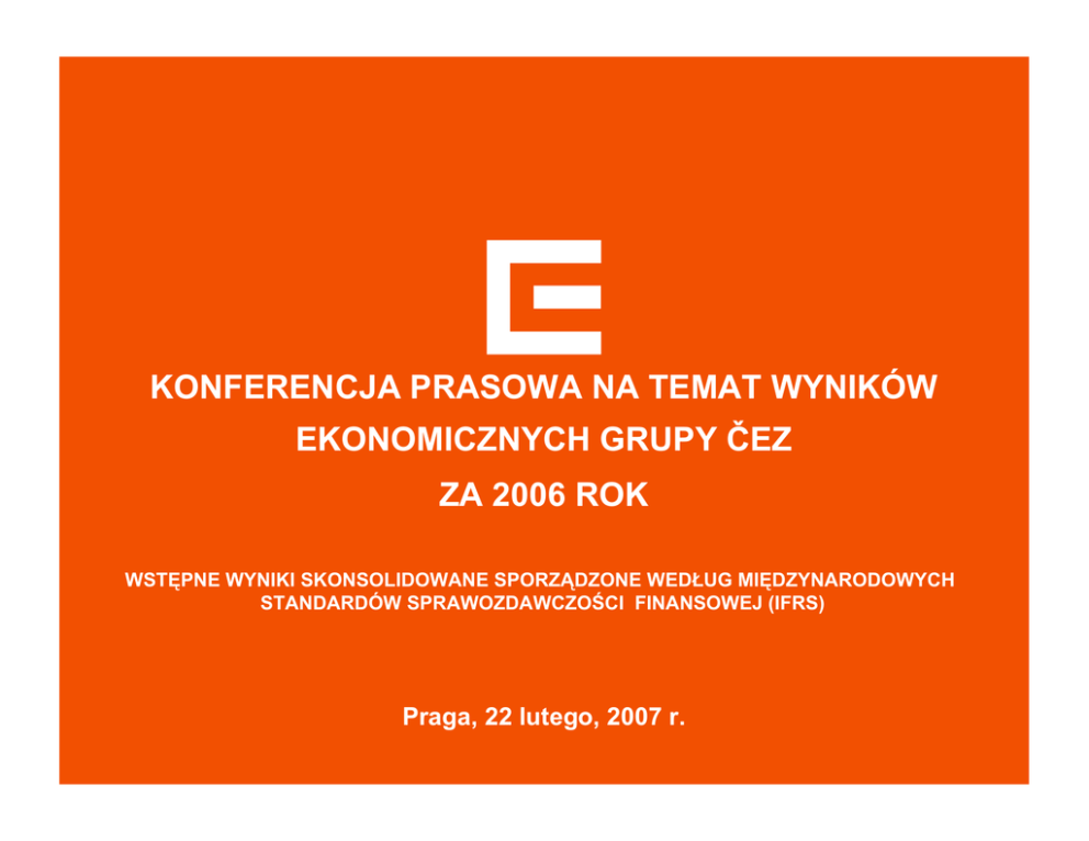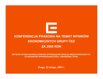 KONFERENCJA PRASOWA NA TEMAT WYNIKÓW EKONOMICZNYCH GRUPY ČEZ ZA 2006 ROK WSTĘPNE WYNIKI SKONSOLIDOWANE SPORZĄDZONE WEDŁUG MIĘDZYNARODOWYCH STANDARDÓW SPRAWOZDAWCZOŚCI FINANSOWEJ (IFRS) Praga, 22 lutego, 2007 r. Główne wyniki Grupy ČEZ za rok 2006 Martin Roman, Prezes Zarządu i Dyrektor Generalny Wyniki ekonomiczne Petr Vobořil, Dyrektor Departamentu Finansów Pozycja handlowa Grupy ČEZ Alan Svoboda, Dyrektor Departamentu Handlu GŁÓWNE WYNIKI ZA ROK 2006 I OCZEKIWANY STAN RZECZYWISTY W 2007 ROKU zysk operacyjny przed amortyzacją (EBITDA) wzrósł w stosunku do analogicznego okresu ubiegłego roku o 28%, do 64,3 miliarda CZK, czyli o 14,2 miliarda CZK zysk operacyjny (EBIT) wzrósł w stosunku do analogicznego okresu ubiegłego roku o 36%, do 36,9 miliarda CZK, czyli o 10,7 miliarda CZK zysk netto wzrósł w stosunku do analogicznego okresu ubiegłego roku o 29%, do 28,8 miliarda CZK (o 6,5 miliarda CZK) stopa rentowności kapitału własnego wzrosła w stosunku do analogicznego okresu ubiegłego roku z 12,3% do 14,9%. cena akcji na BCPP (Praska Giełda Papierów Wartościowych) i GPW 14.02.2007 r. wynosiła 940 CZK oczekiwany stan rzeczywisty na rok 2007: EBITDA w wysokości 70,9 miliarda CZK (wzrost o 10%) oraz zysk netto w wysokości 35,1 miliarda CZK (wzrost o 22%) W 2006 ROKU WSKAŹNIK EBITDA OSIĄGNĄŁ 64,3 MILIARDA CZK, EBIT 40,1 MILIARDA CZK, A ZYSK NETTO 28,5 MILIARDA CZK Główne wskaźniki finansowe w mld CZK + 10 % 80 + 28 % 70 60 EBITDA 50 64,3 70,9 50,1 40 30 20 10 0 2005 2006 60 + 21 % + 36 % 50 40 EBIT 2007E 48,5 40,1 29,4 30 20 10 0 2005 2006 + 22 % 40 35 ZYSK NETTO 30 25 2007E + 29 % 35,1 28,8 22,3 20 15 10 5 0 2005 2006 2007E Ze względu na duży stopień niezawodności pracy elektrowni jądrowej Temelín zwiększamy oczekiwany zysk netto na rok 2007 o 1,1 miliarda CZK. AKCJE ČEZ PO ICH WPROWADZENIU NA WARSZAWSKĄ GIEŁDĘ OSIĄGNĘŁY W GRUDNIU POZIOM 1010 CZK, A 15 LUTEGO 927 CZK Zachowanie się cen akcji i indeksów akcyjnych Dual listing w Warszawie 150% 140% Akcje ČEZ są od 25.10.2006 r. w obrocie na giełdzie warszawskiej 130% ČEZ jest uwzględniany w indeksie blue chip WIG WIG20 z wagą 2,23%. 120% 110% 100% 90% na dzień 15.02.2007 927,1 CZK na dzień 2.01.2006 742,8 CZK 80% 70% styczeń marzec maj lipiec 2006 2006 2006 2006 ČEZ wrzesień 2006 Bloomberg Utilities Index listopad 2006 PX50 styczeń 2007 GRUPA ČEZ WYTWARZA NAJWIĘKSZĄ WARTOŚĆ DLA SWOICH AKCJONARIUSZY ZE WSZYSTKICH FIRM NOTOWANYCH NA PRASKIEJ GIEŁDZIE PAPIERÓW WARTOŚCIOWYCH Zachowanie się wskaźnika EVA (Economic Value Added) w stosunku do analogicznego okresu ubiegłego roku w mld CZK 12 10,2 10 8 6 5,0 2 0 -4 1. miejsce spośród wszystkich firm będących w obrocie na Praskiej Giełdzie Papierów Wartościowych 2. miejsce spośród wszystkich firm w Republice Czeskiej. 4 -2 W ratingu The 2005 EVATM Ranking Czech Republic (agencja ČEKIA) ČEZ zajął 2004 -2,5 2005 2006 ČEZ osiągnął największy wzrost EVA w stosunku do analogicznego okresu ubiegłego roku spośród wszystkich firm w Republice Czeskiej. UDZIAŁ AKWIZYCJI ZAGRANICZNYCH W STOSUNKU DO UBIEGŁEGO ROKU ZWIĘKSZYŁ SIĘ PONAD DWUKROTNIE EBITDA w mld CZK W 2006 roku Grupa ČEZ 70 65 64,3 50,1 4,7 60 50 Za granicą 2,4x 55 2,0 59,6 W kraju 45 48,1 40 35 30 2005 2006 kontynuowała integrację spółek dystrybucyjnych w Bułgarii i w Rumunii. Nowe akwizycje dotyczyły elektrowni ELCHO i Skawina w Polsce oraz elektrowni w Warnie, w Bułgarii, o całkowitej mocy zainstalowanej 2 090 MW. Zagraniczne akwizycje przyniosły na poziomie EBITDA ogółem 4,7 miliarda CZK. W stosunku do analogicznego okresu ubiegłego roku oznacza to wzrost o 2,7 miliarda CZK. WKŁAD ZAGRANICZNYCH AKWIZYCJI Bułgaria – dystrybucja 2500 2500 2000 2000 1500 1500 1500 1000 1000 1000 500 500 0 0 +28 % +142 % 1 940 2000 1 576 1 395 n. a. 2005 Wybrane wyniki roku 2006 Wyzwa nia roku 2007 Polska* 2500 2 019 2000 EBITDA (w mld CZK) Rumunia* Bułgaria – Warna* 2500 2006 Wzrost wolumenu energii elektrycznej sprzedanej odbiorcom końcowym o 2,3%, do 8,2 TWh równocześnie obniżenie strat dystrybucyjnych. Udane przygotowanie unbundlingu – nowe spółki, oddzielne cenniki stawek Zmiana ram prawnych regulacji dystrybucji – mały wzrost regulowanych cen Przeprowadzenie unbundlingu (od 3 stycznia 2007) Oszczędności inwestycji i kosztów operacyjnych 283 89** 500 1500 803 1000 564** 266** 500 n. a. 0 2005 2006 0 2005 2006 Produkcja: 3 TWh – Wzrost marży brutto o 507 największa produkcja za ostatnie 13 lat Oszczędność kosztów prac konserwatorskich o 20% milionów CZK, przy niewielkim zmniejszeniu udziału na rynku Wolumen energii elektrycznej dystrybuowanej do klientów końcowych 8,6 TWh Wzrost produkcji do 4 TWh i zapewnienie paliwa Inwestycje w zwiększenie ekologiczności produkcji Integracja w związku z dalszymi akwizycjami w Bułgarii i oszczędności kosztów operacyjnych 2006 Produkcja 2,4 ** TWh, Przeprowadzenie unbundlingu (od 1 lipca 2007 r.) Zakończenie procesu integracji i oszczędności kosztów (wykorzystanie doświadczeń z projektu WIZJA 2008 na czeskim rynku) *) linia przerywana za cały rok; linia pełna wyłącznie od daty akwizycji – uwzględnienie w całości konsolidacyjnej Grupy ČEZ **) wpływ na wyniki skonsolidowane od daty akwizycji 2005 względnie 4,1 TWh Produkcja energii elektrycznej z biomasy w elektrowni Skawina w wysokości 60 GWh **, względnie 80 GWh Optymalizacja sprzedaży nadwyżek zezwoleń na CO2 Poszukiwanie rozwiązania dla długotrwałych kontraktów (ELCHO) Wzrost spalania biomasy i sprzedaży ciepła w Skawinie Oszczędności kosztów prac konserwatorskich Inwestycje w poprawę ekologiczności GŁÓWNE PRIORYTETY NA 2007 ROK Zakończenie integracji regionalnych spółek zależnych, zwiększanie efektywności Grupy ČEZ – zakończenie projektu WIZJA 2008 Integracja zagranicznych spółek zależnych, nowe akwizycje i budowa źródeł za granicą (Gacko) Kontynuacja odnowy źródeł p