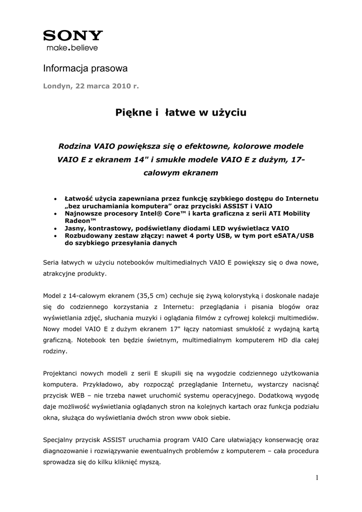 Informacja prasowa Londyn, 22 marca 2010 r. Piękne i łatwe w użyciu Rodzina VAIO powiększa się o efektowne, kolorowe modele VAIO E z ekranem 14" i smukłe modele VAIO E z dużym, 17calowym ekranem Łatwość użycia zapewniana przez funkcję szybkiego dostępu do Internetu „bez uruchamiania komputera” oraz przyciski ASSIST i VAIO Najnowsze procesory Intel® Core™ i karta graficzna z serii ATI Mobility Radeon™ Jasny, kontrastowy, podświetlany diodami LED wyświetlacz VAIO Rozbudowany zestaw złączy: nawet 4 porty USB, w tym port eSATA/USB do szybkiego przesyłania danych Seria łatwych w użyciu notebooków multimedialnych VAIO E powiększy się o dwa nowe, atrakcyjne produkty. Model z 14-calowym ekranem (35,5 cm) cechuje się żywą kolorystyką i doskonale nadaje się do codziennego korzystania z Internetu: przeglądania i pisania blogów oraz wyświetlania zdjęć, słuchania muzyki i oglądania filmów z cyfrowej kolekcji multimediów. Nowy model VAIO E z dużym ekranem 17" łączy natomiast smukłość z wydajną kartą graficzną. Notebook ten będzie świetnym, multimedialnym komputerem HD dla całej rodziny. Projektanci nowych modeli z serii E skupili się na wygodzie codziennego użytkowania komputera. Przykładowo, aby rozpocząć przeglądanie Internetu, wystarczy nacisnąć przycisk WEB – nie trzeba nawet uruchomić systemu operacyjnego. Dodatkową wygodę daje możliwość wyświetlania oglądanych stron na kolejnych kartach oraz funkcja podziału okna, służąca do wyświetlania dwóch stron www obok siebie. Specjalny przycisk ASSIST uruchamia program VAIO Care ułatwiający konserwację oraz diagnozowanie i rozwiązywanie ewentualnych problemów z komputerem – cała procedura sprowadza się do kilku kliknięć myszą. 1 Wszystkie modele VAIO E z ekranami 14" i 17" są oparte na procesorach Intel® Core™ z nowej rodziny na rok 2010 i wyposażone w maksymalnie 4 GB szybkiej pamięci DDR3. Za efektywne przetwarzanie obrazu, odtwarzanie filmów HD i wyświetlanie multimedialnych stron www odpowiada najnowocześniejsza karta graficzna ATI Mobility Radeon™. Z boku komputera znajdują się trzy porty USB. Uzupełnia je czwarty, dwufunkcyjny port eSATA/USB, który pozwala przesyłać pliki na zewnętrzny napęd nawet 5 razy szybciej niż interfejs USB2.0. Unikatową cechą komputerów VAIO jest szereg firmowych programów Sony ułatwiających korzystanie z multimediów. Naciskając znajdujący się z przodu obudowy przycisk VAIO, można uruchomić program Media Gallery, i przy jego użyciu intuicyjnie przeglądać kolekcję muzyki, zdjęć i filmów. Program PMB (Picture Motion Browser) VAIO Edition znakomicie ułatwia sortowanie, edycję i prezentowanie filmów. Seria VAIO E 14" 14-calowe modele VAIO z serii E wyróżniają się łatwo rozpoznawalną stylistyką. Oprócz błyszczących wersji: białej i czarnej, dostępne są odmiany w żywym kolorze różowym, niebieskim i zielonym, które pozwalają skutecznie wyróżnić się z tłumu. Srebrne logo VAIO na pokrywie notebooka sprawia wrażenie zawieszonego w powietrzu i podkreśla głębię eleganckiego wykończenia, pod którym widać fascynującą fakturę materiału pokrywy. Po otwarciu komputera znajdziemy natomiast przyjemny w dotyku, gładki touchpad wtapiający się w połyskujący, półprzezroczysty wspornik na nadgarstki. 14-calowy (35,5 cm), podświetlany diodami LED wyświetlacz VAIO ma rozdzielczość 1600 x 900 pikseli i panoramiczny kształt (16:9). Zapewnia żywą kolorystykę i duży kontrast oglądanych filmów, fotografii cyfrowych i innych materiałów. Seria VAIO E 17" W ofercie Sony pojawił się teraz w pełni wyposażony zamiennik komputera stacjonarnego, który spełni wszystkie potrzeby użytkowników komputera w domu. Nowe, 17-calowe modele VAIO E wyróżniają się dużym ekranem i smukłą, elegancką obudową, doskonale wyglądającą w każdym z domowych pomieszczeń. Duży, 17,3-calowy (43,8 cm) wyświetlacz VAIO z podświetleniem LED cechuje się kontrastowością i szczegółowością obrazu zarówno przy edycji zdjęć, jak i przegladaniu stron internetowych. Rozdzielczość Full HD (1920 x 1080), gwarantuje jeszcze wyższą jakość wyświetlania cyfrowych zdjęć lub filmów z płyt Blu-ray Disc™. 2 Znakomicie reagująca klawiatura zawiera pełnowymiarowy blok numeryczny, który bardzo ułatwia szybkie wprowadzanie danych – zarówno w czasie gry, jak i przy zarządzaniu domowym budżetem. Najnowsze, multimedialne notebooki VAIO E serii 14 i 17 powinny być dostępne odpowiednio pod koniec marca i pod koniec kwietnia 2010. Model VAIO VPCEA1S1E Procesor Intel® Core™ i3-330M 2,13 GHz VAIO VPCEC1S1E Intel® Core™ i5-430M 2,26 GHz z technologią Intel® Turbo Boost (maks. 2,53 GHz) Oryginalny Windows® 7 Home Premium Oryginalny Windows® 7 Home Premium (64 bity) (64 bity) Pamięć 4 GB DDR3 SDRAM (1066 MHz) 4 GB DDR3 SDRAM (1066 MHz) Twardy dysk 500 GB (5400 obr./min) 500 GB (5400 obr./min) Wyświetlacz VAIO 35,5 cm (14,0") Wyświetlacz VAIO 43,8 cm (17,3") z technologią diod LED, 16:9, z technologią diod LED, 16:9, rozdzielczość 1600 x 900 rozdzielczość 1920 x 1080 Karta graficzna ATI Mobility Radeon™ HD Karta graficzna ATI Mobility Radeon™ HD 5145 z 512 MB pamięci VRAM 5650 z 1 GB pamięci VRAM SYSTEM Ekran Grafika Napęd optyczny Waga i wymiary DVD+-RW / +-R DL / RAM *BD ROM / DVD+-RW / +-R DL / RAM 2,35 kg (z dostarczonym akumulatorem); 3,3 kg (z dostarczonym akumulatorem); 238,7 x 27,3 x 345,8 mm (gł. x wys. x 273,8 x 31,9 x 409,1 mm (gł. x wys. x szer.) szer.) WLAN 802.11b/g/n; Bluetooth 2.1+EDR; kamera MOTION EYE®; dźwięk stereo i system Dolby Home Theater 3; wyjście Inne Odtwarzacz Blu-ray Disc™ HDMI; 3 x USB + eSATA/USB; przyciski WEB / ASSIST / VAIO z funkcją szybkiego dostępu do Internetu; obudowa w kolorze czarnym, białym, różowym, niebieskim lub zielonym WLAN 802.11b/g/n; Bluetooth 2.1+EDR; kamera MOTION EYE®; dźwięk stereo i