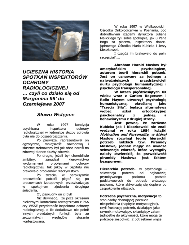 W roku 1997 w Wielkopolskim Ośrodku Onkologicznym w Poznaniu, pod dobrotliwymi rządami dyrektora Juliana Malickiego żyli sobie spokojnie, jak u Pana Boga za piecem, inspektorzy dozoru jądrowego Ośrodka Maria Kubicka i Jerzy Kieszkowski. I czegóż im brakowało do pełni szczęścia?.... UCIESZNA HISTORIA SPOTKAŃ INSPEKTORÓW OCHRONY RADIOLOGICZNEJ … czyli co działo się od Margonina 98’ do Czerniejewa 2007 Słowo Wstępne W roku 1997 kondycja psychiczna inspektora ochrony radiologicznej w jednostce służby zdrowia była nie do pozazdroszczenia. Po pierwsze, reprezentował on egzotyczną mniejszość zawodową i słusznie traktowany był jak obca narośl na zdrowej tkance służby zdrowia. Po drugie, jeżeli był chorobliwie ambitny, zanudzał kierownictwo wydumanymi problemami ochrony radiologicznej, tak jakby w Szpitalu nie brakowało problemów rzeczywistych. Po trzecie, w paroksyzmie pracowitości potrafił plątać się po pracowniach izotopowych przeszkadzając w spokojnym zjedzeniu drugiego śniadania. Oj, paskudny on ci był! Nic dziwnego, że poza okresami nielicznymi kontrolami zewnętrznymi z PAA czy WSSE przydatność inspektora ochrony radiologicznej, o ile dodatkowo nie pełnił innych przydatnych funkcji, była ze zrozumiałych względów słusznie kontestowana. Abraham Harold Maslow był amerykańskim psychologiem, autorem teorii hierarchii potrzeb. Jest on uznawany za jednego z najważniejszych przedstawicieli nurtu psychologii humanistycznej i psychologii transpersonalnej. W latach pięćdziesiątych XX wieku wraz z Carlem Rogersem i Rollo Mayem utworzył psychologię humanistyczną, określaną jako "Trzecia Siła", będącą alternatywą wobec szkół ortodoksyjnej psychoanalizy z jednej, a behawioryzmu z drugiej strony. Jest pewne, że zarówno Kubicka jak i Kieszkowski nie znali wydanej w roku 1954 książki Motivation and Personality, w której Maslow rozwinął teorię hierarchii potrzeb ludzkich tzw. Piramidy Maslowa, jednak mając na uwadze sekwencje zdarzeń, które wystąpiły należy stwierdzić, że prawdziwość piramidy Maslowa jest faktem bezspornym. Hierarchia potrzeb– w psychologii – sekwencja potrzeb od najbardziej prymitywnego poziomu potrzeb podstawowych do potrzeb wyższego poziomu, które aktywizują się dopiero po zaspokojeniu niższych. Potrzeba psychiczna, motywacja to stan osoby doznającej poczucie niespełnienia (napięcie motywacyjne), czyli frustrację potrzeb, działający jako czynnik motywujący, skłaniający zatem jednostkę do aktywności, które mogą tę potrzebę zaspokoić. Z potrzebami wiąże się pozytywna lub negatywna charakterystyka afektywna. Niezaspokojenie potrzeb niższego rzędu powoduje niemożność zaspokojenia potrzeb wyższego rzędu. HIERARCHIA POTRZEB MASŁOWA Potrzeby przynależności i miłości (akceptacji, afirmacji); ich zaspokojenie rzutuje na sposób widzenia świata, występują w dążeniach przezwyciężenia osamotnienia, alienacji występują w usiłowaniach przezwyciężenia osamotnienia, eliminacji i obcości, tendencji do nawiązywania bliskich intymnych stosunków, uczestnictwa w życiu grupy, w dążeniach do tworzenia gangów, stowarzyszeń itp. Potrzeby szacunku i uznania Potrzeby fizjologiczne potrzeba jedzenia, potrzeba odpoczynku, potrzeba przyjemnych doznań zmysłowych, potrzeby seksualne. gdy nie są zaspokojone, dominują nad wszystkimi innymi potrzebami, wypierają je na dalszy plan i decydują o przebiegu zachowania człowieka. Potrzeby bezpieczeństwa wyrażają się unikaniem tego, co może przynieść śmierć lub cierpienie potrzeba zależności, potrzeba opieki i oparcia, potrzeba braku lęku, potrzeba ładu. pobudzają do działania, zapewniając nienaruszalność, ujawniają się, gdy dotychczasowe nawyki okazują się mało przydatne. potrzeba potęgi, potrzeba wyczynu, potrzeba wolności, potrzeba respektu i uznania innych, potrzeba dobrego statusu społecznego, potrzeba sławy, potrzeba dominacji pragnienie potęgi, wyczynu i wolności, potrzeba respektu i uznania ze strony innych ludzi, dobrego statusu społecznego, sławy, dominacji, zwracania na siebie uwagi. potrzeby zaufania do siebie, poczucie własnej wartości, kompetencji, poważania – potrzeby uznania (szacunku) i prestiżu we własnych oczach i w oczach innych ludzi; Potrzeby samorealizacji dążenie do rozwoju możliwości potrzeba religijna najwyższy poziom, potrzeba przeżywania szczytowego doświadczenia czasem określana jako potrzeba duchowa. potrzeba posiadania celów, potrzeba spełnienia swojego potencjału – potrzeby samorealizacji – wyrażają się w dążeniu człowieka do rozwoju możliwości; stanowią środek do zaspokojenia potrzeb fizjologicznych lub reakcje kompensujące niezaspokojenie innych potrzeb, potrzeba harmonii i piękna, potrzeby wiedzy, rozumienia, nowości. I spotkanie IOR Margonin 14 -15 stycznia 1998 Zaczynaliśmy z dużego C. Pierwsze spotkanie inspektorów ochrony radiologicznej odbyło się w Margonie, właściwie Margonińskiej Wsi położonej na Pojezierzu Chodzieskim. Wszystko odbyło się po raz pierwszy. Nie było pewności, że spotkanie w ogóle dojdzie do skutku. Trzydzieści parę osób uczestniczących było oszołamiającym sukcesem. Nawet uroczysta kolacja, zwana szumnie bankietem była sukcesem organizatorów. Na pierwsze mankamenty, fatalny termin finansowania uczestników spotkania dla jednostek budżetowych, początek roku i małą ilość miejsc noclegowych nikt nie zwrócił uwagi. Dyrektor Julian Malicki wyrażając nadzieję na kolejne spotkanie za rok nie bardzo wierzył w powodzenie przedsięwzięcia. Najbardziej nieprawdopodobne jest to, że w Margoninie w 1998 roku byliśmy o dziesięć lat młodsi. Jak to się stało, ze nikt na to nie zwrócił uwagi????.... II spotkanie IOR Margonin 14 -15 stycznia 1999 Stało się, II spotkanie IOR jest faktem. Dyrektor Julian Malicki otwierając drugie spotkanie w Margoninie sprawiał wrażenie c