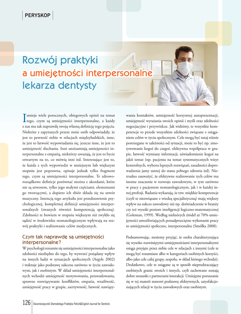 PERYSKOP Rozwój praktyki a umiejętności interpersonalne lekarza dentysty I stnieje wiele potocznych, obiegowych opinii na temat tego, czym są umiejętności interpersonalne, a każdy z nas ma tak naprawdę swoją własną definicję tego pojęcia. Niektóre z zapytanych przeze mnie osób odpowiadały, że jest to pewność siebie w relacjach międzyludzkich, inne, że jest to łatwość wypowiadania się, jeszcze inne, że jest to umiejętność słuchania. Inni utożsamiają umiejętności interpersonalne z empatią, niektórzy uważają, że jest to bycie otwartym na to, co mówią inni itd. Interesujące jest to, że każda z tych wypowiedzi w mniejszym lub większym stopniu jest poprawna, opisuje jednak tylko fragment tego, czym są umiejętności interpersonalne. Te zdroworozsądkowe definicje porównać można z akordami, które nie są utworem, tylko jego małymi częściami, elementami go tworzącymi, a dopiero ich zbiór składa się na utwór muzyczny. Intencją tego artykułu jest przedstawienie psychologicznej, kompletnej definicji umiejętności interpersonalnych (zwanych również kompetencją społeczną). Zdolności te bowiem w stopniu większym niż zwykło się sądzić w środowisku stomatologicznym wpływają na rozwój praktyki i realizowanie celów medycznych. wania kontaktów, umiejętność korzystnej autoprezentacji, umiejętność wyrażania swoich opinii i myśli oraz zdolności negocjacyjne i przywódcze. Jak widzimy, te wszystkie kompetencje to przede wszystkim zdolności związane z osiąganiem celów w życiu społecznym. Cele mogą być tutaj różnie postrzegane w zależności od sytuacji, może to być np. zmotywowanie kogoś do czegoś, efektywna współpraca w grupie, łatwość wymiany informacji, uświadomienie kogoś na jakiś temat (np. pacjenta na temat systematycznych wizyt kontrolnych, wyboru lepszych rozwiązań, zasadności doprowadzenia jamy ustnej do stanu pełnego zdrowia itd). Nietrudno zauważyć, że efektywne realizowanie tych celów ma istotne znaczenie w rozwoju zawodowym, w tym zarówno w pracy z pacjentem stomatologicznym, jak i w każdej innej profesji. Badania wykazują, że tzw. miękkie kompetencje (czyli te niezwiązane z wiedzą specjalistyczną) mają większy wpływ na sukces zawodowy niż np. doświadczenie w branży czy też wysoki poziom inteligencji logiczno-matematycznej (Goleman, 1999). Według niektórych źródeł aż 70% umiejętności umożliwiających ponadprzeciętne wykonanie pracy to umiejętności społeczne, interpersonalne (Smółka 2008). Czym tak naprawdę są umiejętności interpersonalne? Podsumowując, możemy przyjąć, że osoba charakteryzująca się wysoko rozwiniętymi umiejętnościami interpersonalnymi osiąga przyjęte przez siebie cele w relacjach z innymi (cele te mogą być rozumiane albo w kategoriach osobistych korzyści, albo jako cele całej grupy, zespołu, w skład którego wchodzi). Dodatkowo, cele te osiągane są w sposób nieprzekraczający osobistych granic swoich i innych, czyli zachowane zostają dobre stosunki z partnerami interakcji. Umiejętne poruszanie się w tej materii stanowi podstawę efektywnych, satysfakcjonujących relacji w życiu zawodowych oraz osobistym. W psychologii rozumie się umiejętności interpersonalne jako zdolności niezbędne do tego, by wywrzeć pożądany wpływ na innych ludzi w sytuacjach społecznych (Argyle 2002) i traktuje jako podstawę sukcesu zarówno w życiu zawodowym, jak i osobistym. W skład umiejętności interpersonalnych wchodzi umiejętność motywowania, perswadowania, sprawne rozwiązywanie konfliktów, empatia, wrażliwość, umiejętność pracy w grupie, asertywność, łatwość nawiązy- 126 Dwumiesięcznik Stomatologa Praktyka Polish&English Journal for Dentists Mariusz Oboda Większość ludzi jest przekonana o wysokim stopniu opanowania przez siebie tych kompetencji. Wynika to z trzech głównych czynników: faktu, że zbiór umiejętności interpersonalnych jest bardzo szeroki, trudności w określeniu i zmierzeniu poziomu opanowania poszczególnych kompetencji oraz naturalnej ludzkiej tendencji do ochrony maksymalnie wysokiej samooceny. Badania jednak nie potwierdzają tak optymistycznych założeń większości osób – wyniki pokazują, że pod względem niektórych kompetencji interpersonalnych można zauważyć znaczny deficyt aż u 50% populacji, a i pozostała część nie osiągnęła pod tym względem swojego maksimum (Smółka 2008). Deficyty te stanowią tzw. wąskie gardło, które nie pozwala na efektywne wykorzystanie wiedzy fachowej. Dobrą wiadomością jest jednak to, że mimo tego, że kompetencje społeczne są uwarunkowane cechami osobowości można nad nimi pracować i je rozwijać – albo przy pomocy tzw. treningu społecznego, czyli tak naprawdę uczenia się na własnych błędach, albo w wyniku udziału w praktycznych szkoleniach (Argyle 2002). Znaczenie umiejętności interpersonalnych w stomatologii Z perspektywy przedstawionego powyżej rozumienia umiejętności interpersonalnych, ich roli i znaczenia, zastanówmy się nad przyczynami bardzo różnych odpowiedzi, jakie padają na niżej wymienione pytania: •Ilu Państwa pacjentów decyduje się na pełną diagnostykę jamy ustnej? •Ilu Państwa pacjentów decyduje się na kompleksowy plan leczenia? • Ilu z nich doprowadza leczenie do końca? • Ilu pacjentów wybiera takie rozwiązania, jakie według Państwa powinni wybrać? • Ilu pacjentom w ciągu ostatnich 2 miesięcy pogratulowali Państwo zakończenia leczenia? •Ilu pacjentów przychodzi na systematyczne wizyty kontrolne? Z badań własnych Omd wynika, że zdecydowana większość pytanych lekarzy nie jest zadowolona z uzyskiwanych wyników w obszarach wskazanych przez powyższe pytania. Część z nich, zamiast szukać przyczyn w sobie, radzi sobie z tą niewygodną sytuacją poprzez bierną postawę, charakteryzującą się pewną dozą rezygnacji i sprowadzającą się